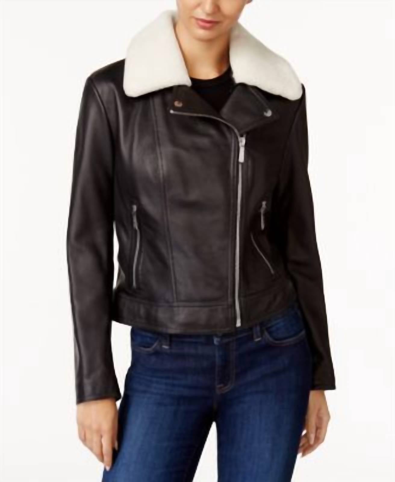 Edgy fashion moto leather jacket featuring a zip out shearling collar. 100% Genuine Leather. Zip front closure. Professional dry clean.