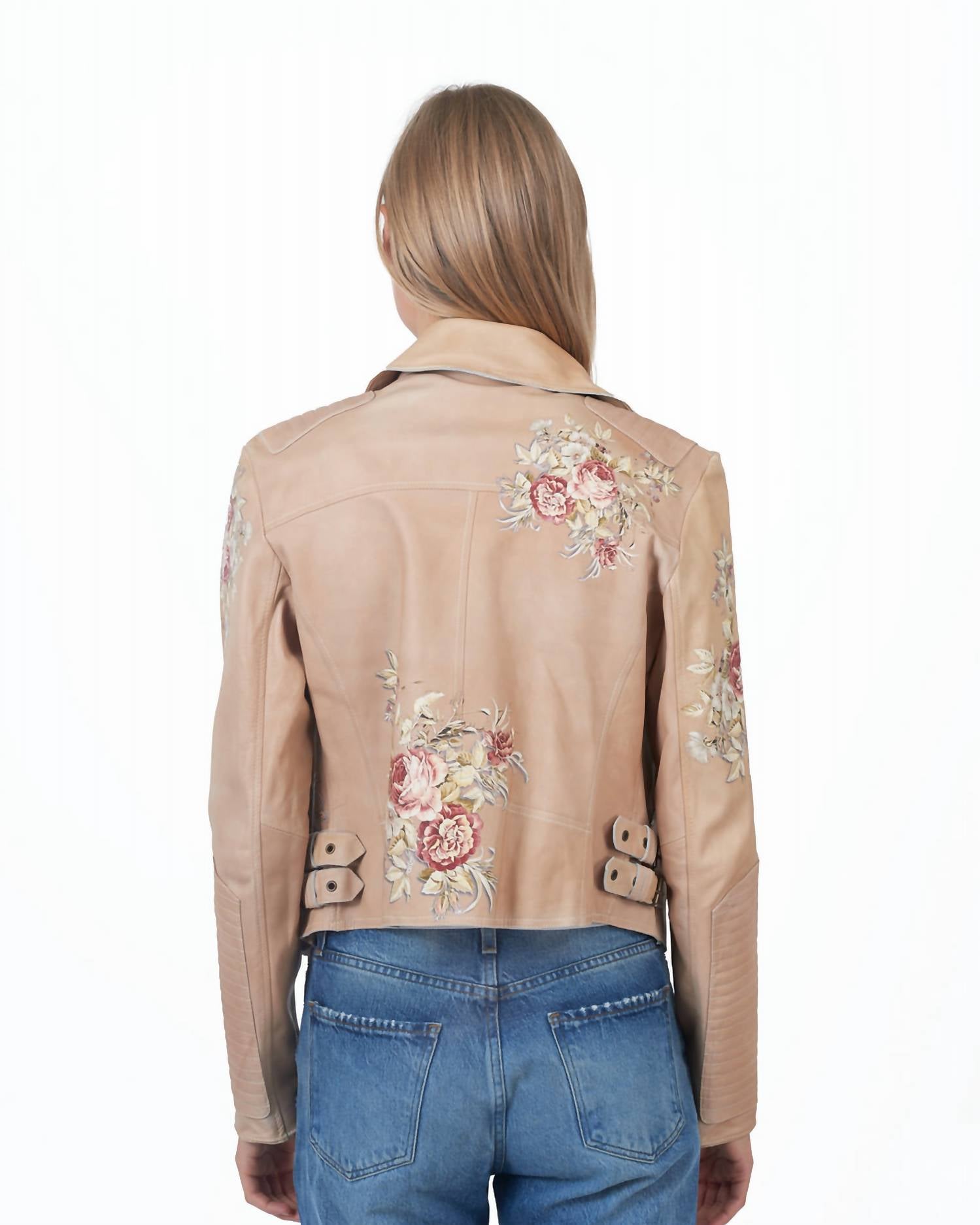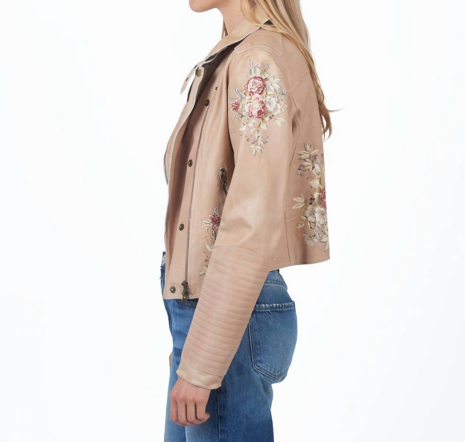 Add a luxe touch to any look with this timeless moto jacket featured in a gorgeous leather fabrication with femme floral printing throughout for an added special touch. Classic, moto-inspired design. Stud detailing, floral accents, ribbed piecing, zip-front closure.