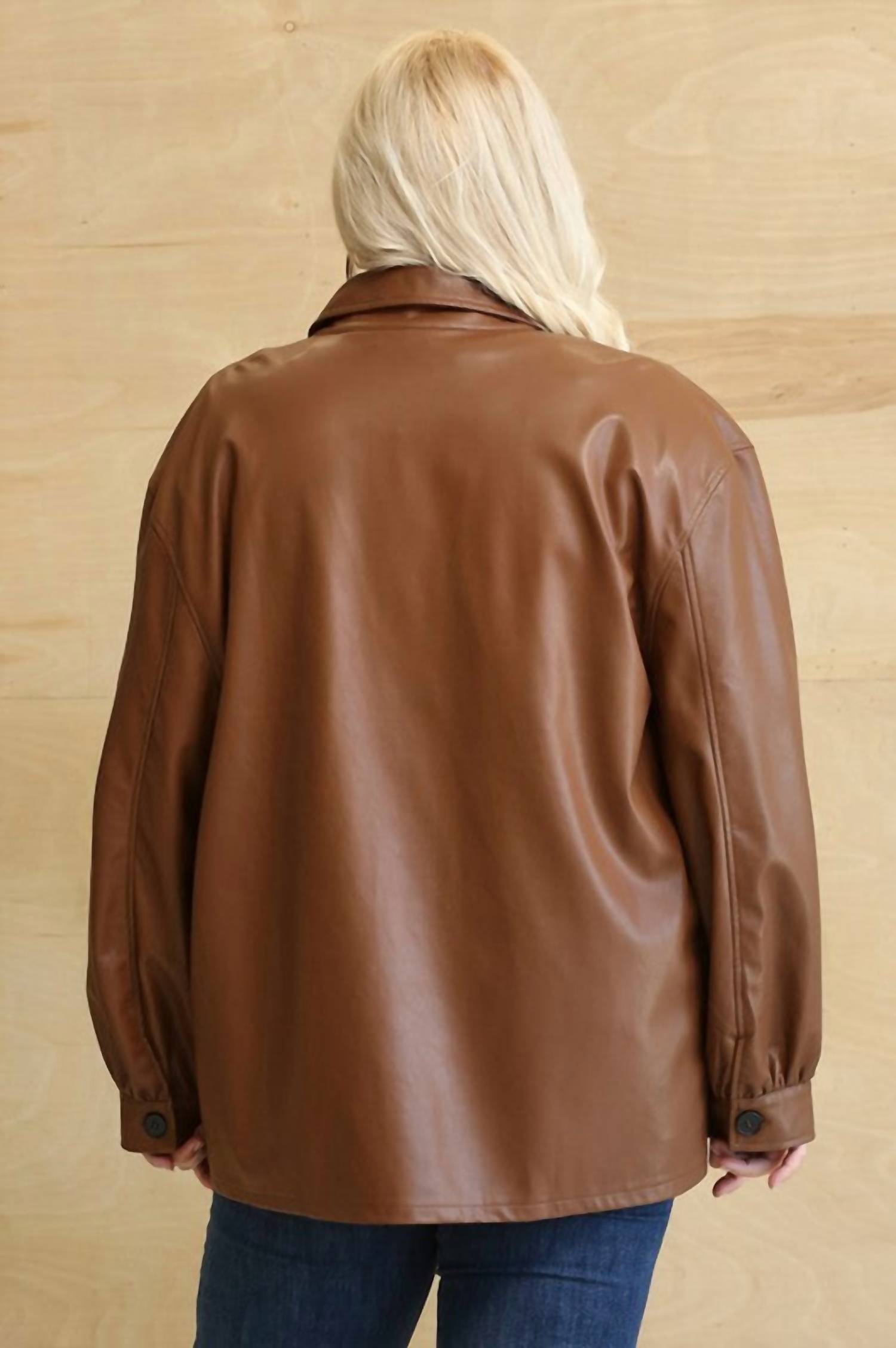 Everyone needs a leather jacket like this in their closet. Textured streetwear classic designed for the modern traveler in rich brown. Features long sleeves. Crafted from faux leather for a luxurious feel. With convenient side pockets and a button closure, perfect for fall adventures. Hand wash for lasting quality.