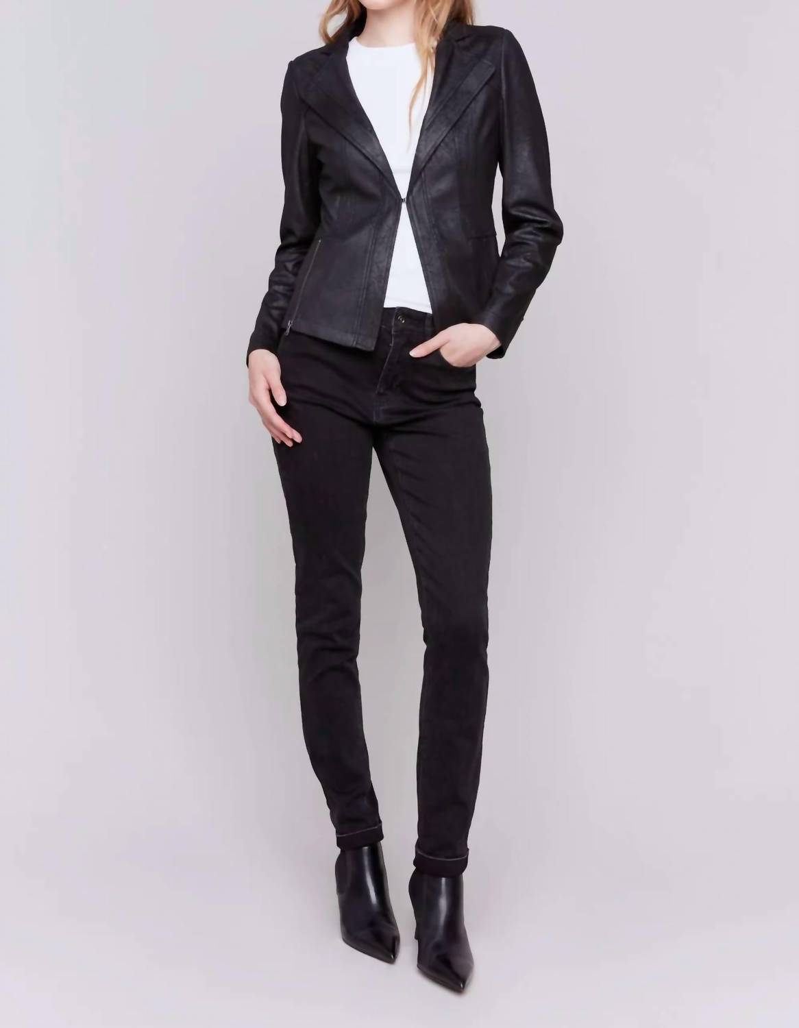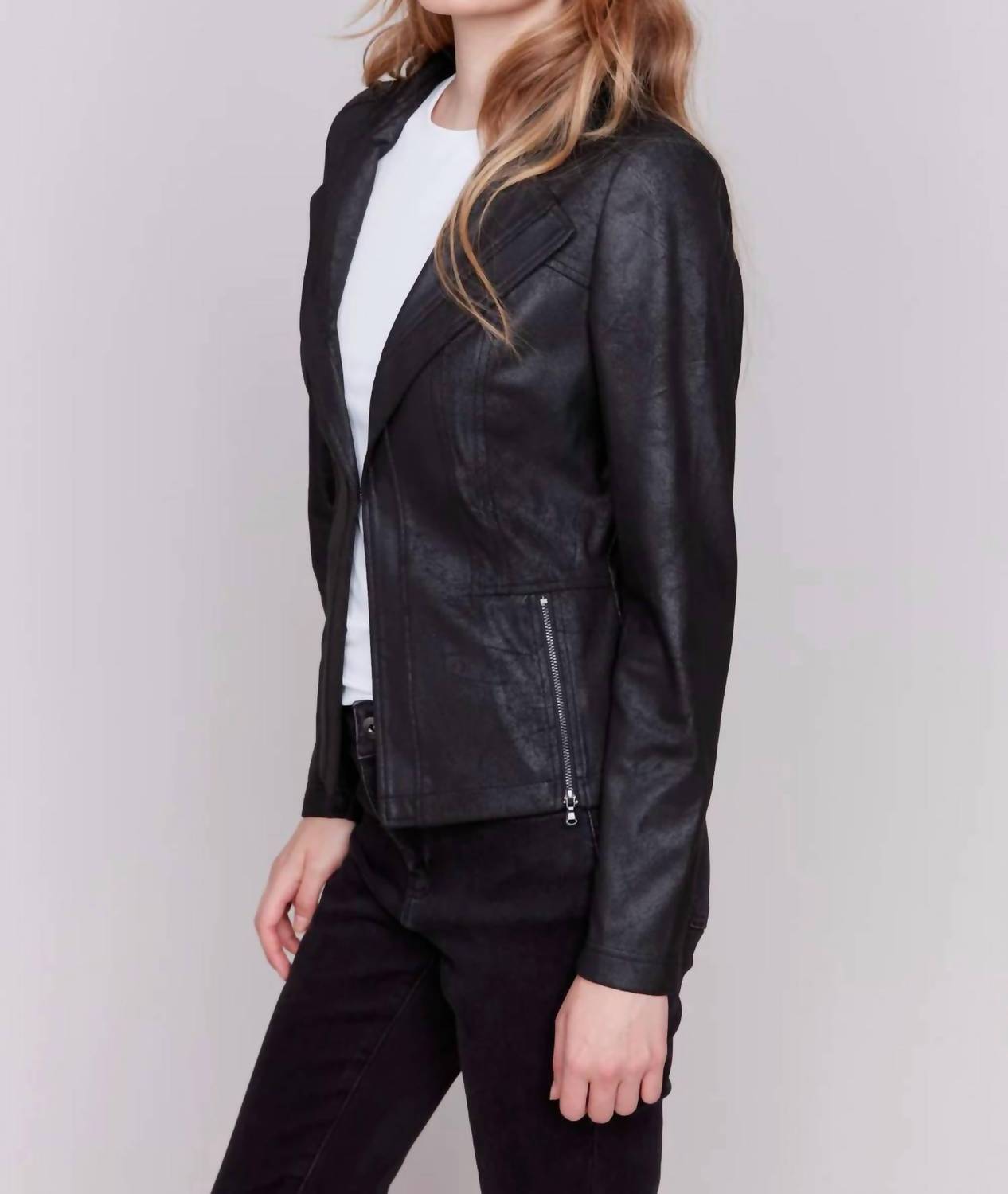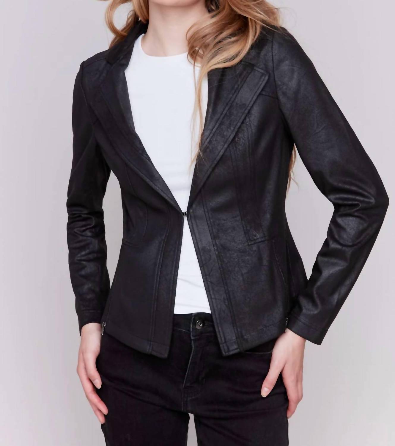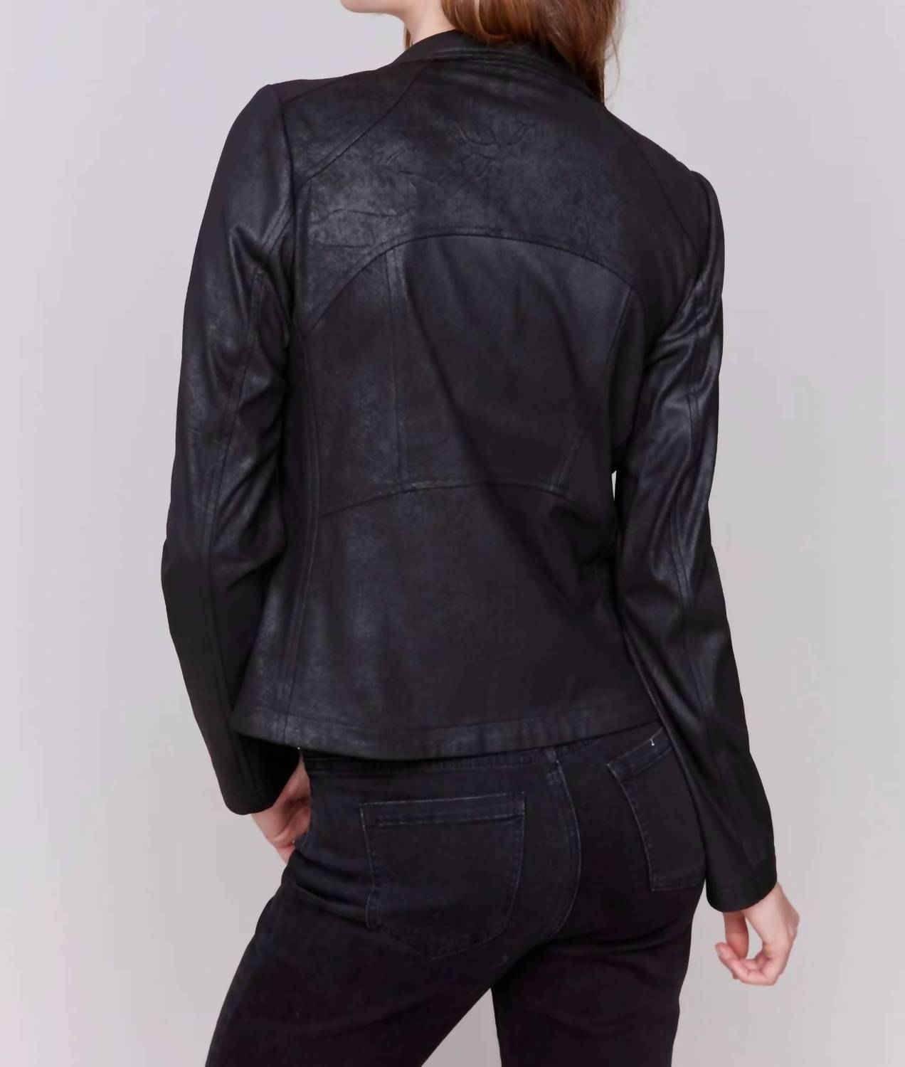 Everyone needs a leather jacket like this in their closet. Meet the Vintage Leather Jacket by Charlie B, a sophisticated addition to your wardrobe in sleek black. This women's jacket features a luxurious soft faux-suede texture, with long sleeves and a tailored fit for a polished look. Crafted from 92% Polyester and 8% Spandex, this 23" long piece boasts an open-front design for easy layering, complete with pockets for added convenience. Closure: Pull-on style. Care instructions include hand washing and laying flat to dry.