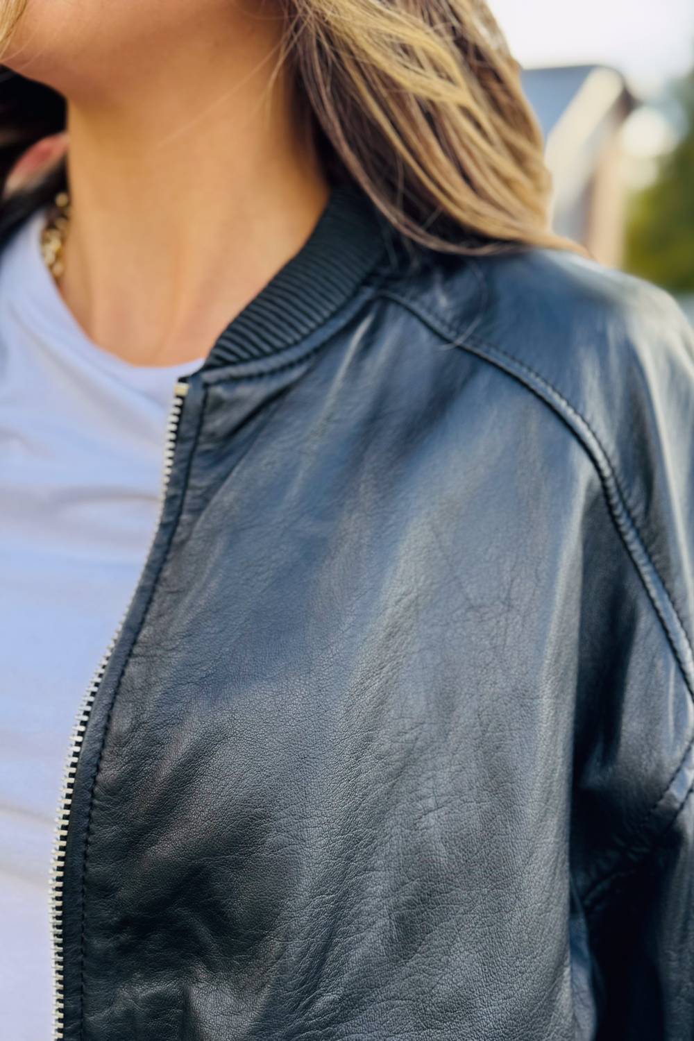 Soft leather, impeccable design. This leather jacket is a win-win. The Irka Leather Jacket by MAURITIUS is a stylish black bomber perfect for a concert-ready look. Crafted from 100% vegetable tanned lambskin leather, this long-sleeve piece features distressed seam details and convenient zipper pockets. Its solid pattern and crewneck design enhance its versatility, making it ideal for pairing with denim. Closure is ensured with a dependable zip closure.