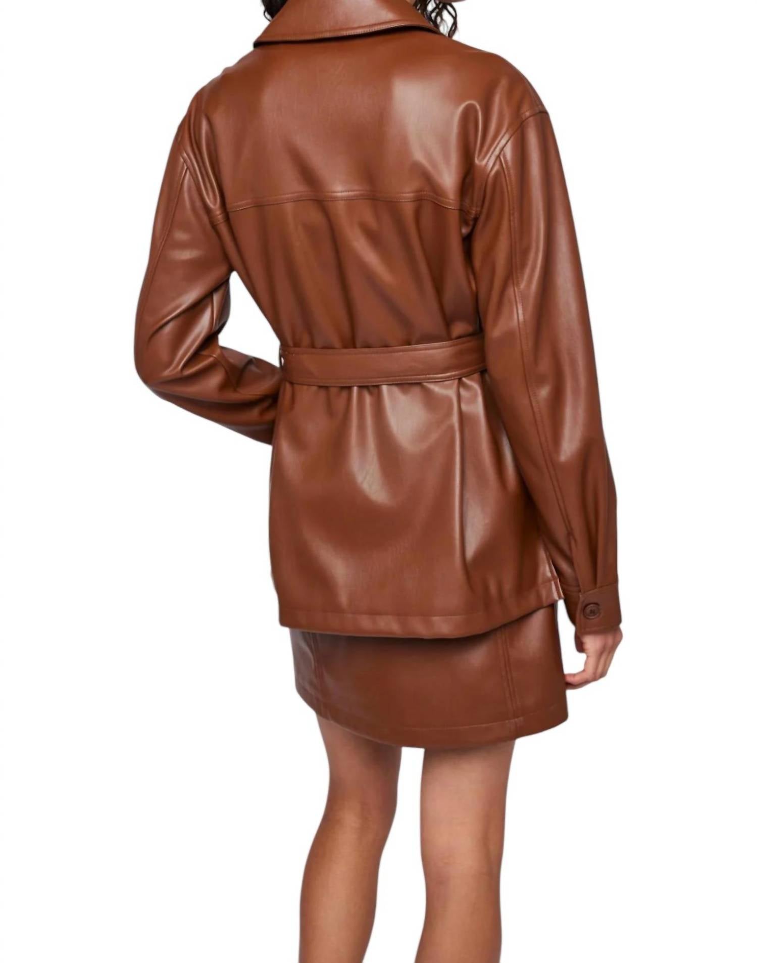 Stylish piece crafted for women who appreciate both form and function. Constructed from 100% polyurethane with a polyester lining. Faux leatherette jacket ensures a comfortable fit. Designed with a button closure and functional patch pockets. Includes side slits and a removable belt. For maintenance, simply hand wash cold and hang to dry.
