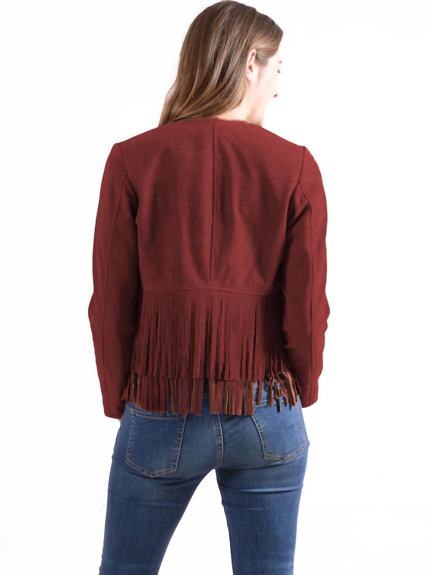 cropped fringe jacket, zip front,lined body and sleeve. flat bust size 40-19.5", length 26"