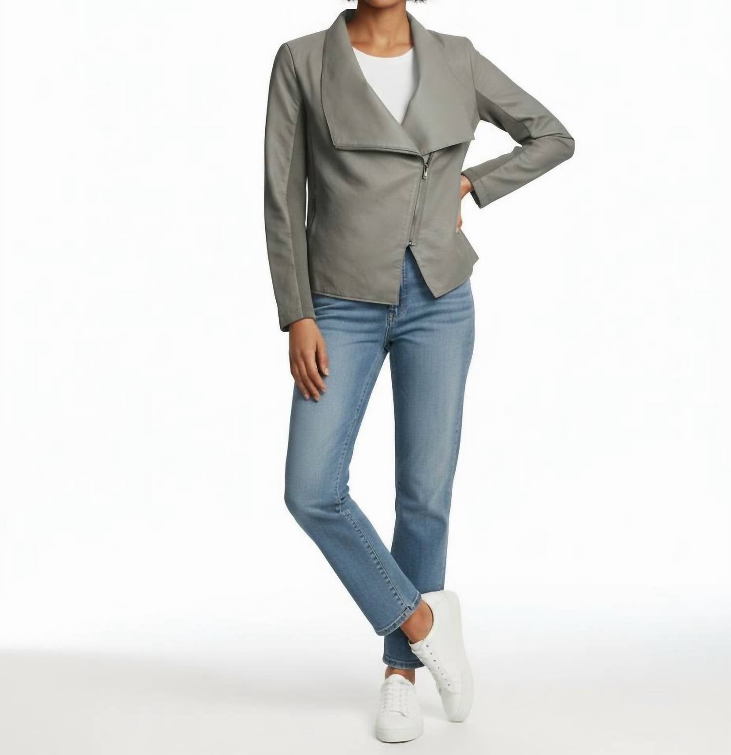 A leather jacket so good, it works with just about any outfit. Elevate your fall wardrobe with the BB Dakota Gabrielle Faux Leather Jacket in a versatile gray hue. This minimalist design boasts long sleeves with ribbed knit panels for added flexibility and comfort, along with an asymmetrical zip closure for an edgy touch. Made from faux leather, the jacket features oversized, draped lapels that offer a sophisticated neckline. Perfect for travel and seasonal gatherings like Thanksgiving, this solid-patterned piece seamlessly enhances both casual and polished ensembles.