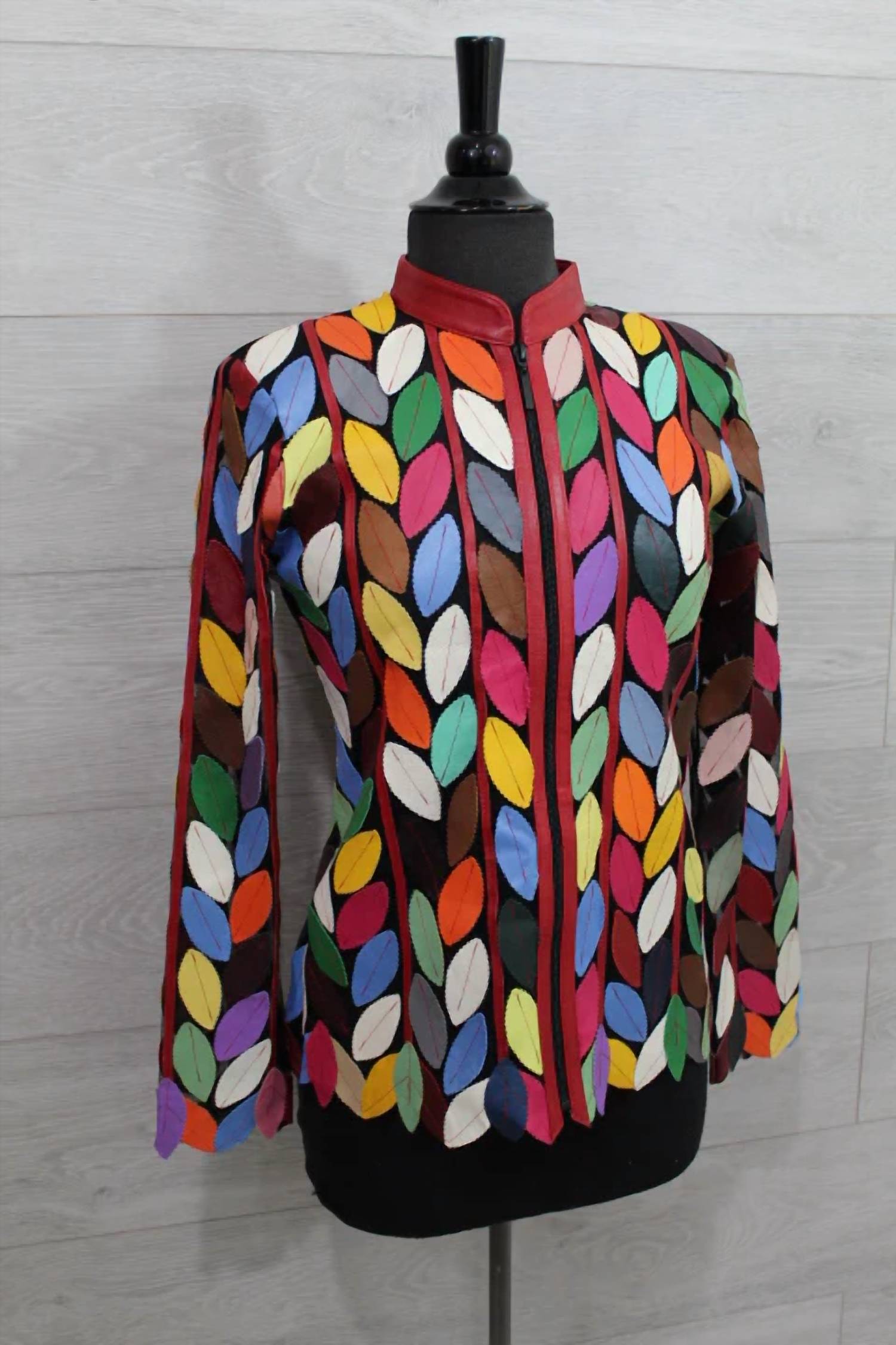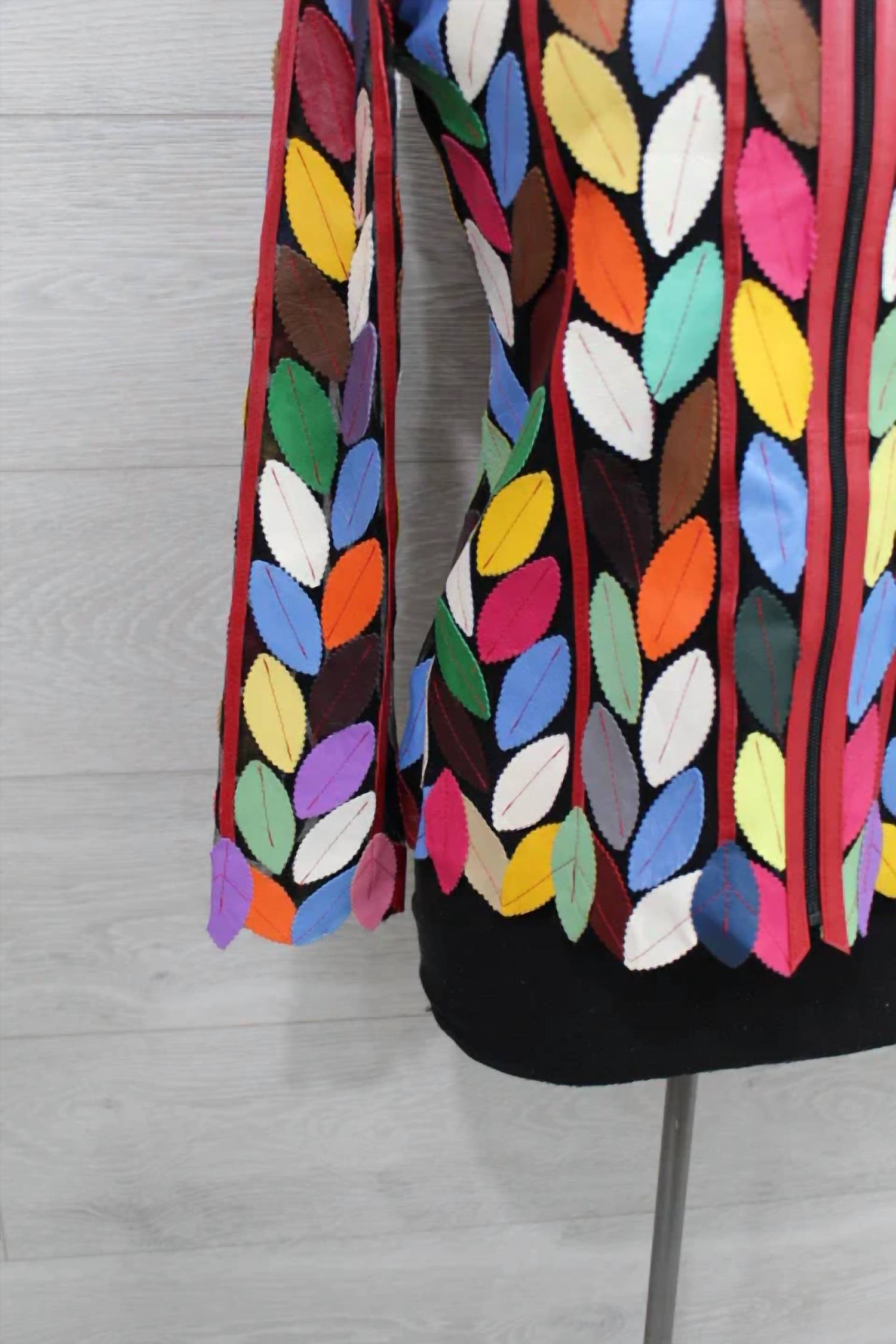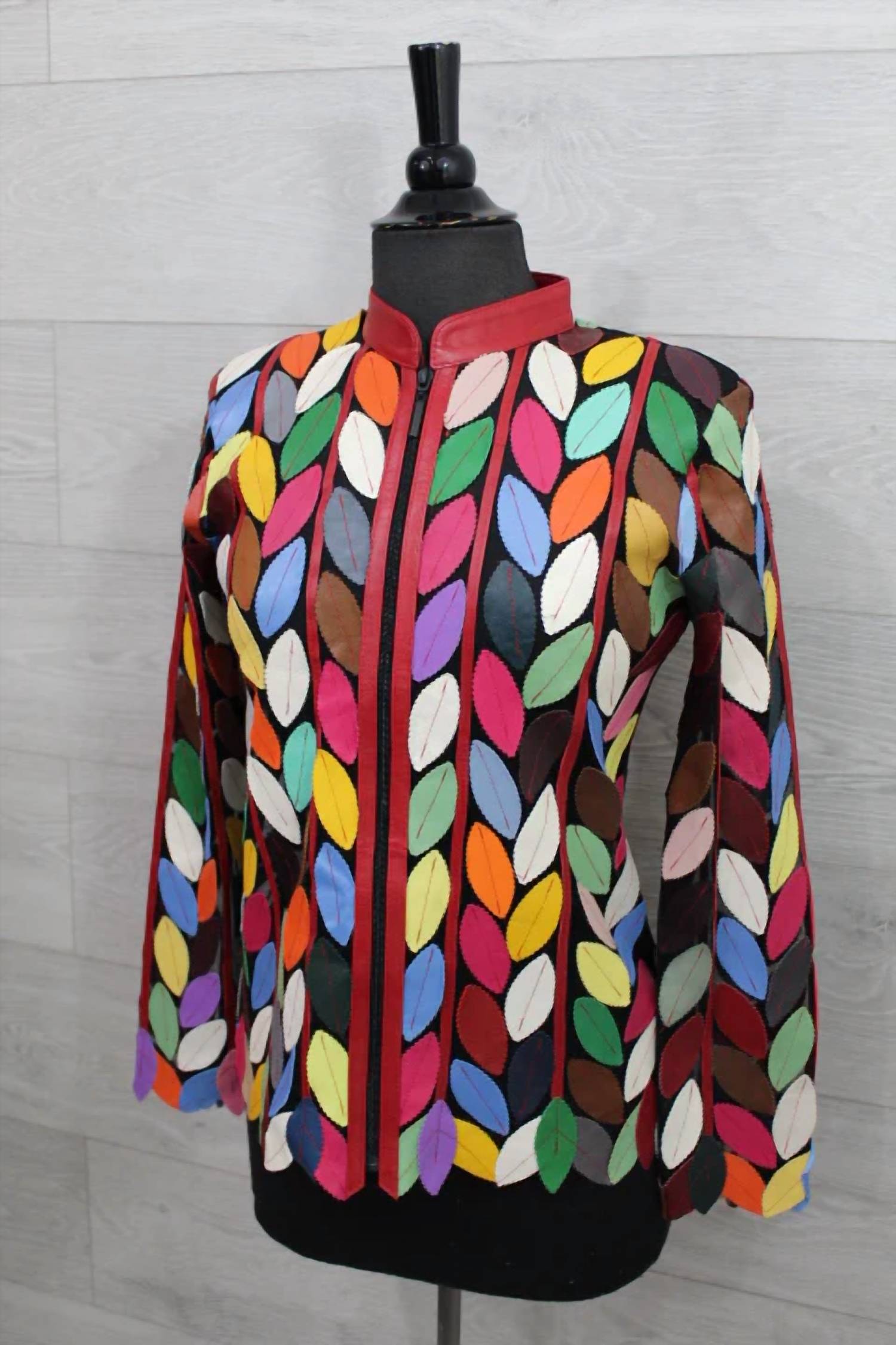 Everyone needs a leather jacket like this in their closet. Introducing the Women's Classic Leaf Design Leather Jacket by Belgin Francis, a statement piece crafted for evening events. This jacket features a striking multicolor leaf pattern on premium genuine lamb leather, offering a vintage-inspired aesthetic. With long sleeves and a stylish collar, it's designed with a convenient zip closure and a garment length of 24 inches. Originating from Turkey, it's tailored for the fall season and should be dry cleaned to maintain its exquisite quality.