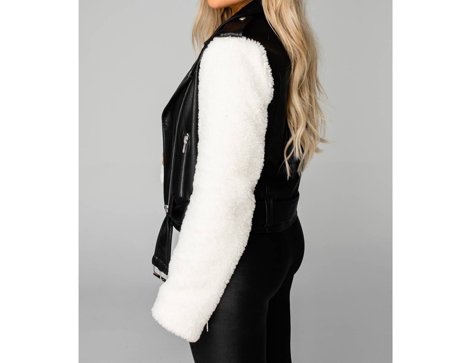 A leather jacket so good, it works with just about any outfit. Introducing the Quinn Vegan Leather Jacket by BUDDYLOVE, a chic addition to your fall wardrobe in versatile black. This women's jacket combines long shearling faux fur sleeves with a vegan leather bodice, perfect for adding a touch of flair to any outfit. Crafted from a blend of 50% Polyurethane and 50% Polyester, it features a convenient zip closure and two side pockets. Care for this piece with hand washing to maintain its stylish, patterned design.