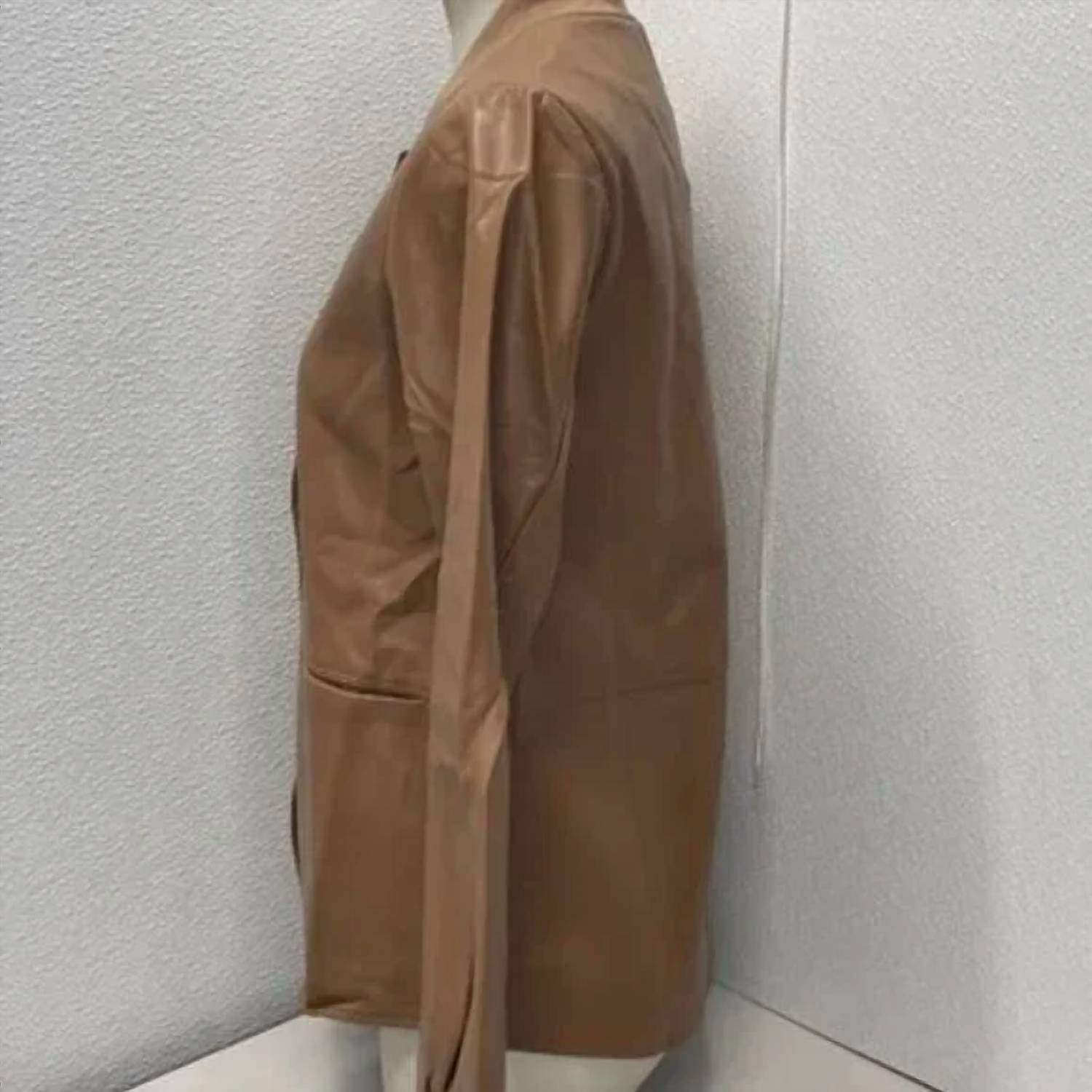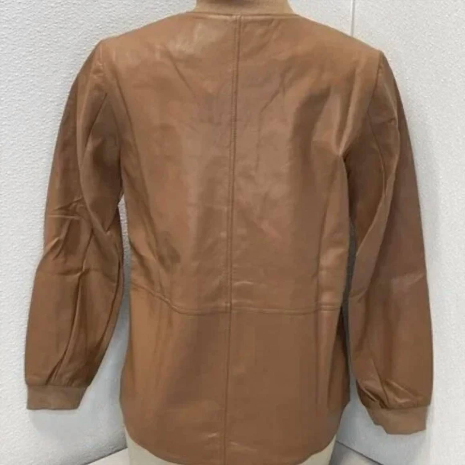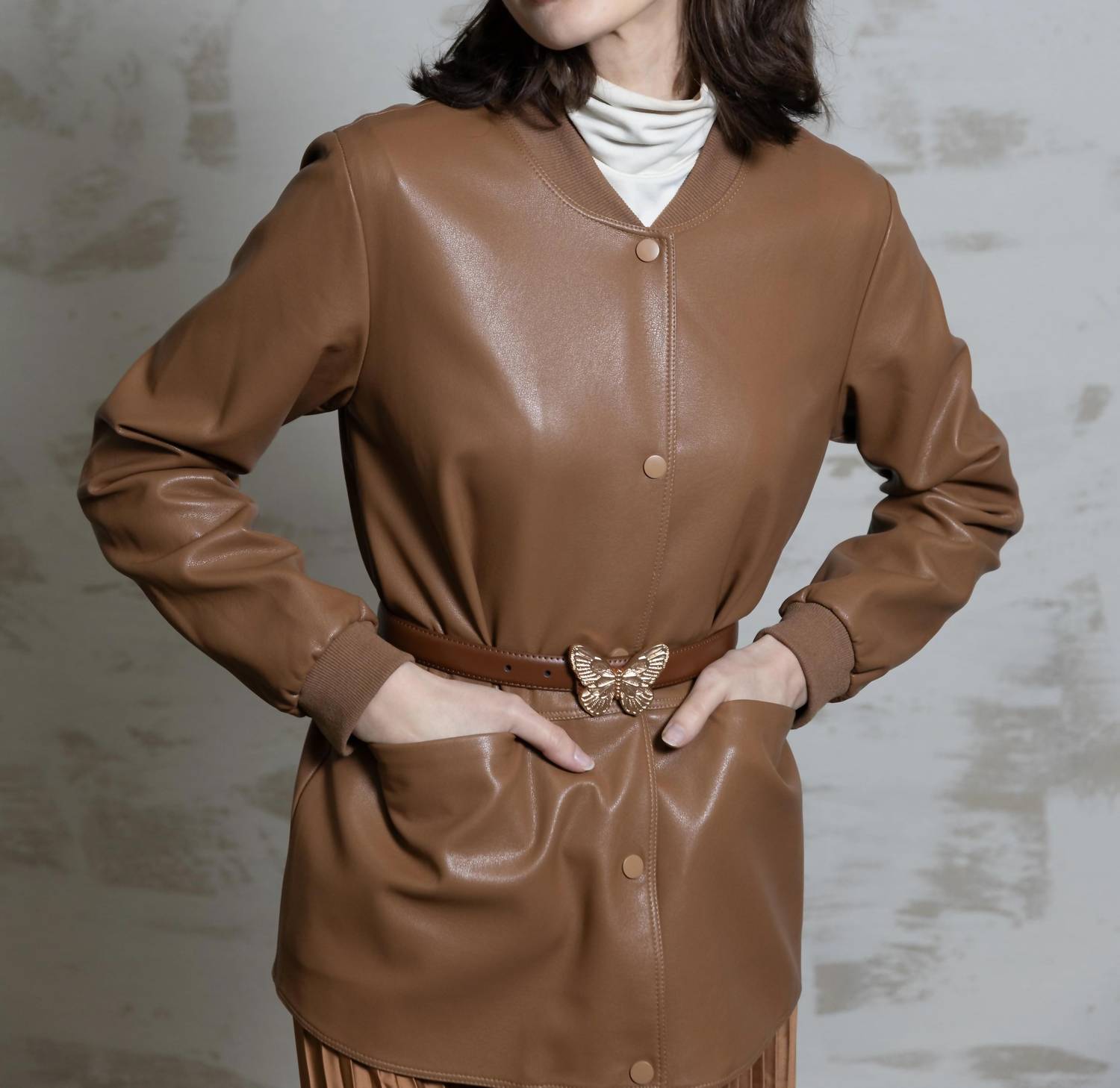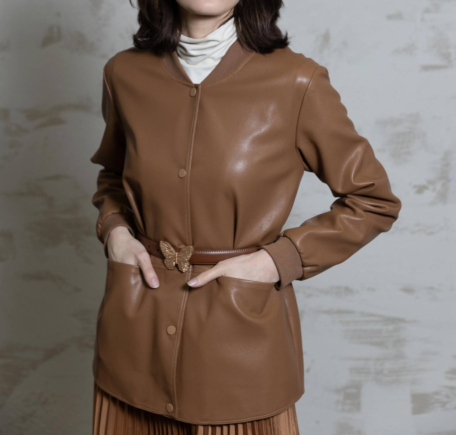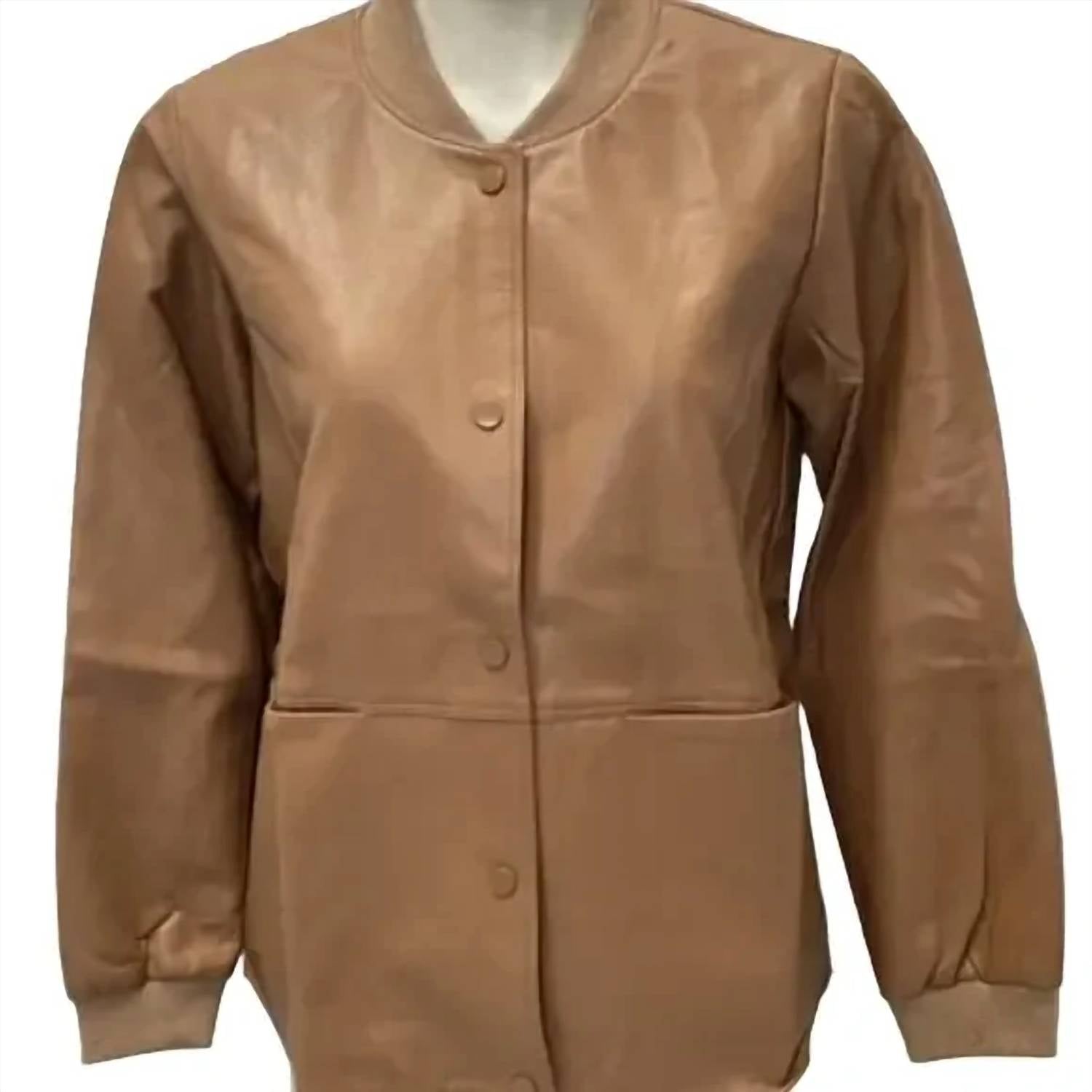 A leather jacket so good, it works with just about any outfit. Introducing the Sierra Varsity Jacket by BYRD, a perfect companion for fall evenings in a rich brown shade. This women's jacket features long sleeves and a stylish snap closure, crafted from 45% PU and 55% Cotton for a faux leather finish. Its design includes a ribbed crewneck, cuffs, and hem, with side pockets for practicality. Embrace the vintage trend in style with this solid pattern jacket ideal for an evening event.