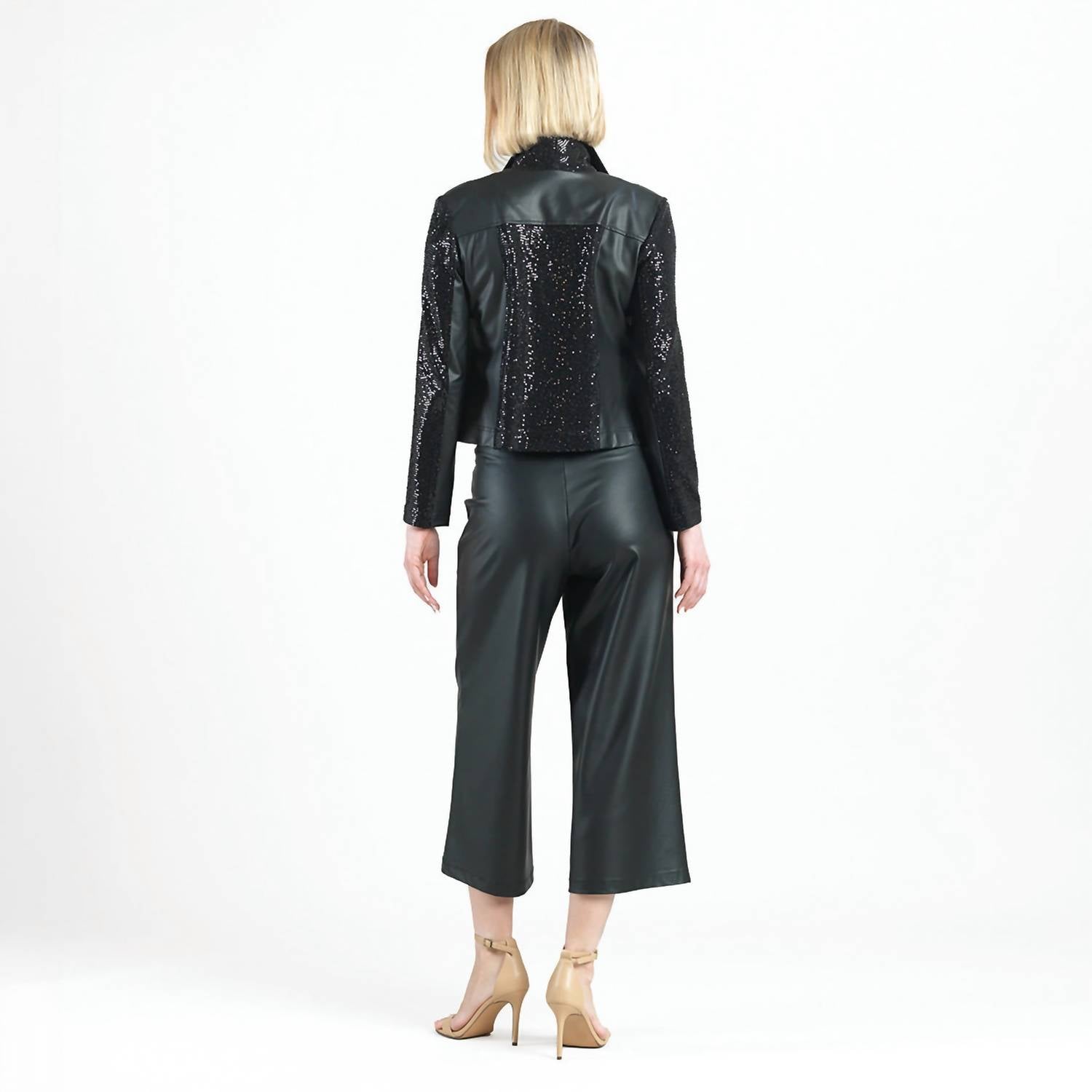 Soft leather, impeccable design. This leather jacket is a win-win. Introducing the Clara Sun Woo Sequin Knit Liquid Leather Sheen Moto Jacket, a striking choice for your holiday party ensemble. Crafted from a nylon blend, this women's jacket features long sleeves with a stunning two-tone finish combining soft-sheen liquid leather and dazzling sequin knit fabric. It boasts a classic fold-over collar, a stylish notched lapel with gunmetal snap corner accents, and a silver asymmetrical zip closure. Convenient side pockets enhance functionality, while its unique design adds an element of sparkle. To maintain its luxurious appeal, gently hand wash and line dry.