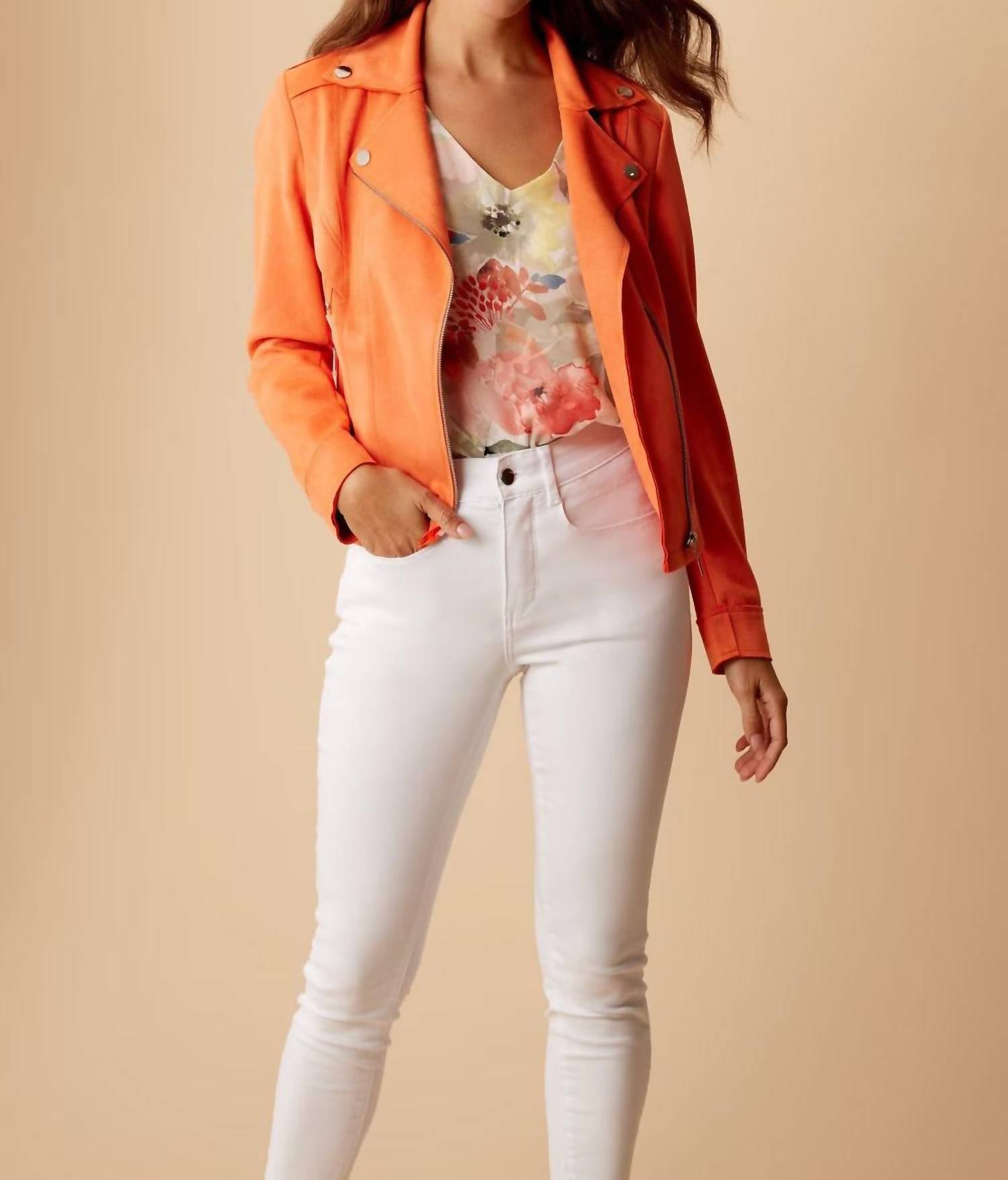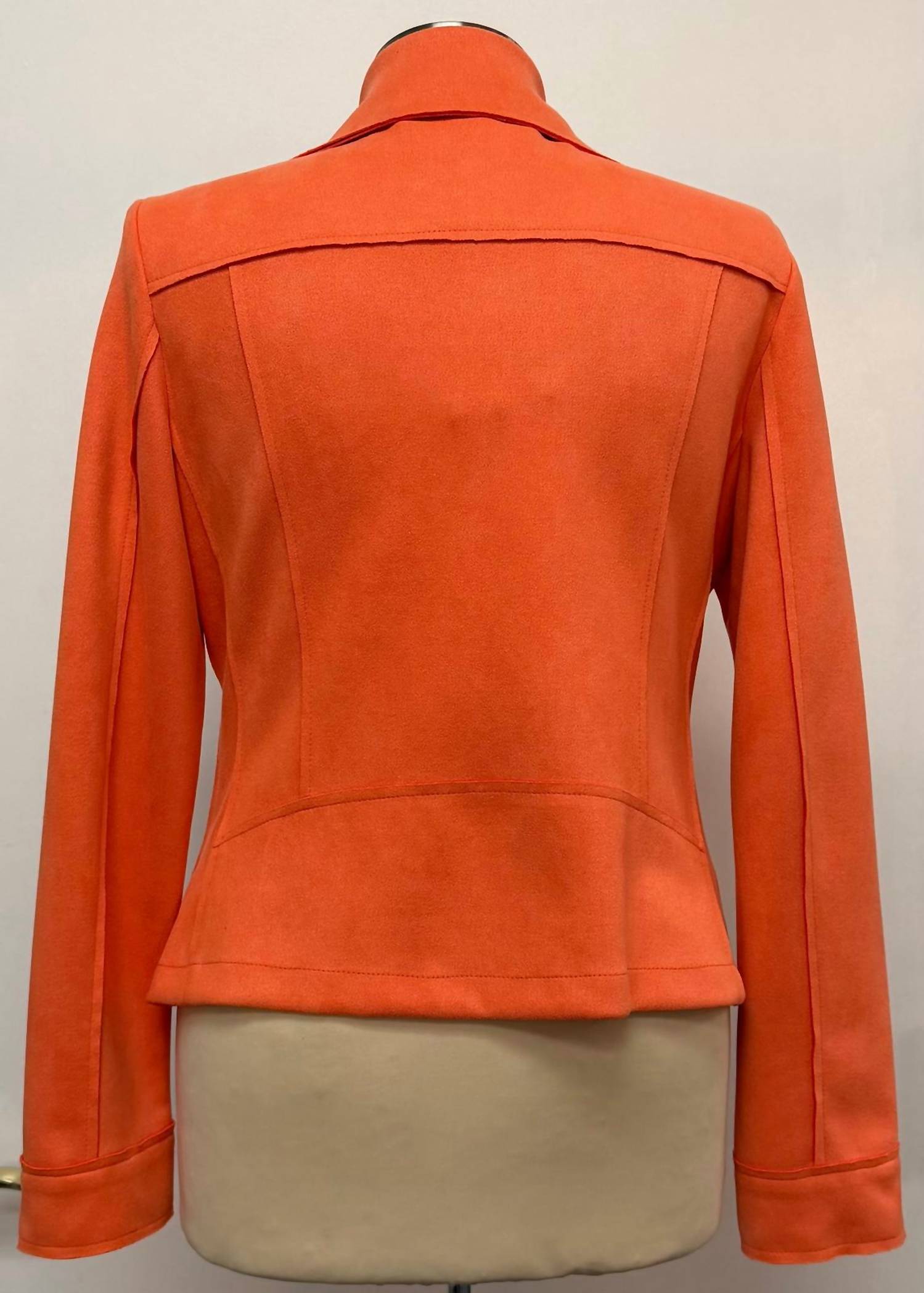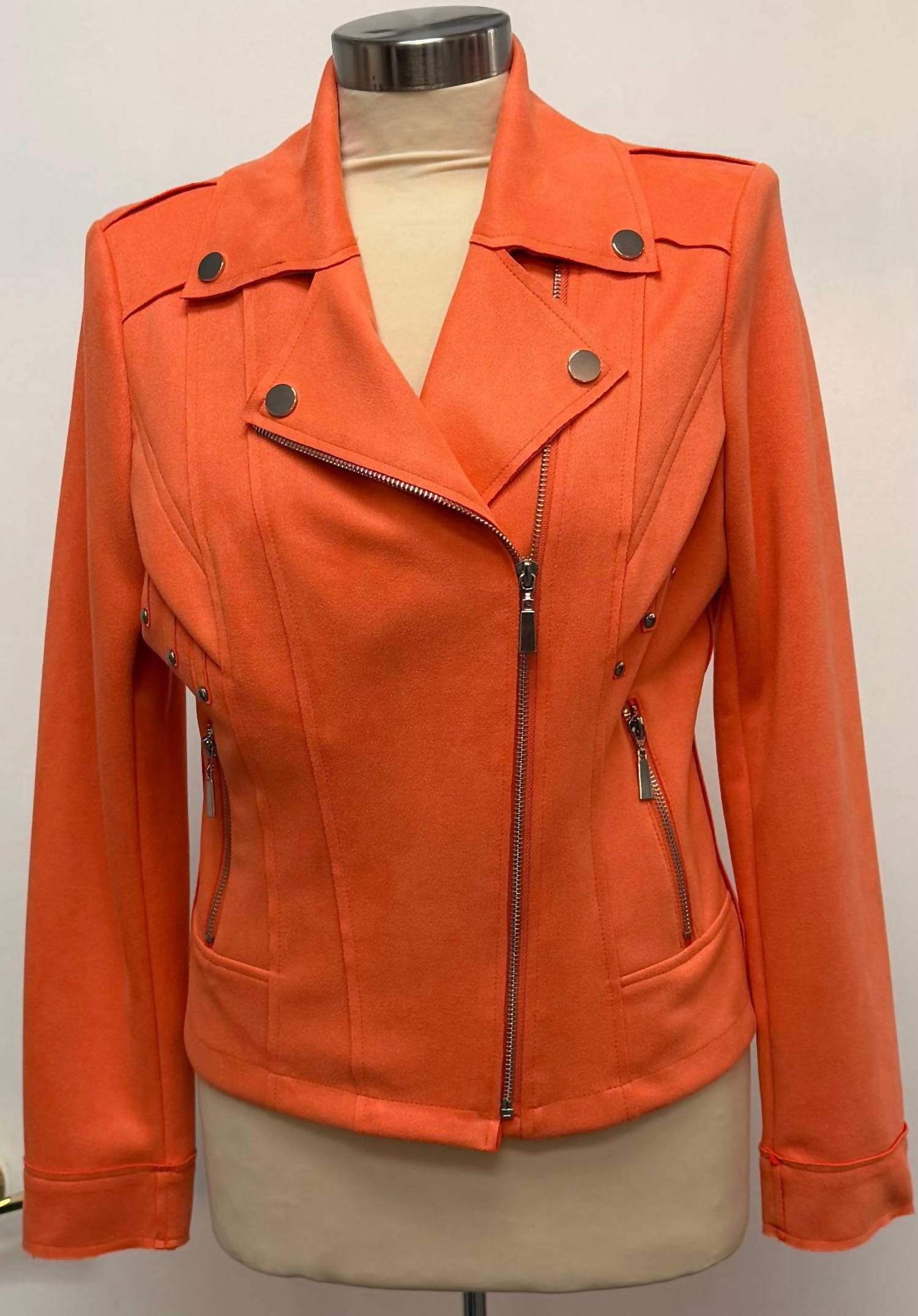 Soft leather, impeccable design. This leather jacket is a win-win. Meet the Frank Lyman Casual Waist-length Leather Jacket in bold orange, a minimalist masterpiece perfect for spring dinners and celebrations. This women's jacket offers a solid pattern with a classic collar and long sleeves, ensuring a chic yet comfortable fit. Crafted from 90% polyester and 10% elastane, it features a convenient zip closure and is best cared for via dry cleaning. Though it boasts pockets for added functionality, this unlined jacket epitomizes effortless style for any festive occasion.