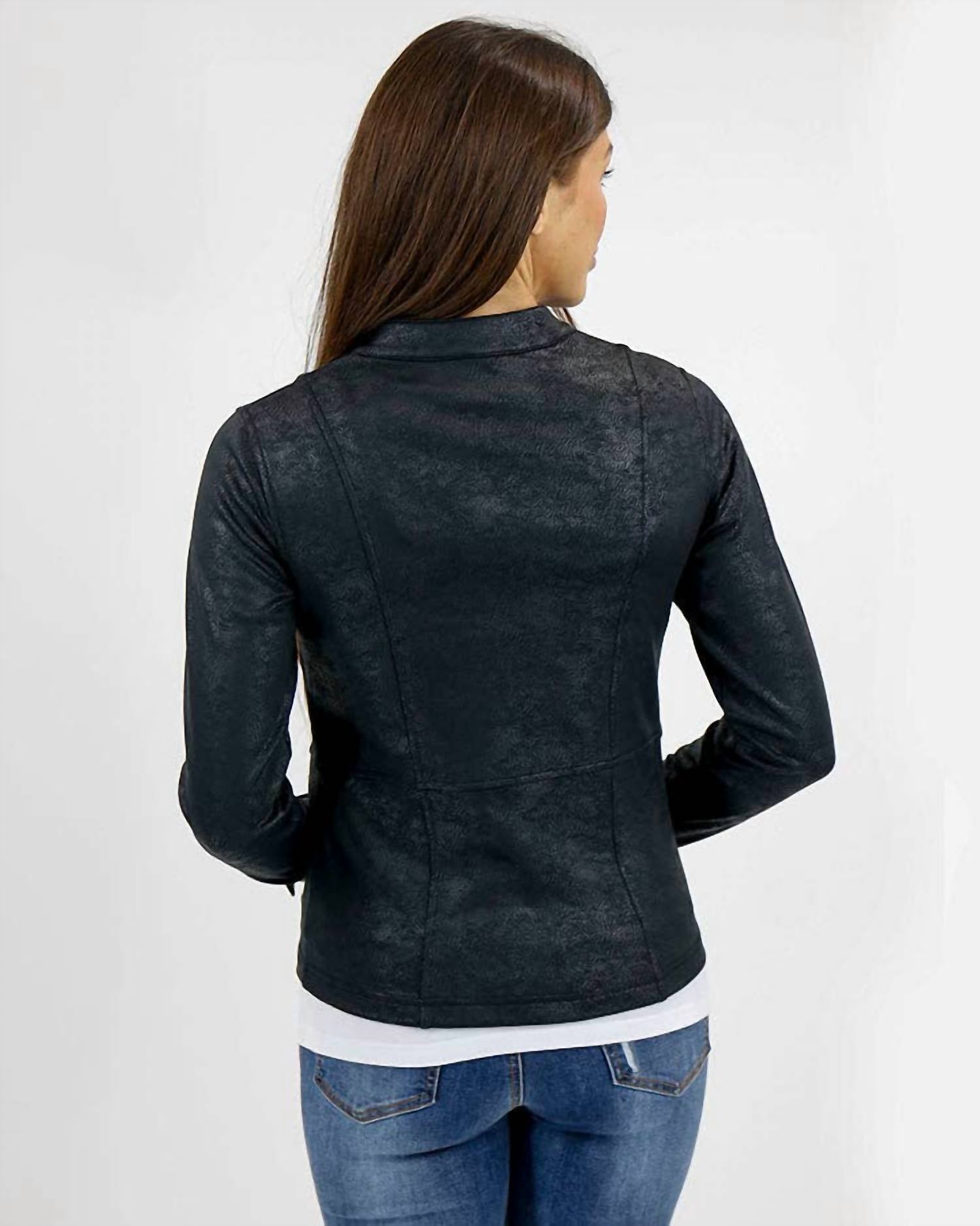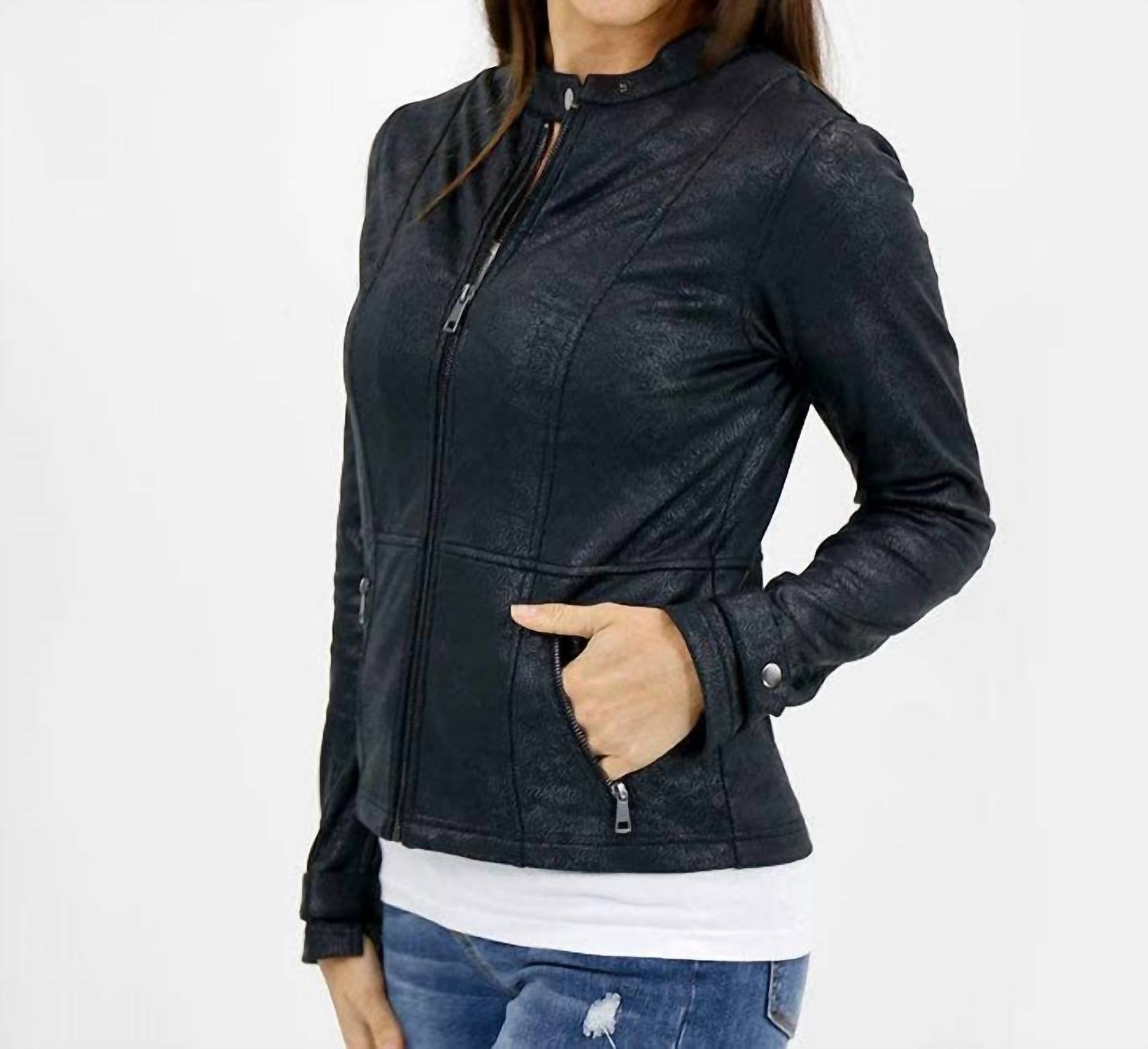 Everyone needs a leather jacket like this in their closet. Introducing the Leather Like Cafe Race Jacket by Grace and Lace, a chic and classic piece perfect for fall fashion. This women's jacket boasts long sleeves and a unique faux leather material that feels as comfortable as a stretchy hoodie. The design is completed with a solid black color and a practical zip closure. Ideal for layering, this versatile piece effortlessly enhances any outfit.