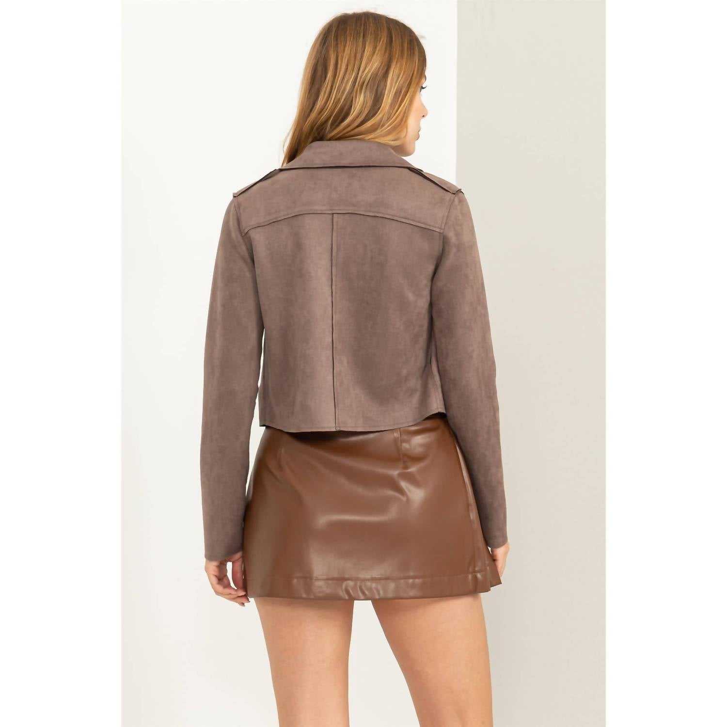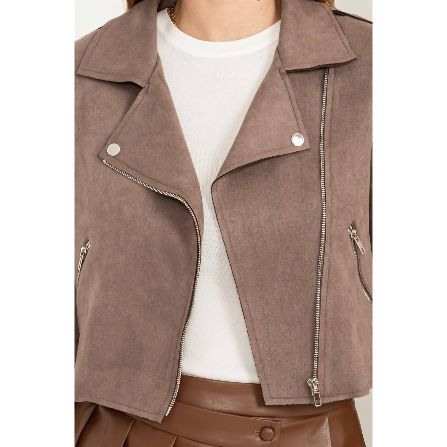 A leather jacket so good, it works with just about any outfit. Experience refined style with the HYFVE Faux Suede Moto Jacket, a perfect piece for your spring wardrobe. This textured leather jacket comes in a chic mushroom hue, featuring long sleeves and a collared neckline with notched lapels for a sophisticated edge. Crafted from a smooth blend of 95% polyester and 5% spandex, it includes a zipper-front bodice with metal hardware and a snap button fastening for versatile styling. Care information is not provided. Imported and designed in the USA, this jacket is ideal for any dinner party occasion. Model is wearing a size small and stands 5'9" with a 34C chest, 24" waist, and 35" hips.