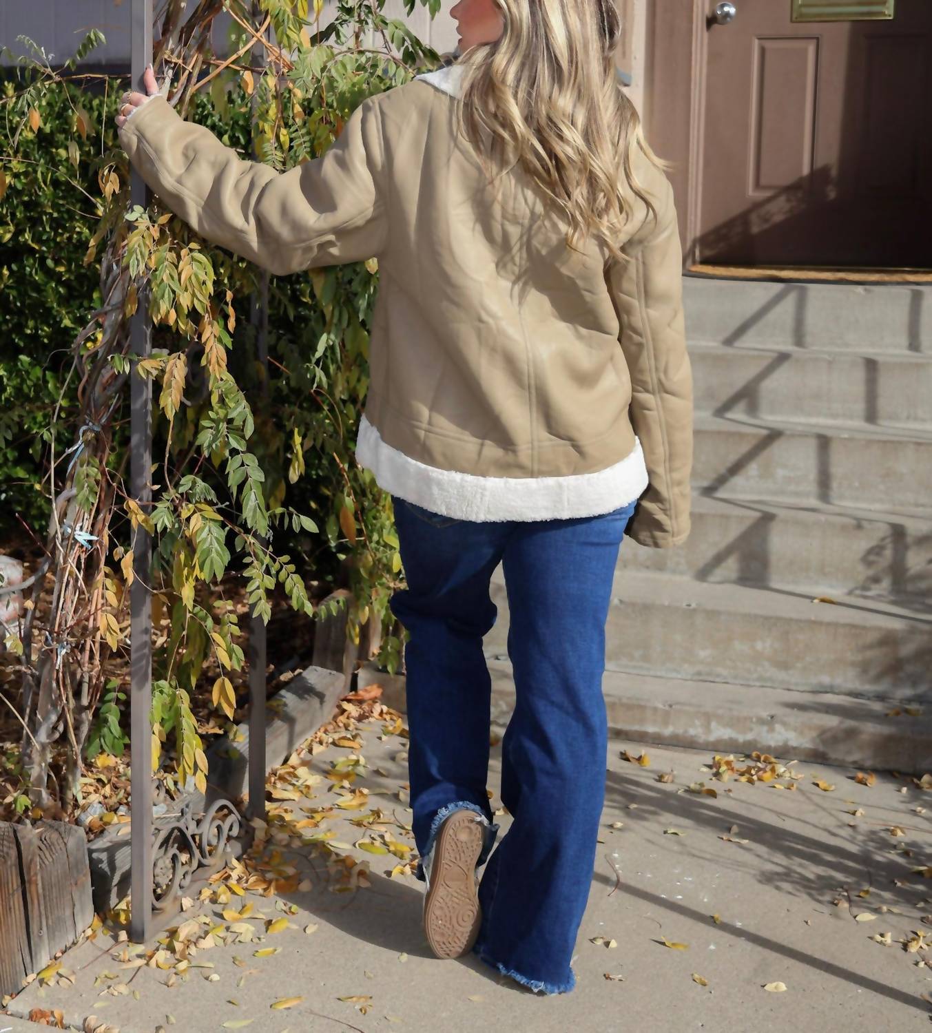 Soft leather, impeccable design. This leather jacket is a win-win. Introducing the Denmark Shearling Jacket by IN-LOOM in a stylish beige, perfect for elevating your fall wardrobe. This women's solid pattern jacket features long sleeves and a plush wide collar, crafted from a vegan faux-leather exterior with contrast shearling trim on the lapel, cuffs, and hem. The composition is 75% Polyester and 25% PU, while practical side pockets and a full front zipper closure enhance its functionality. Designed for travel and streetwear, this piece is best cared for with dry clean instructions.