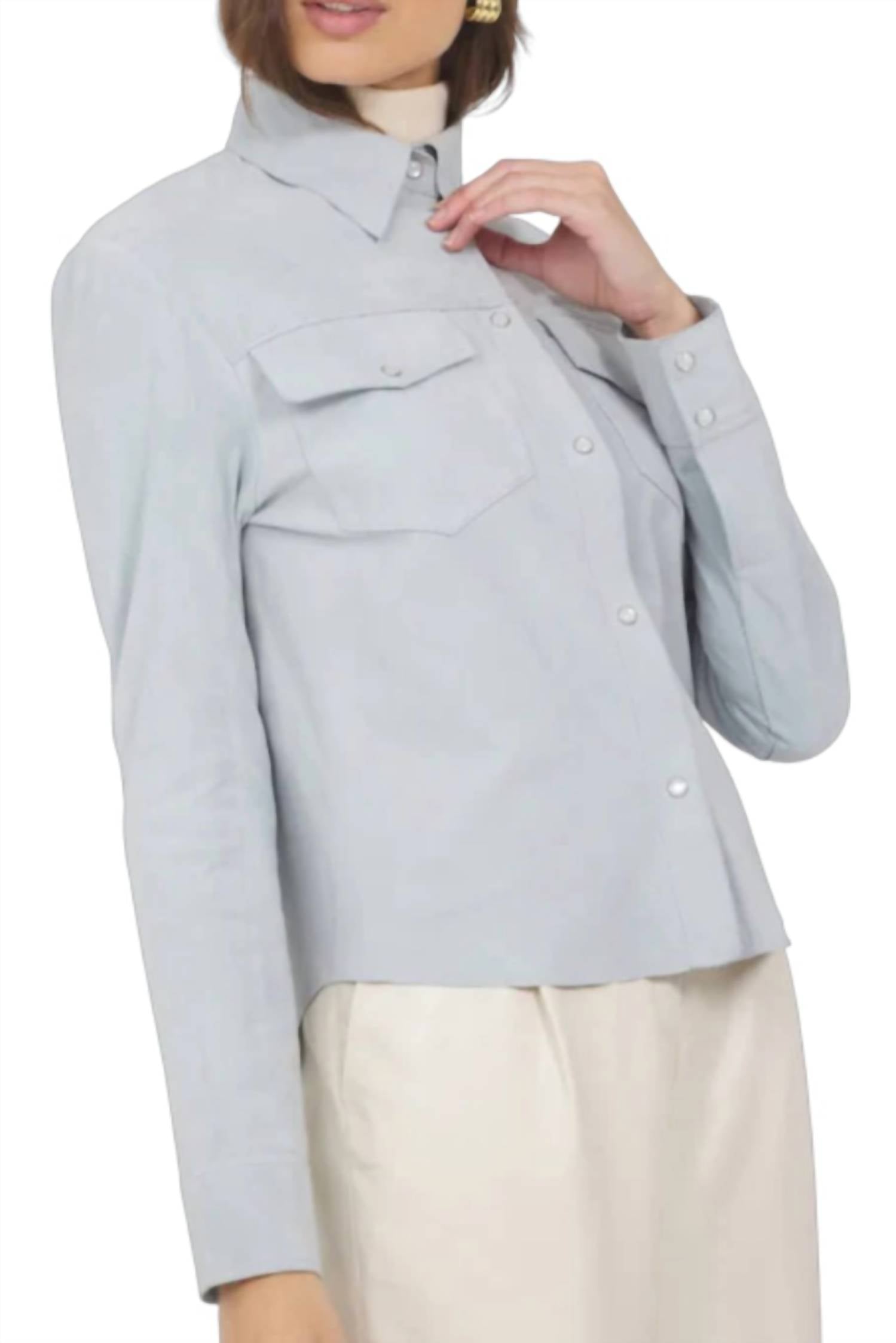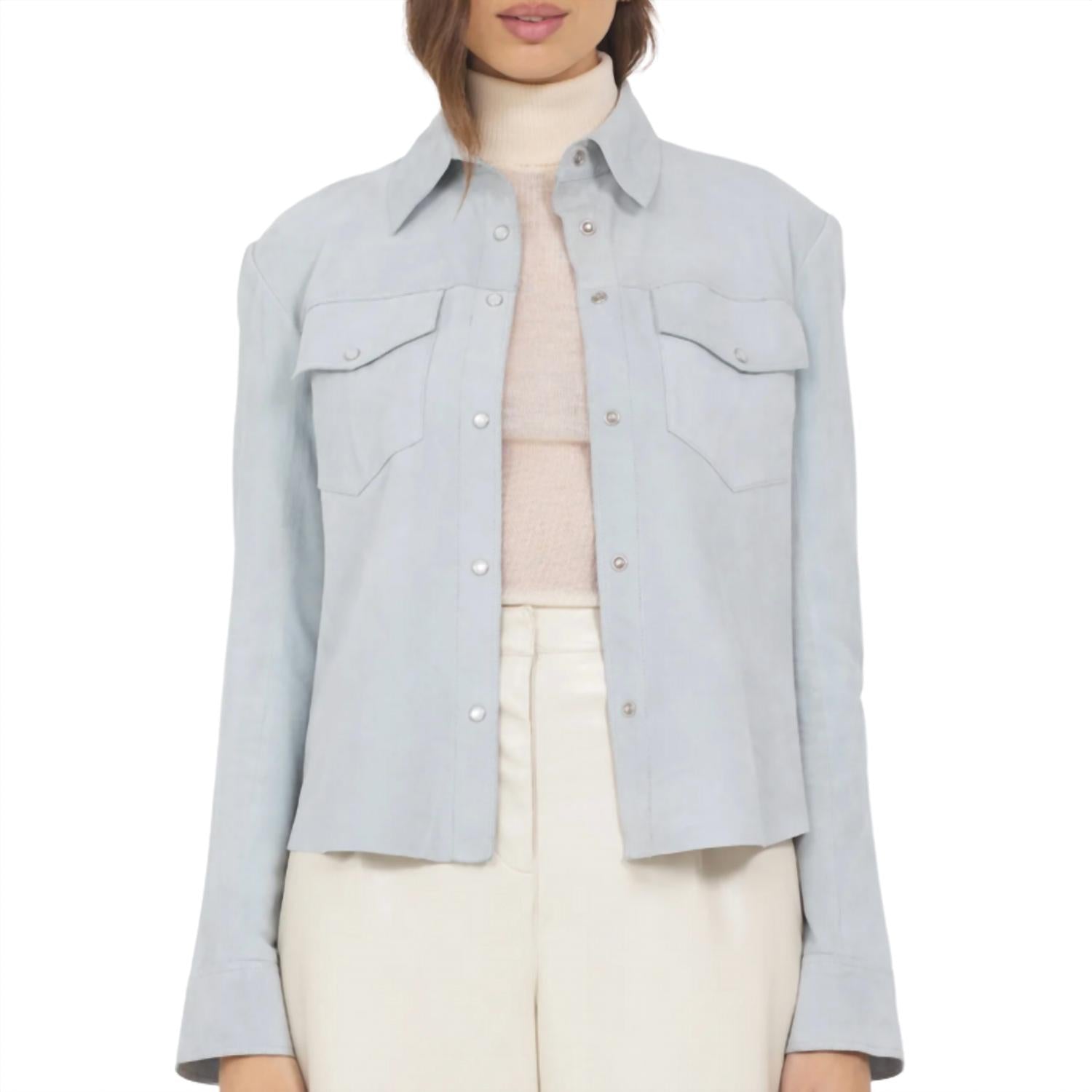 Everyone needs a leather jacket like this in their closet. Elevate your style with the Rowan Washed Suede Shacket by Jakett, a statement piece in a stunning Sky hue. This long-sleeved leather jacket features a collar neckline and solid pattern, embodying a perfect blend of rugged and refined. The design includes practical pockets and is secured with a snap closure, ensuring both style and functionality. Care for this maximalist trendsetter is easy, with machine wash instructions making it ideal for spring dinner parties or festive occasions like the 4th of July.