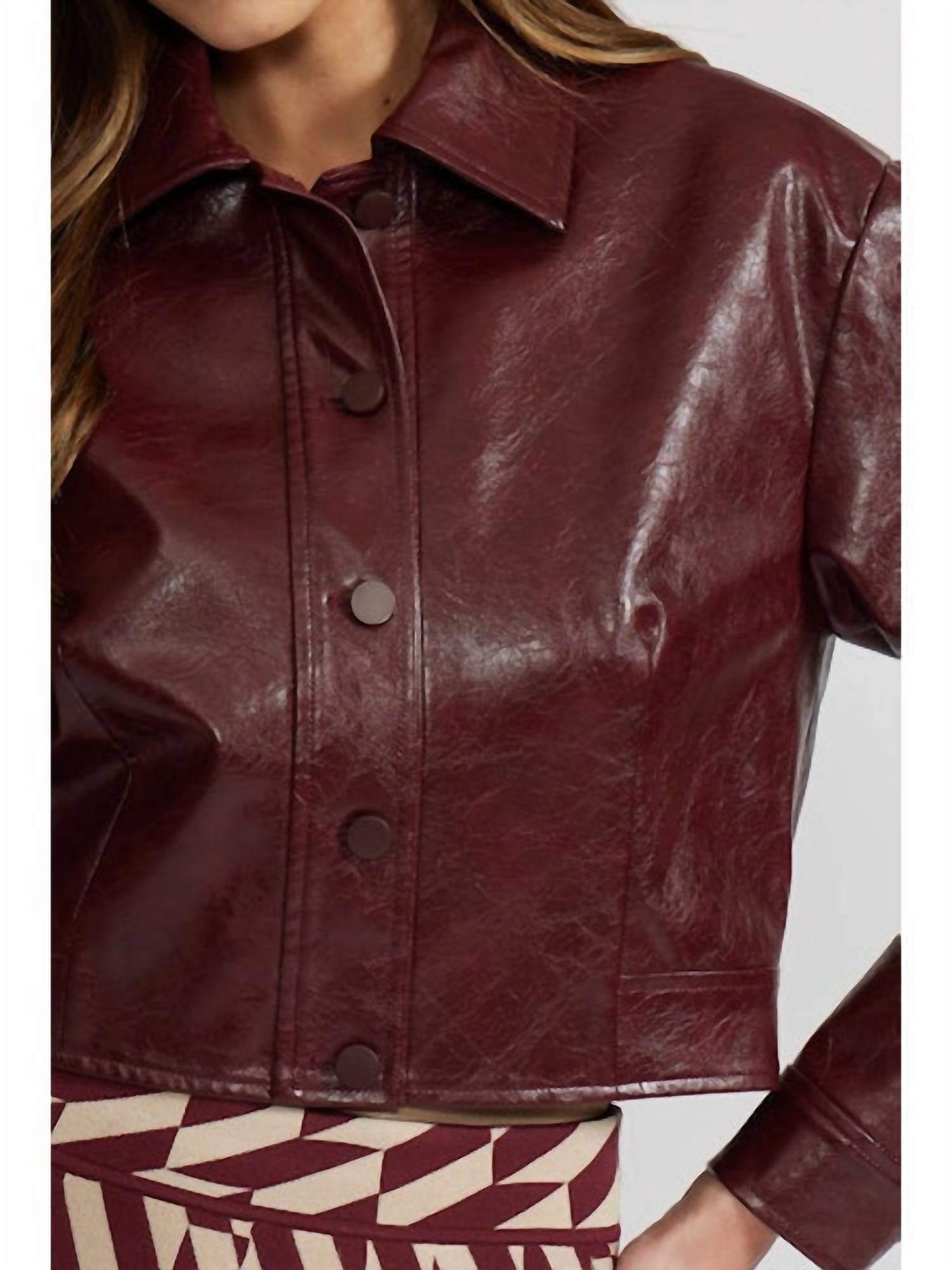 A leather jacket so good, it works with just about any outfit. Introducing the Caleb Faux Leather Jacket by LUCY PARIS, a sleek burgundy essential with a structured silhouette for modern elegance. This women's jacket features long sleeves, classic collar design, and a button closure, perfect for layering over any ensemble. Made to elevate your wardrobe staples, easily pair it with dresses, skirts, or denim for versatile styling. Care: Hand wash recommended.