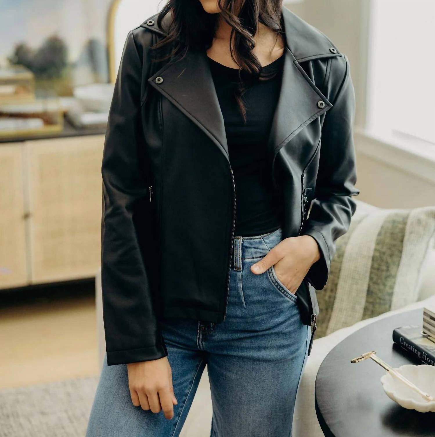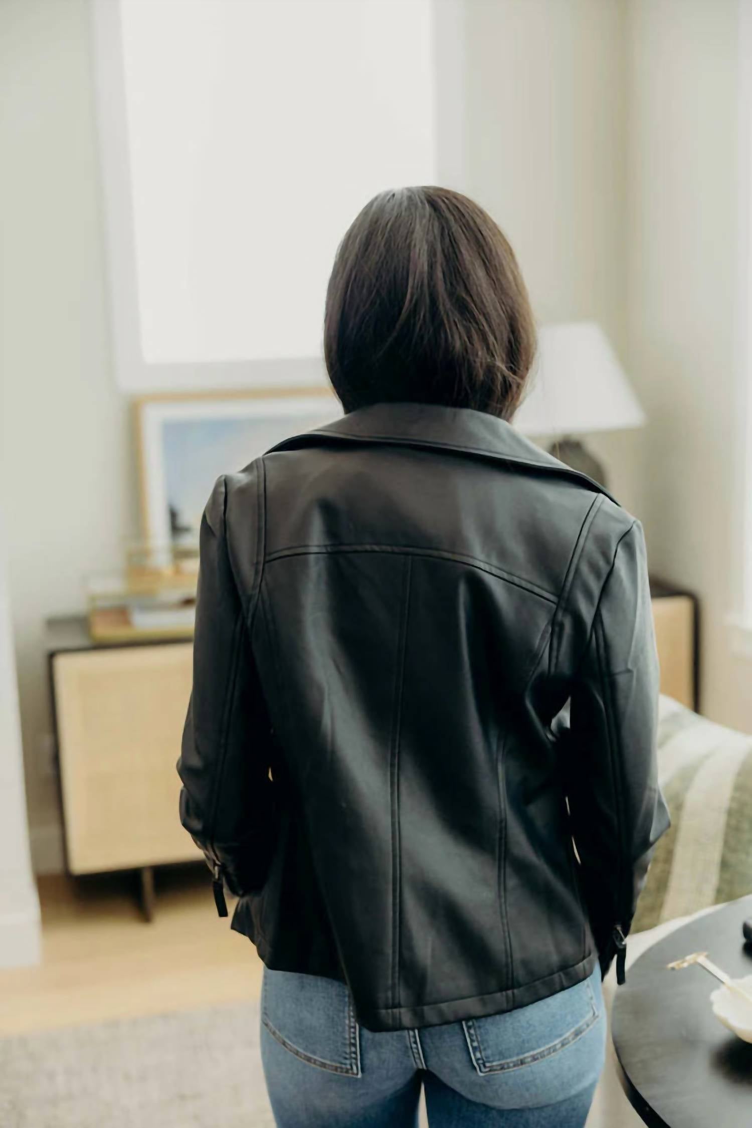 Everyone needs a leather jacket like this in their closet. The Mikarose Faux Leather Jacket is a stylish addition to your wardrobe with its sleek minimalistic design and solid black allure. This women's jacket features long sleeves, composed of 50% Polyurethane and 50% Polyester, offering the perfect balance of soft feel and just-right shine. It comes with an asymmetrical zip closure, adding an edgy touch to its v-neckline and collar detail. Ideal for travel or Thanksgiving occasions, this jacket is your go-to piece for every fall outfit.