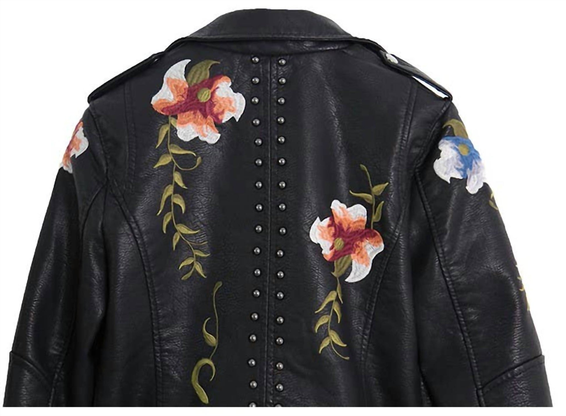 Soft leather, impeccable design. This leather jacket is a win-win. The Faux Leather Floral Jacket by Miss Sparkling adds a botanical twist to the classic moto style in a vibrant multi-color design. It features long sleeves and a collar neckline, crafted from faux leather that’s adorned with floral embroidery and studded accents. This jacket is equipped with zipper closures and includes pockets for added functionality. Suitable for women, this standout piece elevates any look with its bold pattern and texture.