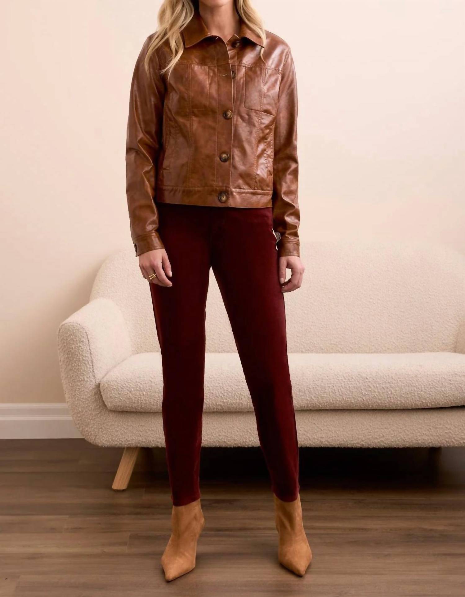 Soft leather, impeccable design. This leather jacket is a win-win. Introducing the TRIBAL Faux Leather Button-front Collar-accent Jacket in Gingerspice, perfect for a sophisticated, polished look. This jacket features long sleeves and measures 22 inches in length, providing full coverage. The contemporary design is made from 100% polyurethane with a button closure, ensuring style meets practicality. Care for this garment by machine washing on a delicate cycle with cold water, do not bleach, line dry, and avoid ironing.