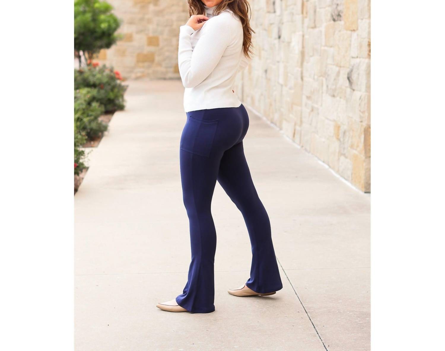 The legging you didn't know you needed and you won't want to take off. Step out in style with the Niko Flare Leggings With Pocket by Julia Rose, crafted especially for women who value both form and function. These navy high-rise leggings feature a solid pattern and are made from a blend of 92% polyester and 8% spandex, ensuring a snug yet flexible fit perfect for any activity. Experience the ultimate comfort and mobility with their pull-on closure, while the added pocket design adds a touch of practicality. Designed for both athleisure and fitness activities, these leggings are easy to maintain with machine wash and line dry care instructions. Available in sizes from Tween 12/14 to 2XL/3XL, with inseam measurements ranging from 71cm to 76cm.