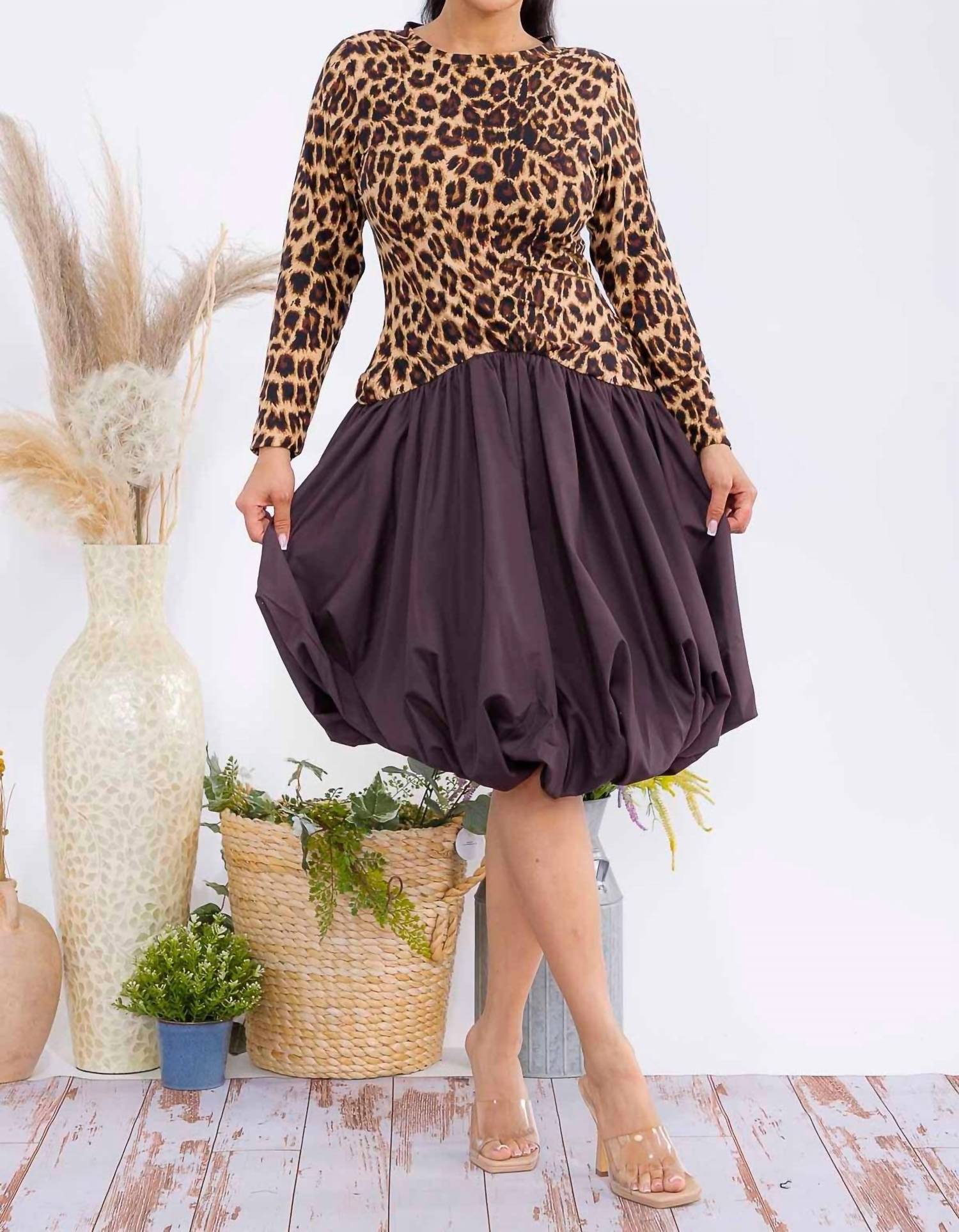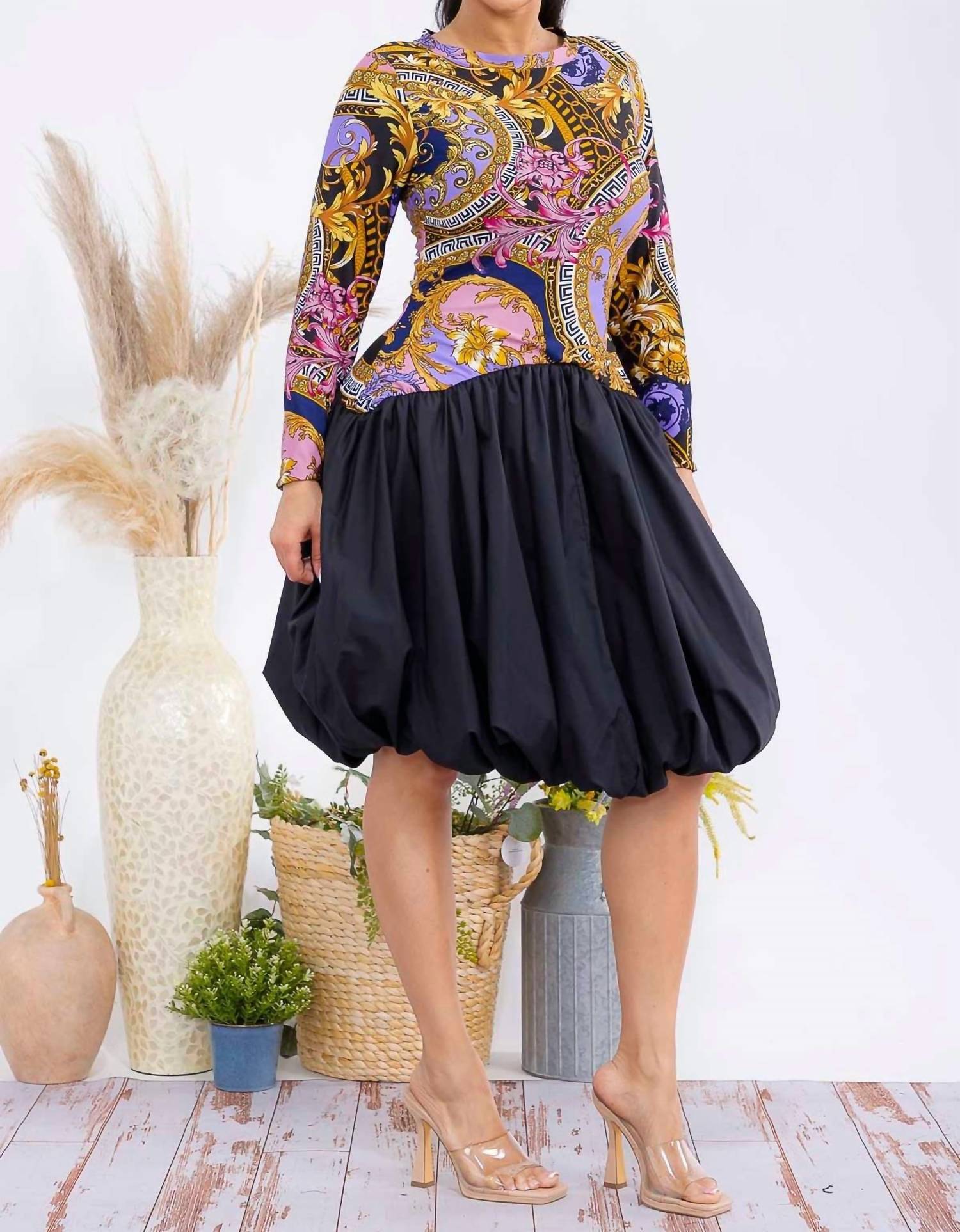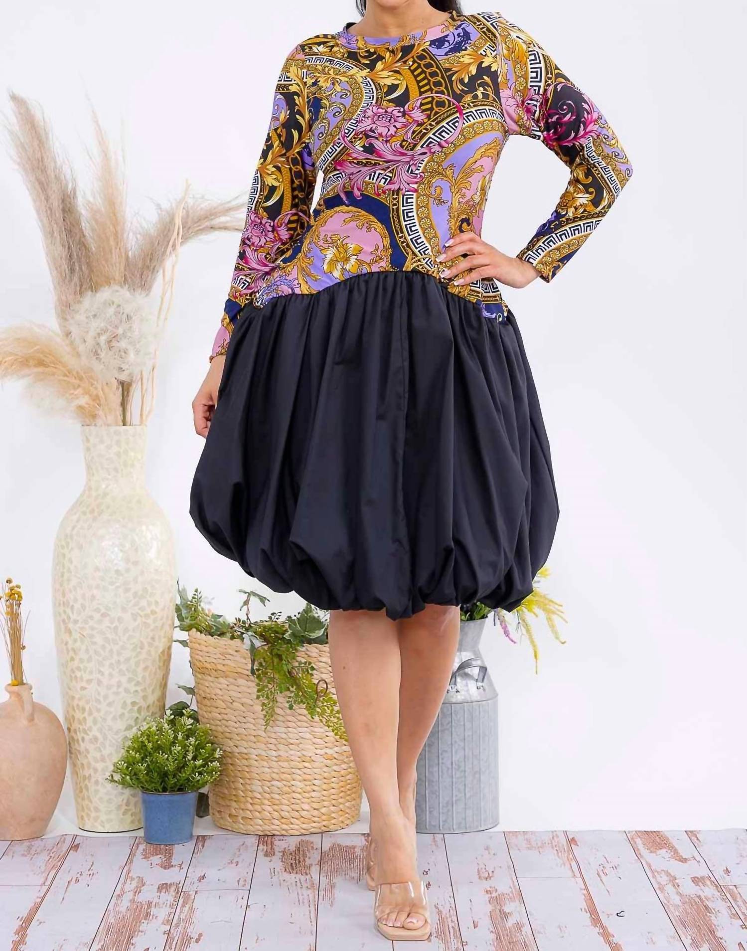 The pefect long sleeve dress for those cooler months. The Karen T Design Balloon Bottom Dress is a standout piece for a Boho Chic look with its paisley pattern and multi-color aesthetic. Designed with long sleeves and a crewneck, this dress offers a fit and flare silhouette perfect for cocktail parties. The stretchy fabric on top ensures a comfortable fit making it an ideal choice for Thanksgiving celebrations.