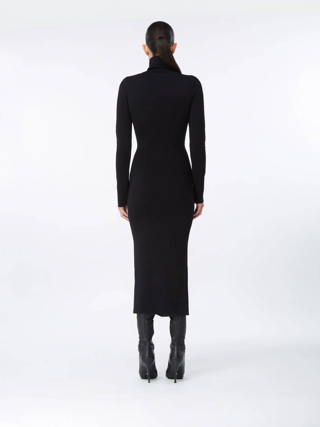 Cute and comfortable, this long sleeve dress has it all. Seamless blend of classic allure and modern style. Long-sleeve bodycon dress in solid black. Allows you to flaunt a subtle opening at the waist, offering versatility with front or back wear. Expertly knitted from a 65% rayon and 35% polyamide blend. Promises comfort and a sleek silhouette. For maintenance, opt for a hand wash or dry clean, ensuring you iron on low temperature and dry flat.