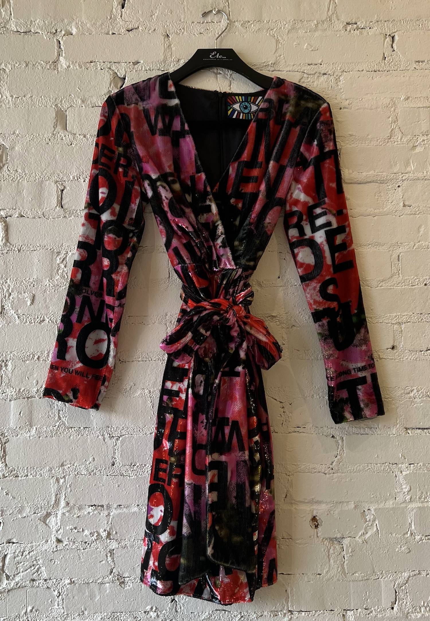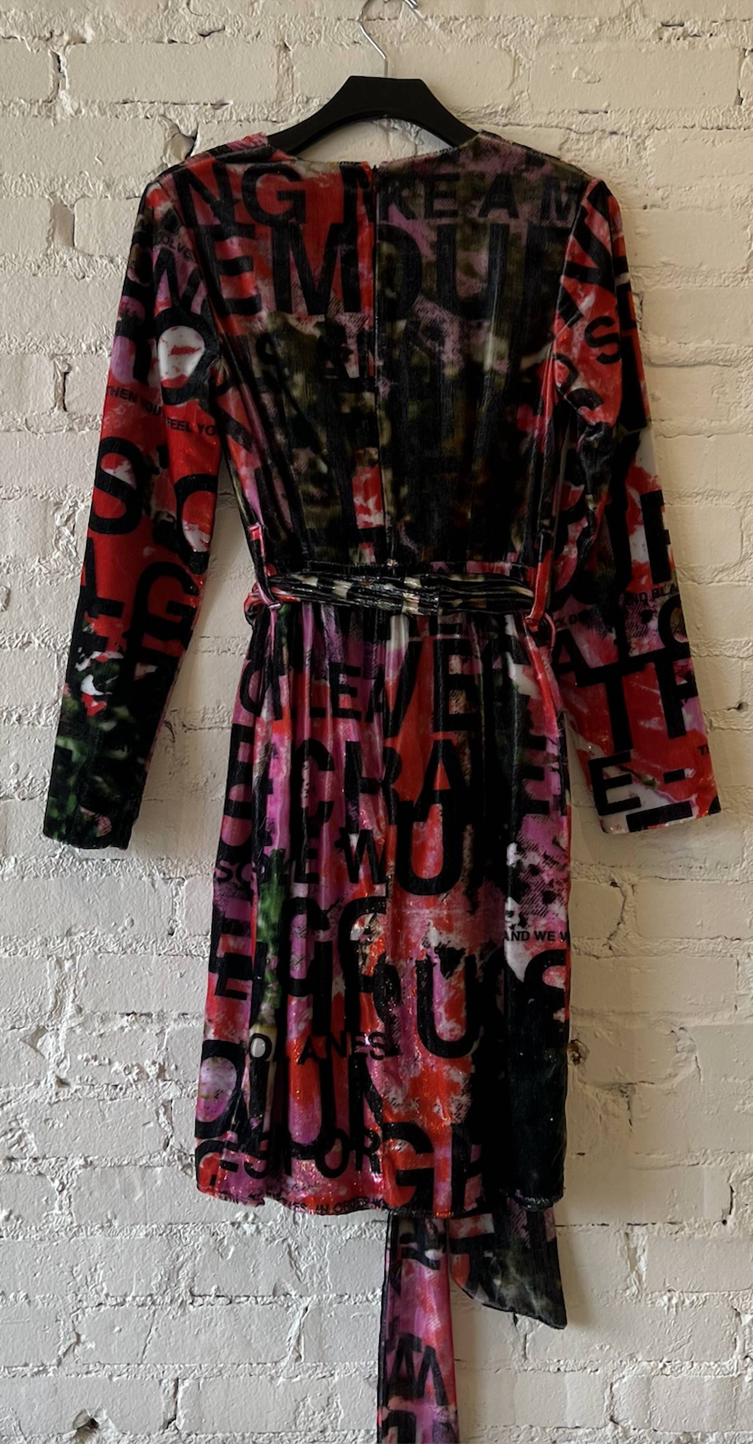 A flattering yet comfortable dress you'll be reaching for season after season. Introducing the Women's Dream For Winter Faux Wrap Cocktail Dress by Libertine, a perfect choice for evening events. This dress features long sleeves and is crafted from luxurious velvet, offering a soft touch and elegant look. Made in the USA, it boasts a classic V-neckline and a chic tie closure. The patterned pink, red, and multi-color design embodies the quiet luxury trend, making it a standout piece for your fall wardrobe.