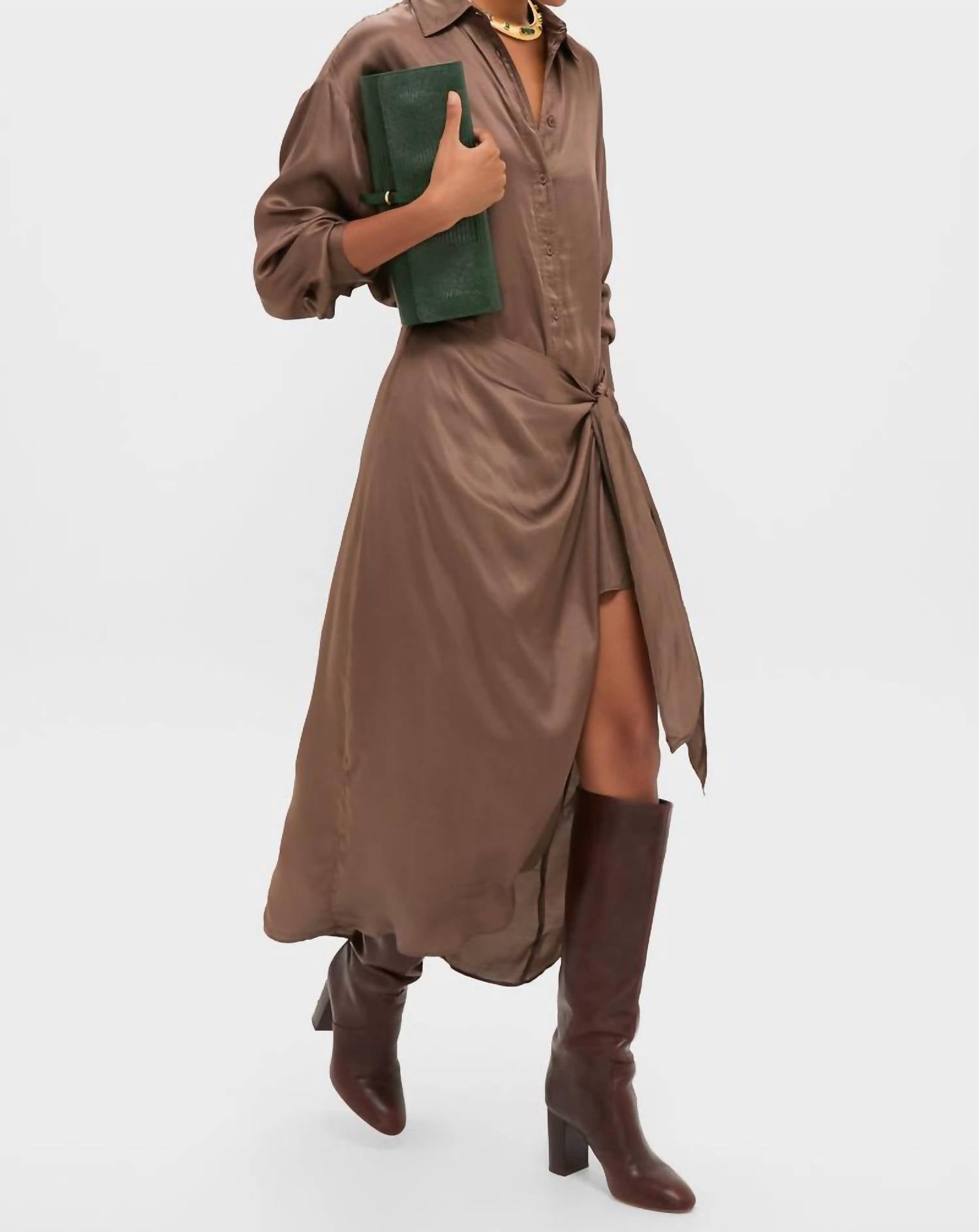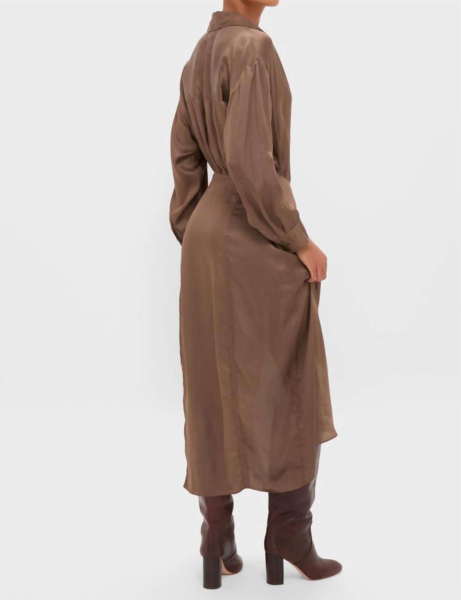 Cute and comfortable, this long sleeve dress has it all. Step into effortless elegance with the Alessandra Sarong Shirt Dress by APIECE APART. This dress features long sleeves and an innovative sarong wrap-tie closure that offers a flattering silhouette. Crafted for versatile styling, it presents a morel hue with a chic button closure. The design is complete with an asymmetrical drape and front slit, making it perfect for fall dinner parties or Thanksgiving gatherings. Care: Dry clean.