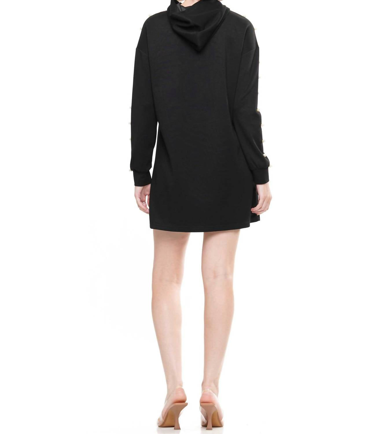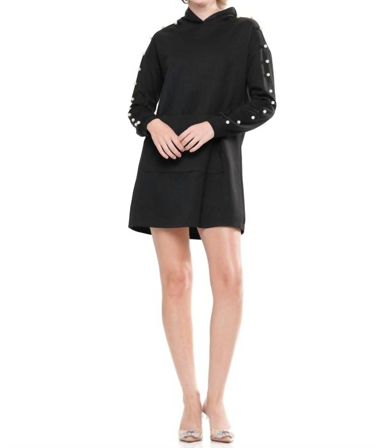Cute and comfortable, this long sleeve dress has it all. Embrace elegance with the Why Dress Pearl Hoodie Dress, an exceptional addition for your winter collection. This black long-sleeve shift silhouette features a stylish hood and exquisite pearl detailing. Crafted from a cotton blend, the dress offers a solid pattern and practical front pockets. Closure: Pull on. Care: Hand wash and line dry. 60% Cotton, 35% Polyester, 5% Spandex.