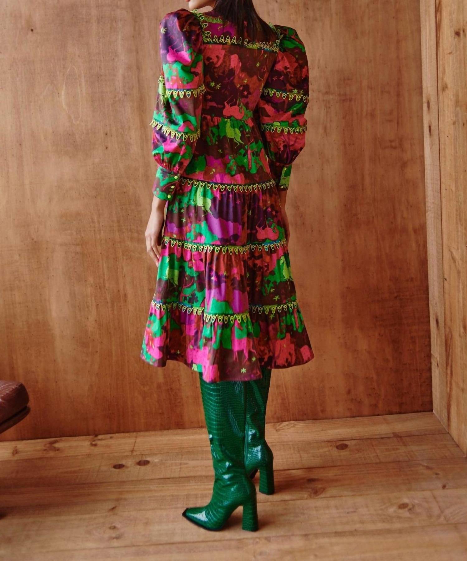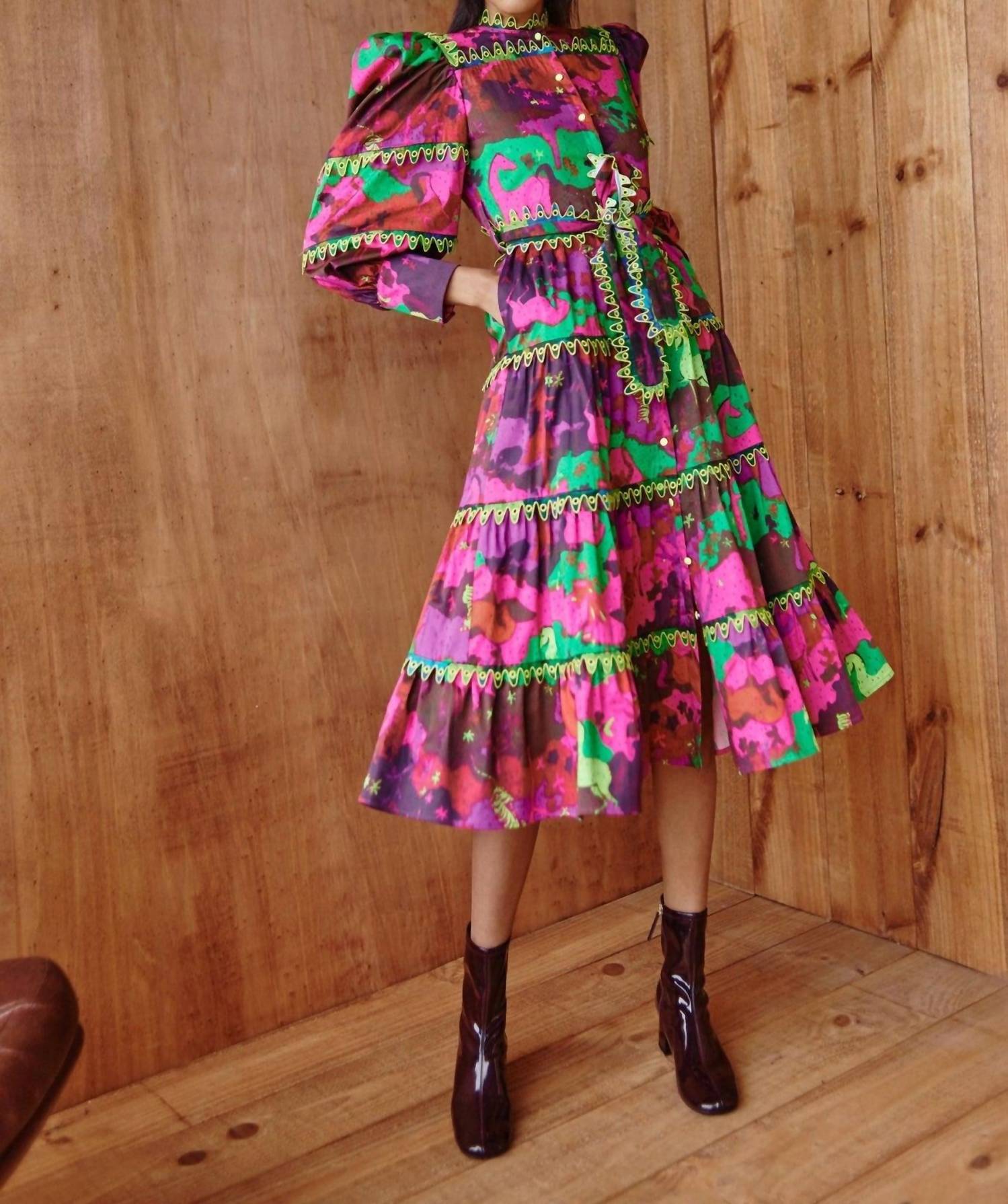 A flattering yet comfortable dress you'll be reaching for season after season. Make a bold entrance with the CELiA B Tiered Hasu Midi Dress, featuring long puff sleeves and a captivating floral and abstract print in vibrant purple, pink, and green. This A-line silhouette boasts a detailed mockneck and intricately trimmed tiers and sleeves, complete with a detachable belt for added flair. Composition: 97% Cotton, 3% Spandex. Closure: Button closure. Care: Dry clean or hand wash in cold water separately, iron at low temperature, do not bleach.