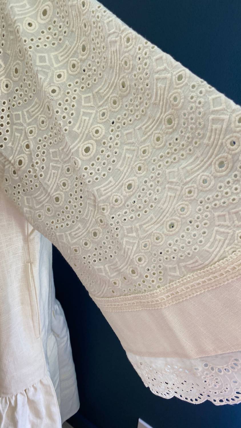 The pefect long sleeve dress for those cooler months. Introducing the Saguna Dress by FLOE, crafted in vanilla-toned cotton for a medium weight feel, perfect for special occasions. This long sleeve dress features dramatic bell sleeves and an eyelet fabric placket. Originating from India, it offers practical pull-on closure and pockets for added convenience. Machine wash warm inside out with like colors, avoiding chlorine bleach to preserve longevity. Model is wearing a size small. 100% Cotton.