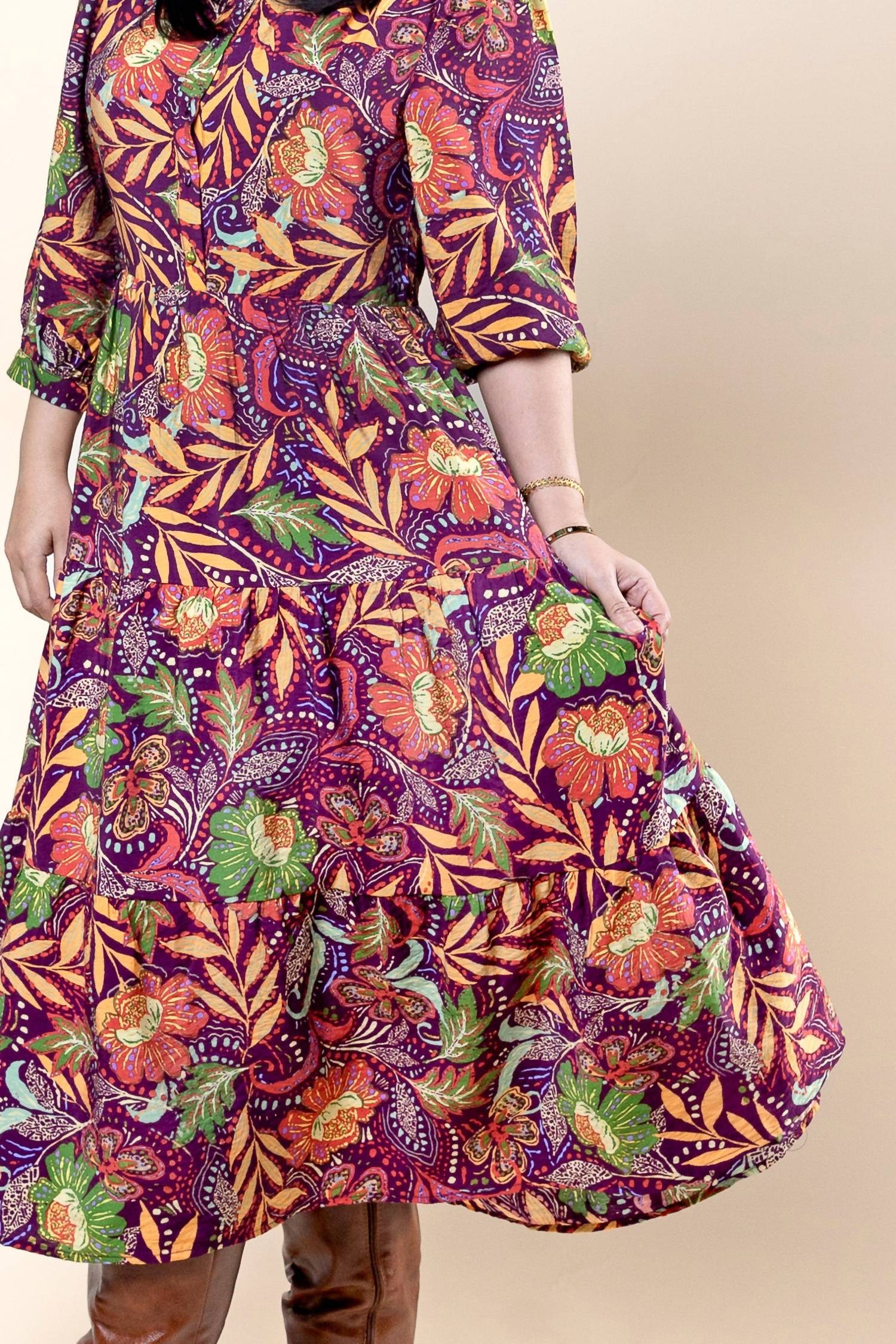A flattering yet comfortable dress you'll be reaching for season after season. Elevate your wardrobe with the 3/4 Sleeve Midi Dress by Fate, an essential piece for Fall. Featuring a vibrant burgundy floral print, this dress offers a flattering empire waist and three-quarter sleeves. It is crafted from a blend of rayon and nylon and includes a convenient zip back with pockets for added functionality. Designed with a versatile crewneck, care for this boho chic piece is simple with machine washing instructions.