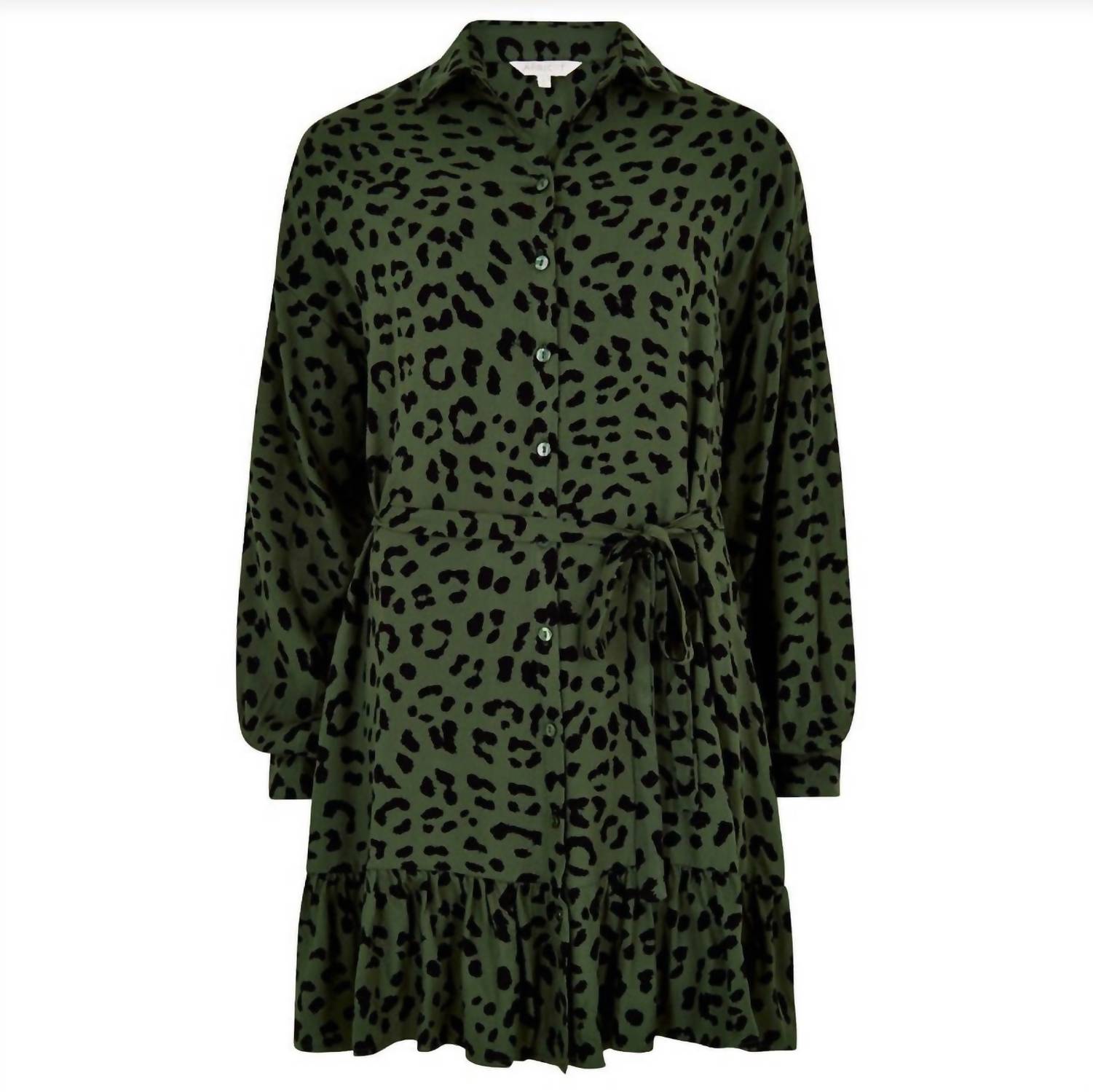 Cute and comfortable, this long sleeve dress has it all. Step into chic elegance with the Leopard Ruffle Hem Belted Waist Shirt Dress by APRICOT, a stylish piece in a captivating olive tone. This patterned dress features long sleeves, a classic collar, and a flattering shirt silhouette. It is designed with a button closure, effortlessly merging comfort with sophisticated boho chic style. Perfect for a dinner party or celebrating New Year's Eve, this dress is a staple for your spring wardrobe.