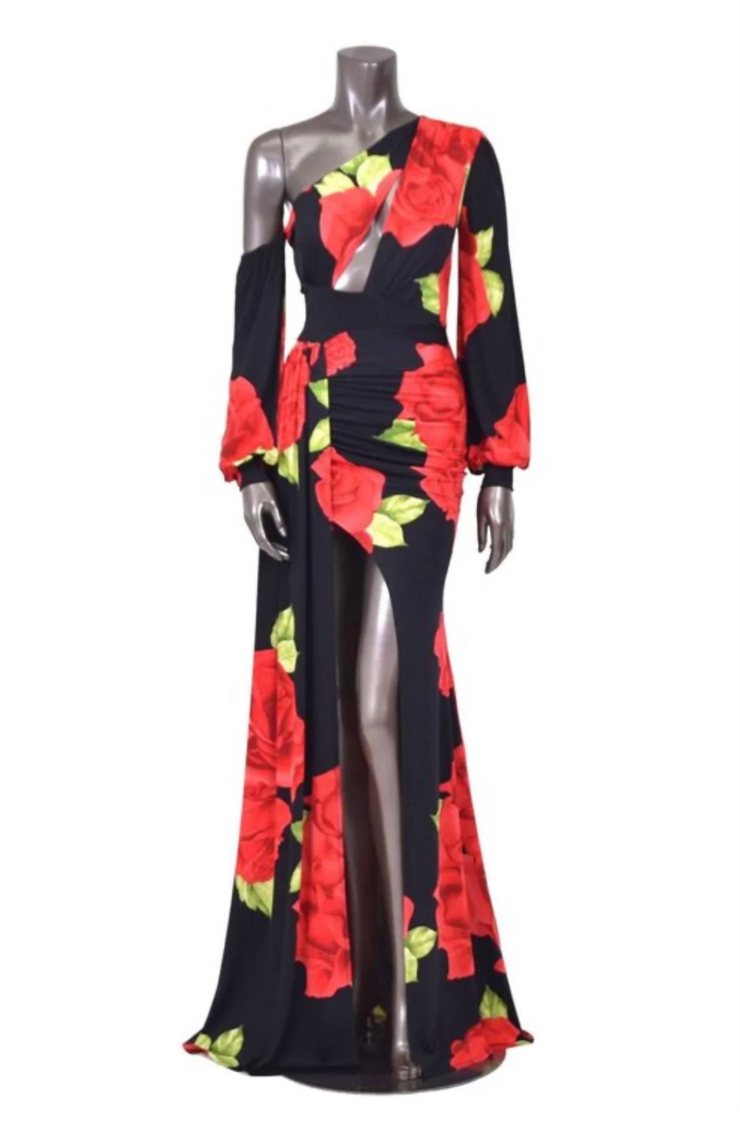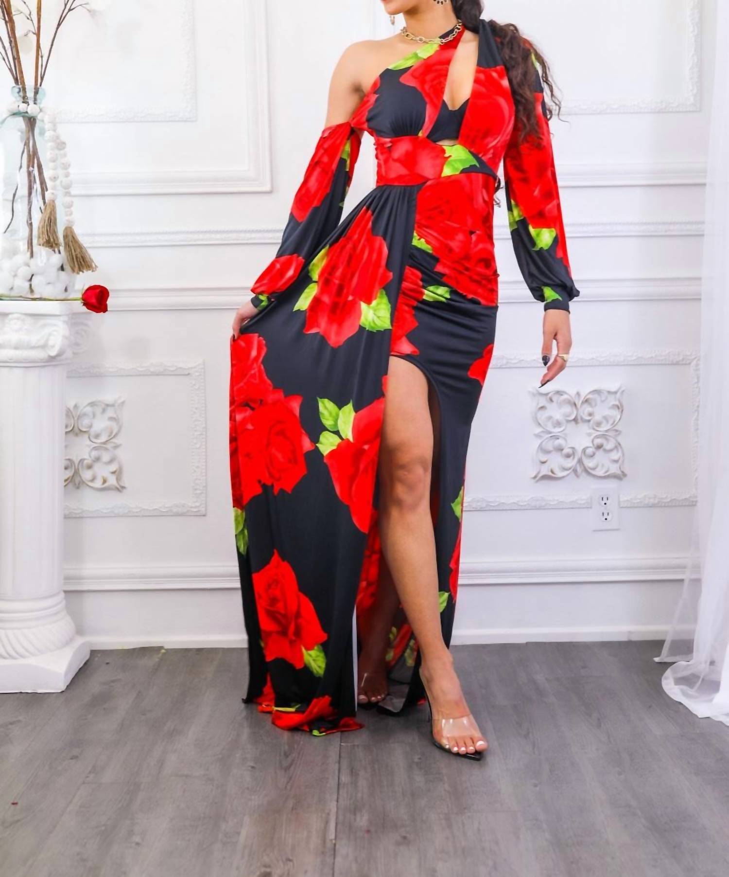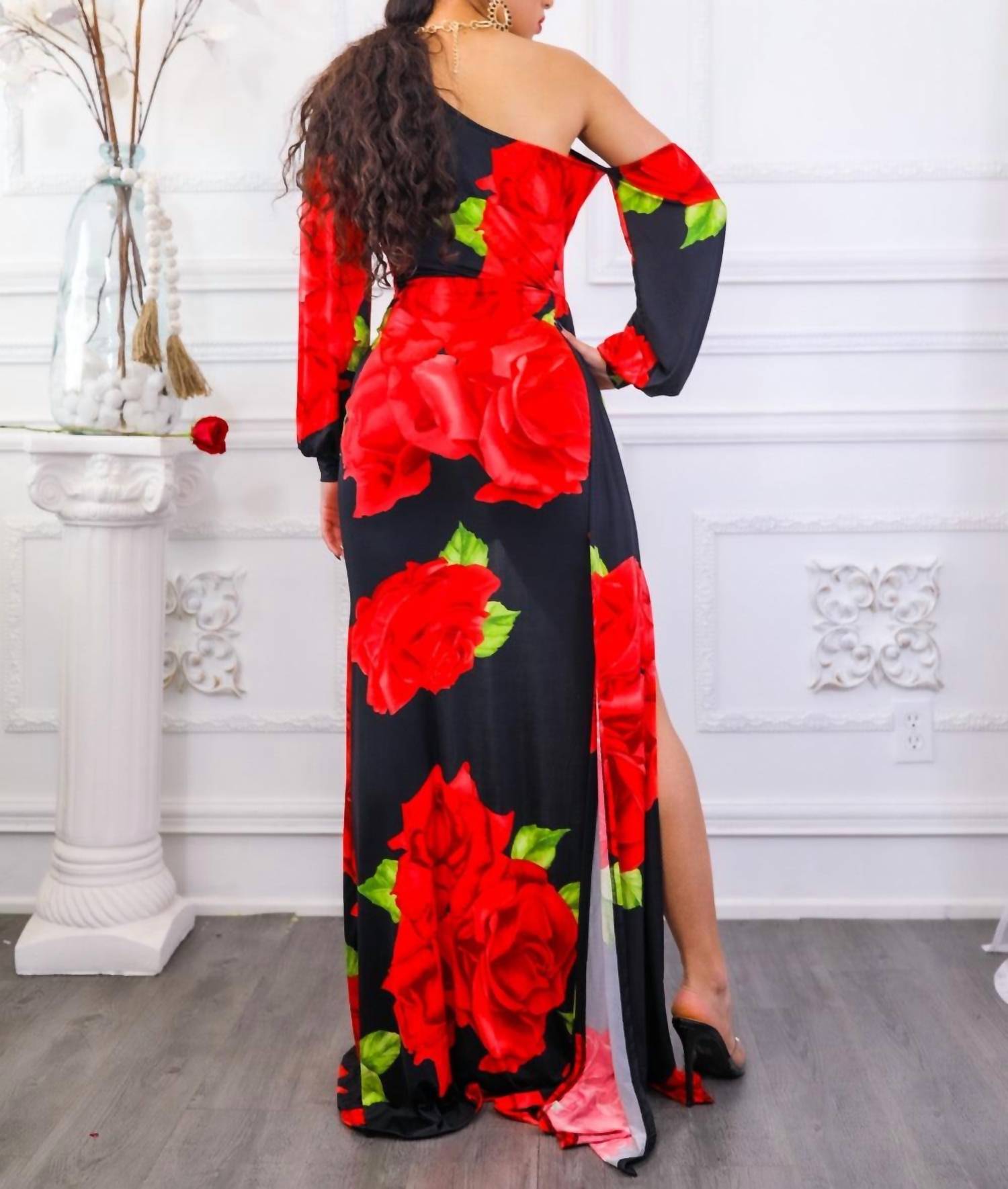 The pefect long sleeve dress for those cooler months. Introducing the Roses Are Red Asymmetrical Draped Floral Dress by SurelyMine, a captivating choice for any evening event. This versatile wrap dress features a stunning floral pattern with rose designs, complemented by an off-the-shoulder neckline and long sleeves. Designed to highlight elegance with its maxi side drape, this dress offers good stretch for a flattering fit. Closure: Pull on. Perfect for spring occasions, model wears a size small and stands 5'4".