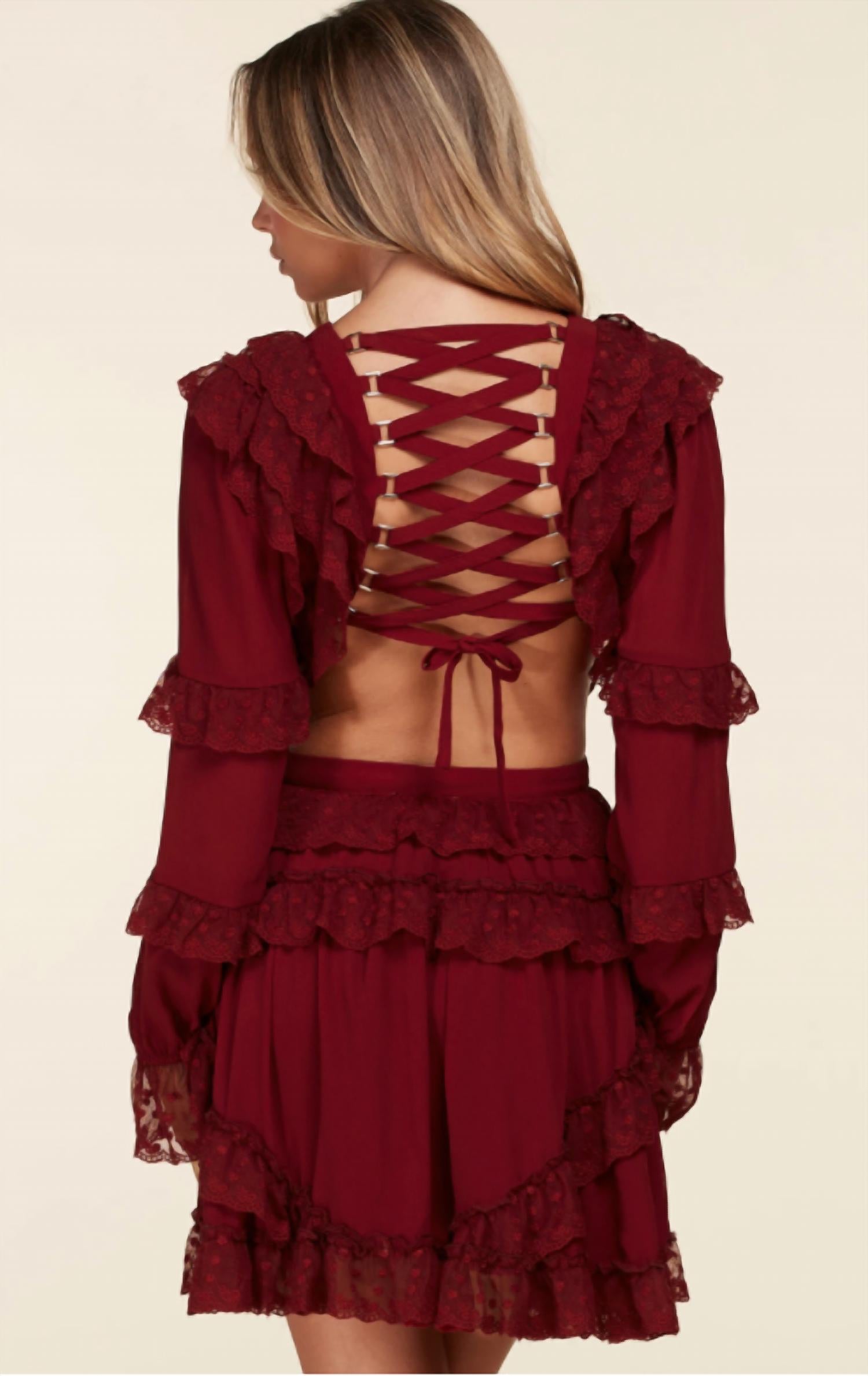 The pefect long sleeve dress for those cooler months. Stunning choice in a deep burgundy hue. Cotton mini dress boasts long sleeves, a ruffled A-line skirt, and intricate lace details, perfect for a Boho Chic winter. Charming lace-up back and deep V-neckline accentuate its allure. With a tie closure. Best maintained with dry cleaning to preserve its exquisite details.