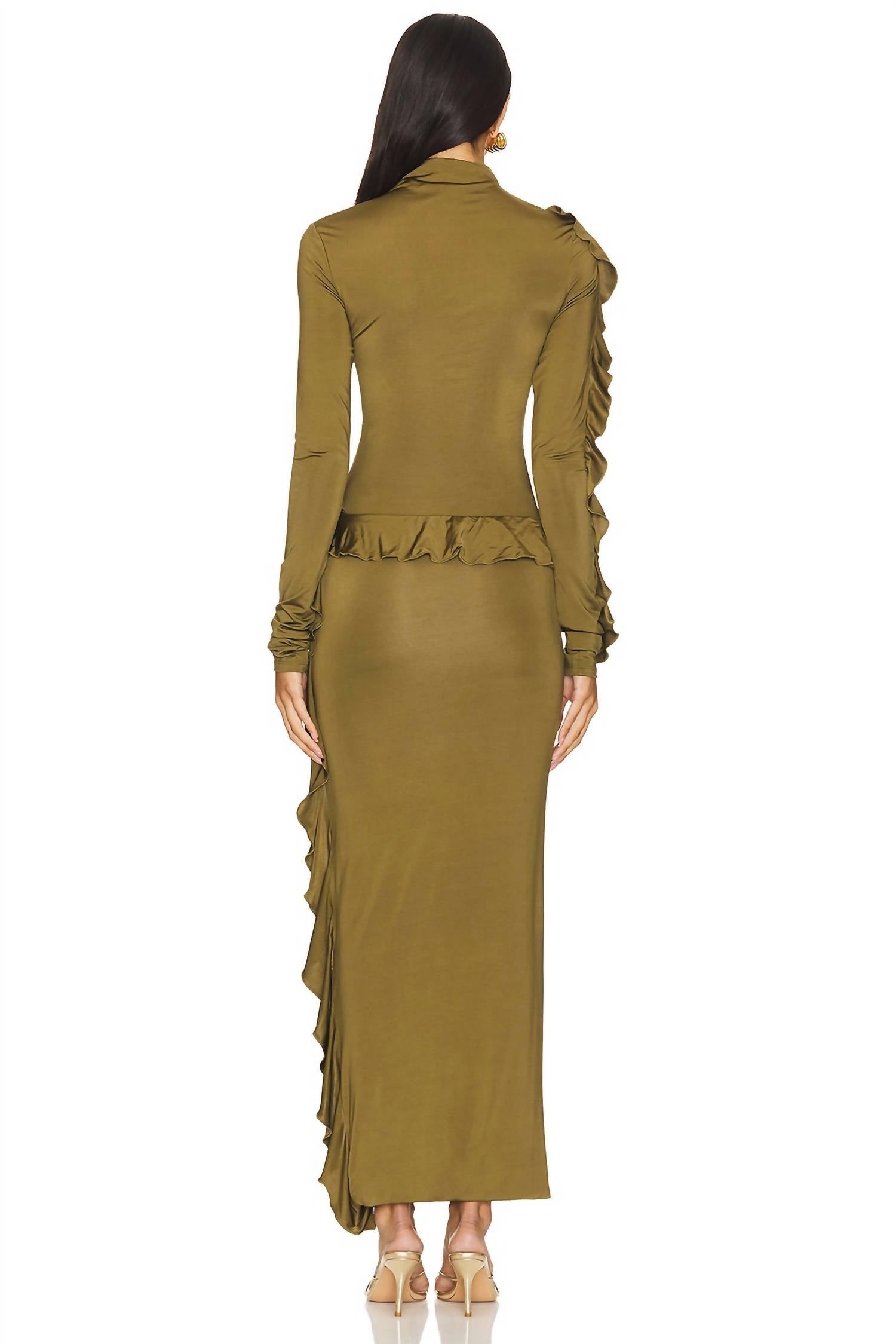 The pefect long sleeve dress for those cooler months. Elevate your evening wear with the Mira Long Sleeve Maxi Dress by Paris Georgia in an elegant olive green. Crafted from a viscose blend, this floor-length, bodycon dress features a high neckline and ruffled trims for added sophistication. Designed with a sporty style, the dress combines a lightweight stretch jersey with an attached bodysuit for a seamless fit. Composition: 93% Viscose, 7% Spandex, made in China. Care: Dry clean only, hand wash is recommended and lay flat to dry for best results.