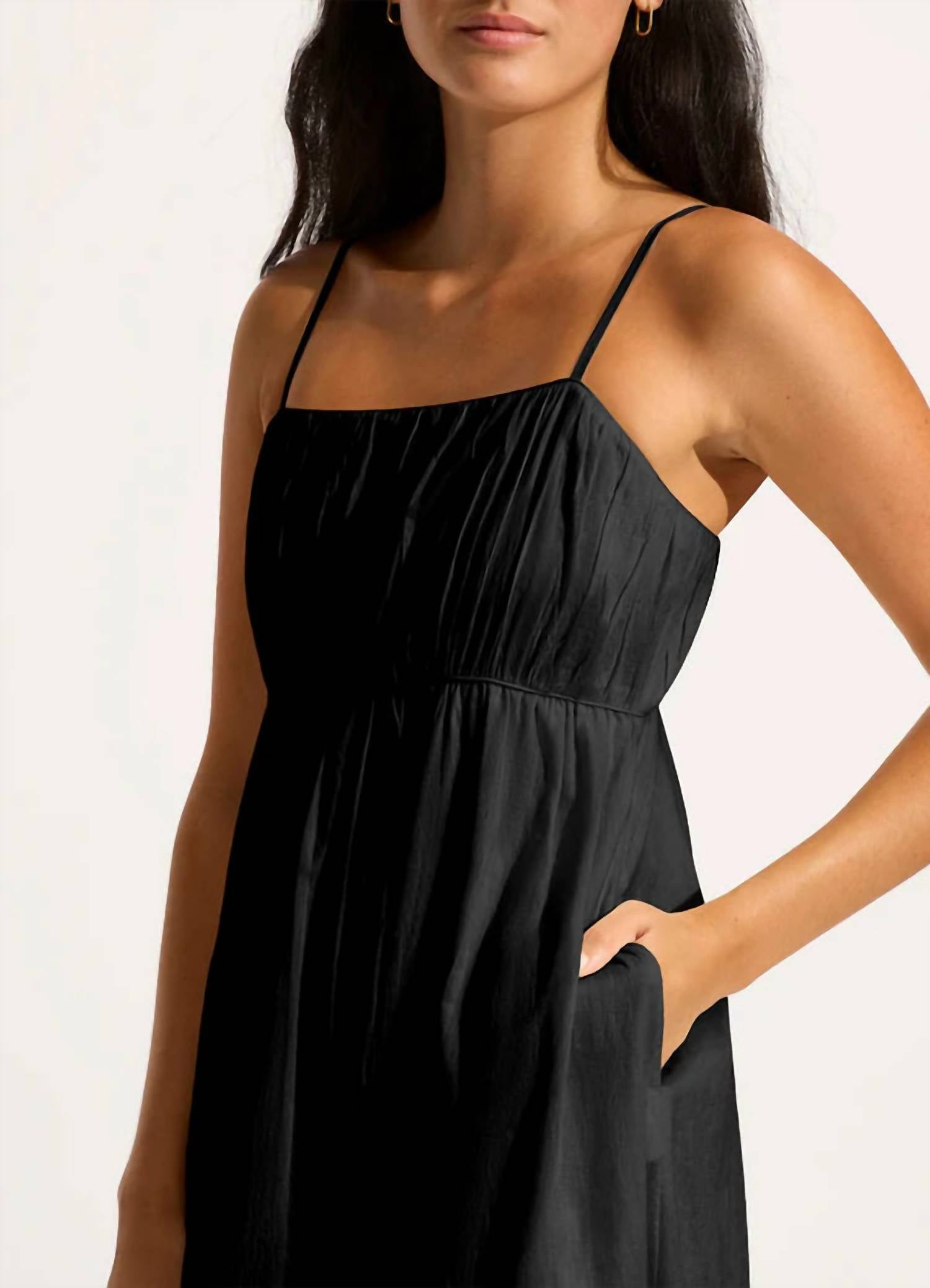 The pefect long sleeve dress for those cooler months. Introducing the Piped Maxi Dress by Seafolly, a chic addition for summer evening events. Designed with spaghetti straps and a classic A-line silhouette, this solid black dress offers adjustable straps and a lined bodice for ultimate comfort. Crafted from 100% organic cotton, it features practical side seam pockets with a convenient pull-on closure. Care is simple with a cold gentle wash or hand wash followed by drying flat in the shade.