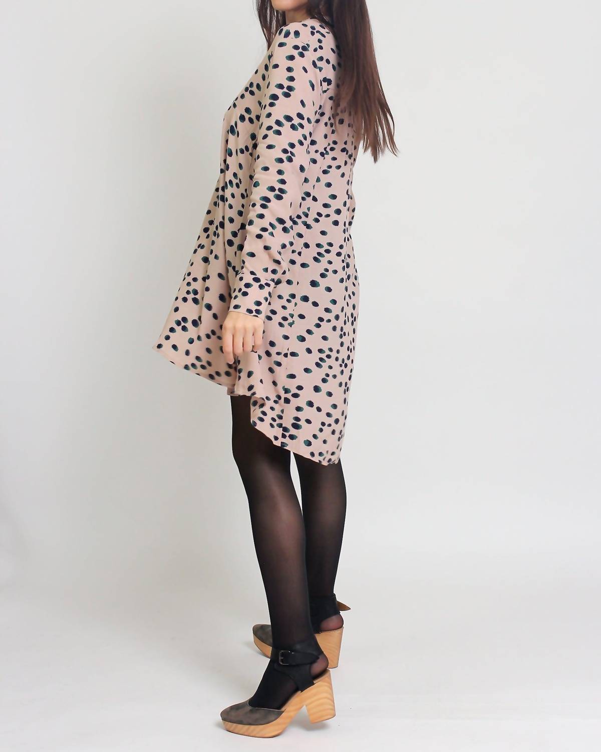 A flattering yet comfortable dress you'll be reaching for season after season. Introducing the Everleigh Mini Dress by Hayden LA, a chic addition to your wardrobe in a delightful Almond Mix polka dot pattern. This A-line dress features long sleeves, a ruffled collar, and a subtle hi-low hemline, enhancing its feminine silhouette. Crafted from 100% Rayon, the dress offers a relaxed fit and has a pull-on closure for easy wear. Care recommendation: Dry clean only. Model is 5'3" with a 32" bust, 25" waist, and 34" hips, wearing a size small. Available sizes range from S to L with bust measurements of 38", 39", and 40" respectively. Perfect for summer cocktail parties and workwear occasions.
