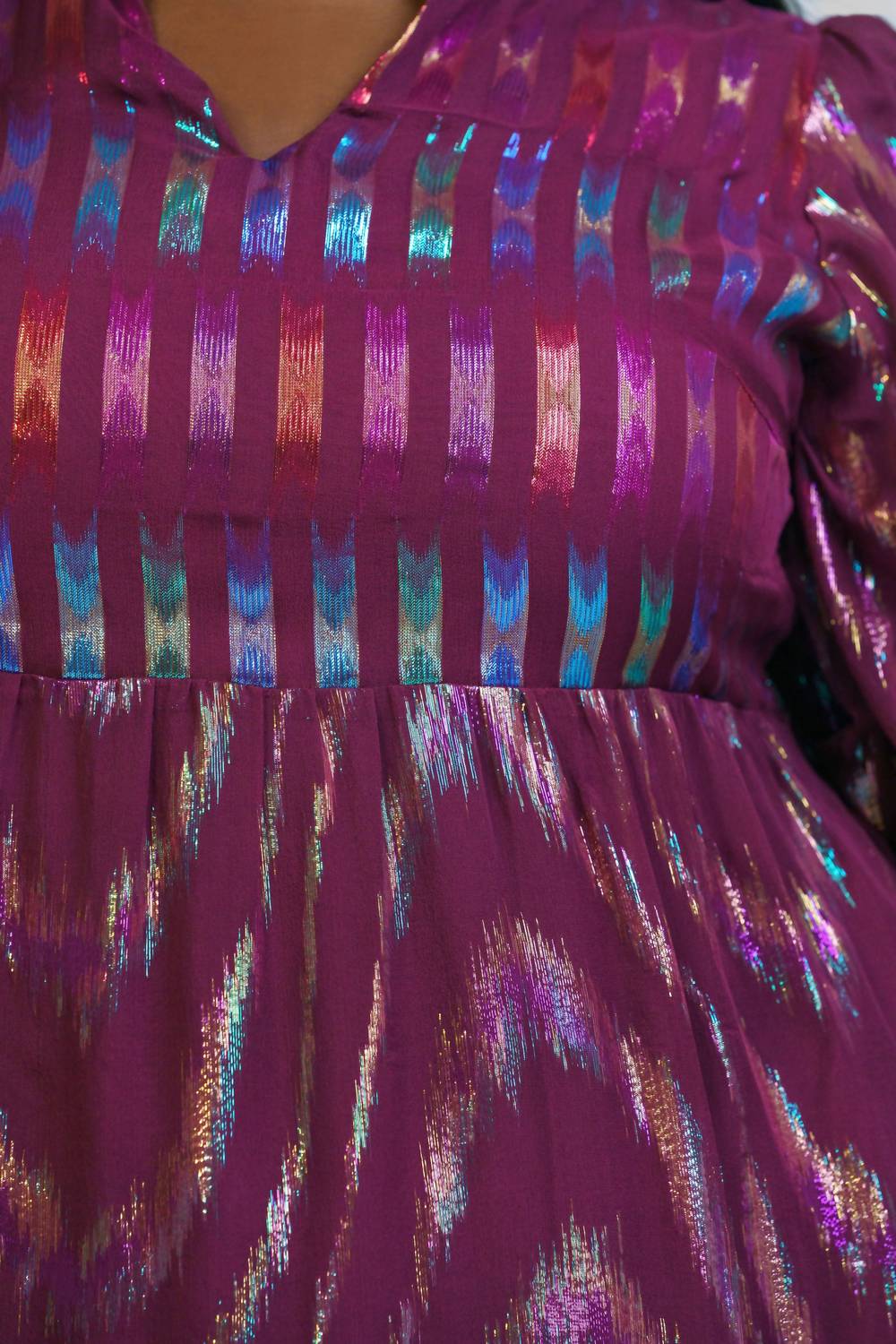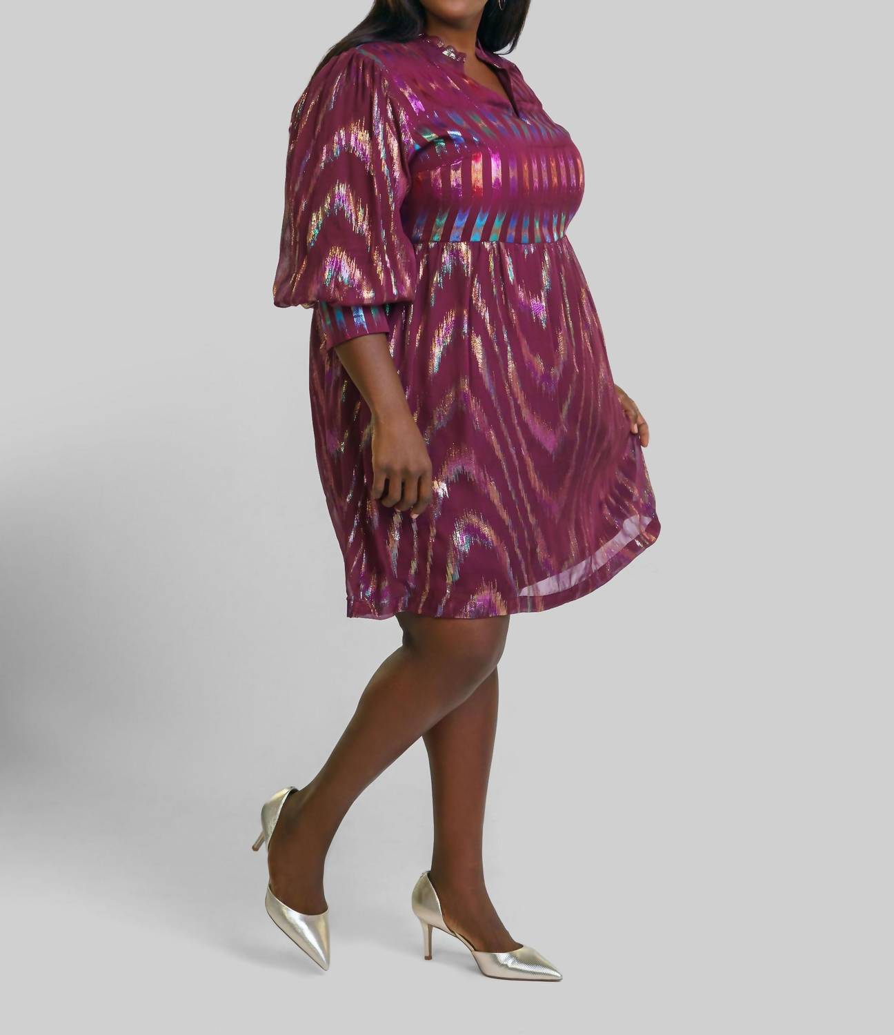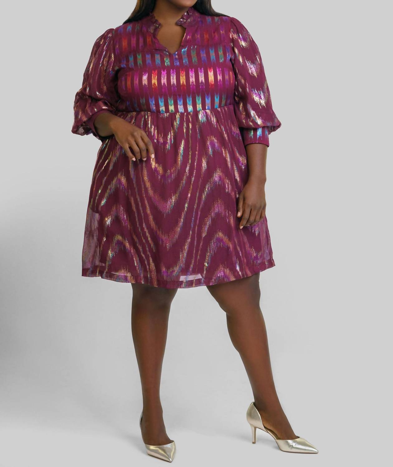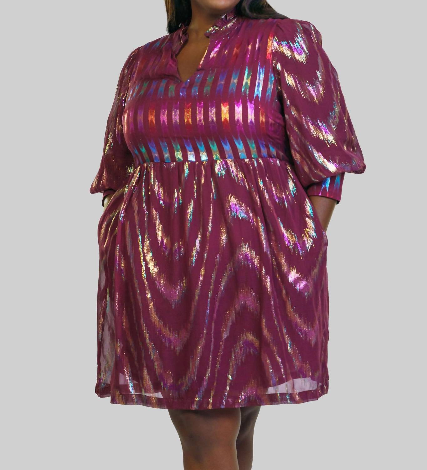 The pefect long sleeve dress for those cooler months. Introducing the Scarlet Mini Dress by EMILY LOVELOCK, a stunning piece crafted from 100% silk lurex georgette in a rich burgundy hue. Measuring just above the knee, this dress features voluminous short sleeves with signature heart buttons and a charming ruffle detail at the v-neckline. Designed with a shift silhouette, it includes a convenient side zipper for closure. Care: Dry clean only. Perfect for special occasions or a stylish holiday party, this plus-size dress offers elegance and comfort.