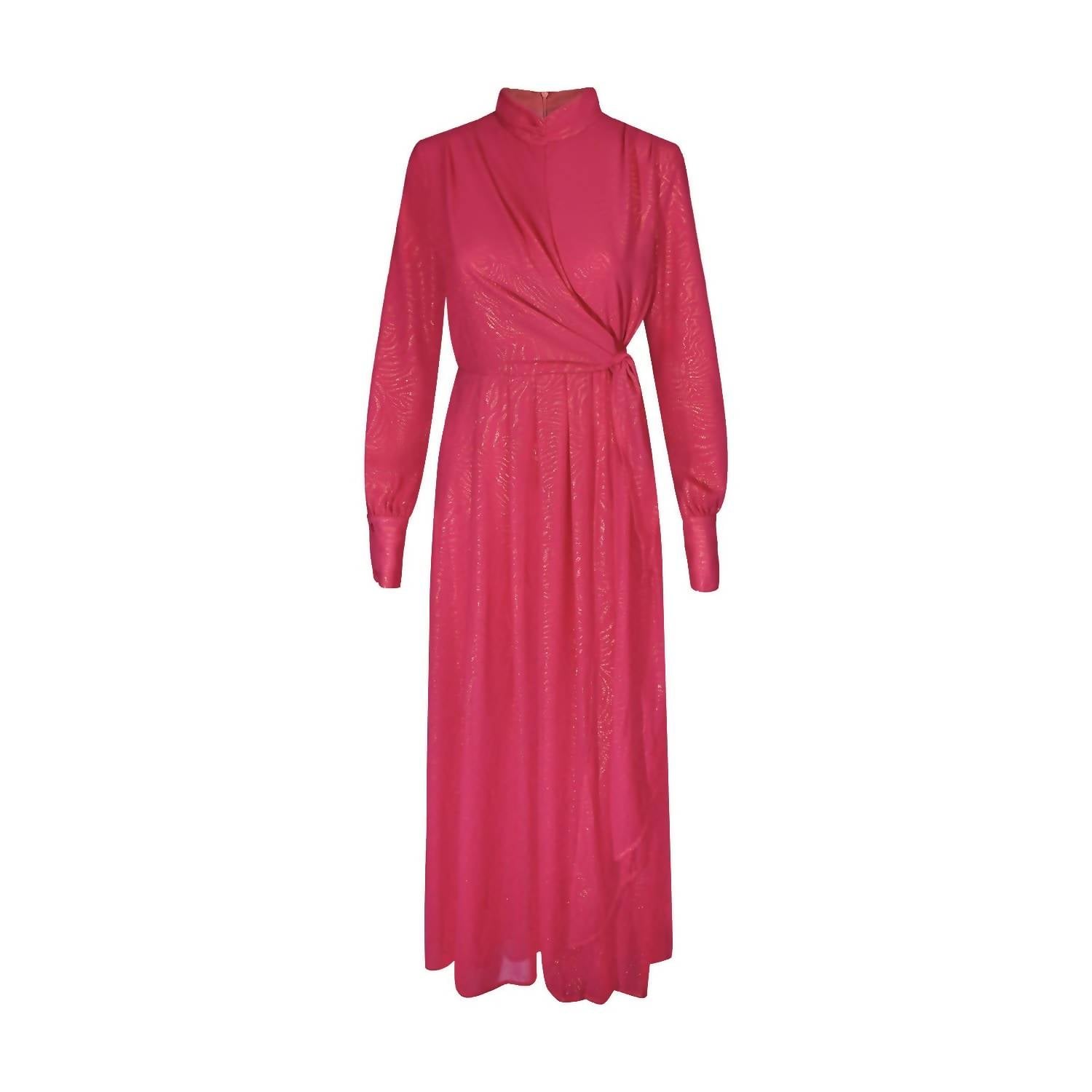 Cute and comfortable, this long sleeve dress has it all. Meet the Ahava Chiffon Dress by Esteem Couture, a magnificent blend of elegance and bold style. This long sleeve dress, tailored in a maxi length, enchants with its vibrant fuchsia hue and exquisite gold printing. Designed with a wrap silhouette, it features a chic mockneck and ensures a secure fit with a zip closure. Material: Chiffon. A perfect choice for springtime celebrations or making an entrance at any formal event.
