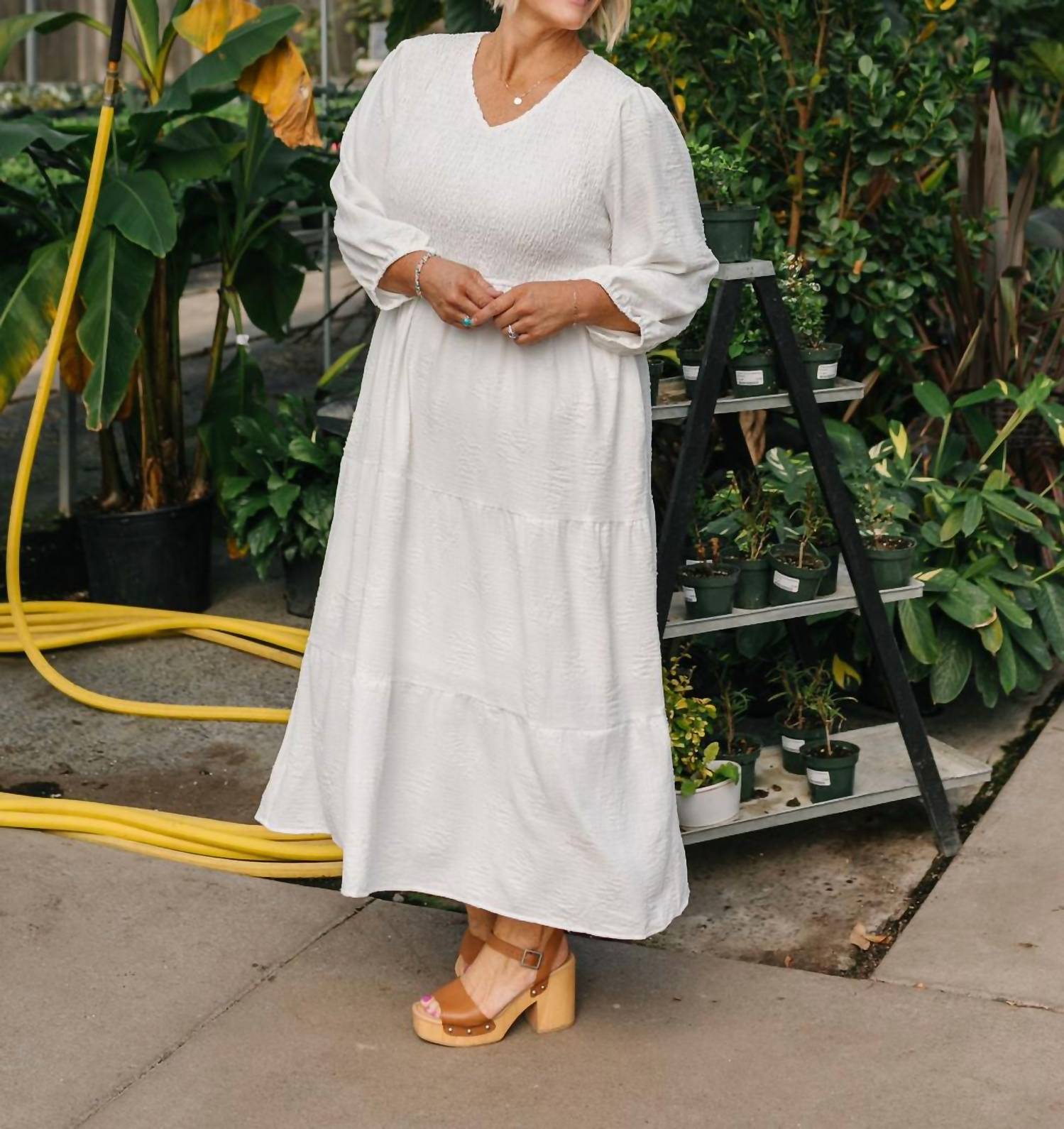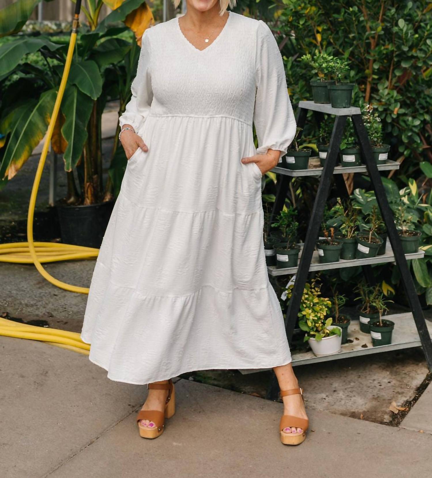 The pefect long sleeve dress for those cooler months. The Polagram Regina Long Sleeve Midi Dress in white exudes elegance with its textured palm fronds and sophisticated v-neckline. Crafted from 100% Polyester, this A-line midi dress offers a flattering silhouette with a smocked bodice and tiered design, complete with convenient pockets and elastic cuffs for comfort. Originating as a minimalist piece perfect for spring occasions like Easter, it features a pull-on closure for easy wear. Care instructions include hand washing cold, laying flat to dry, and low ironing if needed. Model is wearing a size 1X and is 5'7".