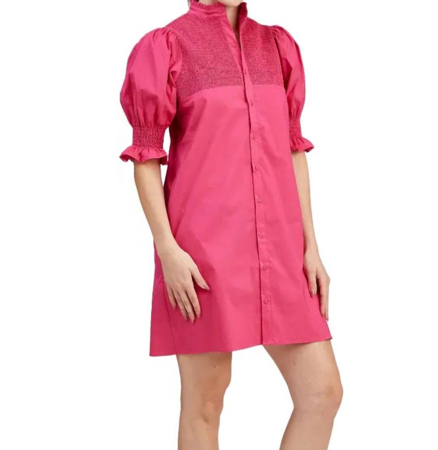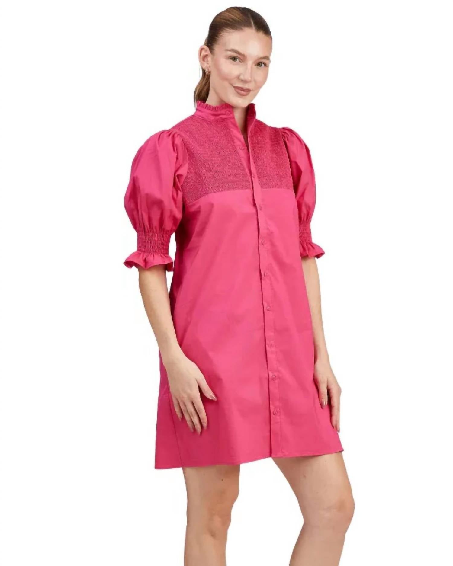 The pefect long sleeve dress for those cooler months. Introducing the Aubrey Mini Dress by Taylor Tillman, an enchanting piece in Berry perfect for a holiday party. This dress features short puff sleeves with smocked, ruffled cuffs and a tailored stand collar for a polished look. It's crafted from a breathable cotton blend composed of 70% Cotton, 25% Polymide Poplin, and 5% Spandex, offering both comfort and style. The button closure adds to its minimalist shift silhouette. Care: Wash cold with similar colors, tumble dry or hang to dry, and iron on low.