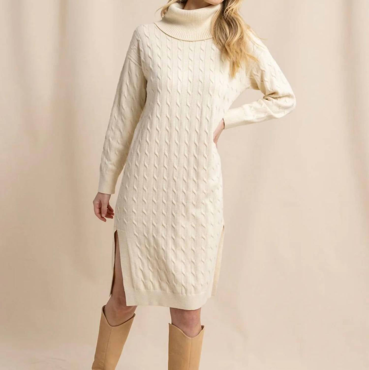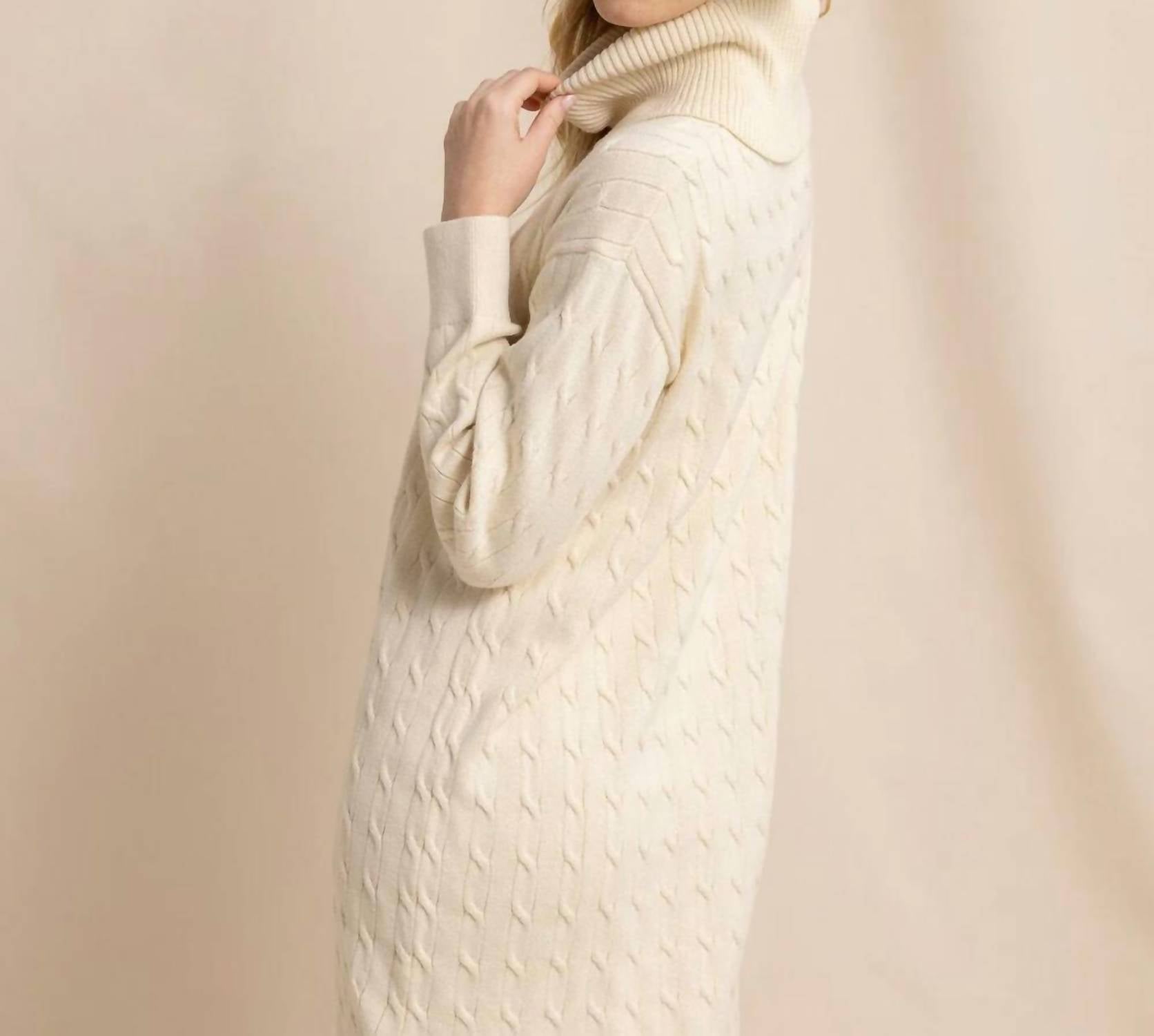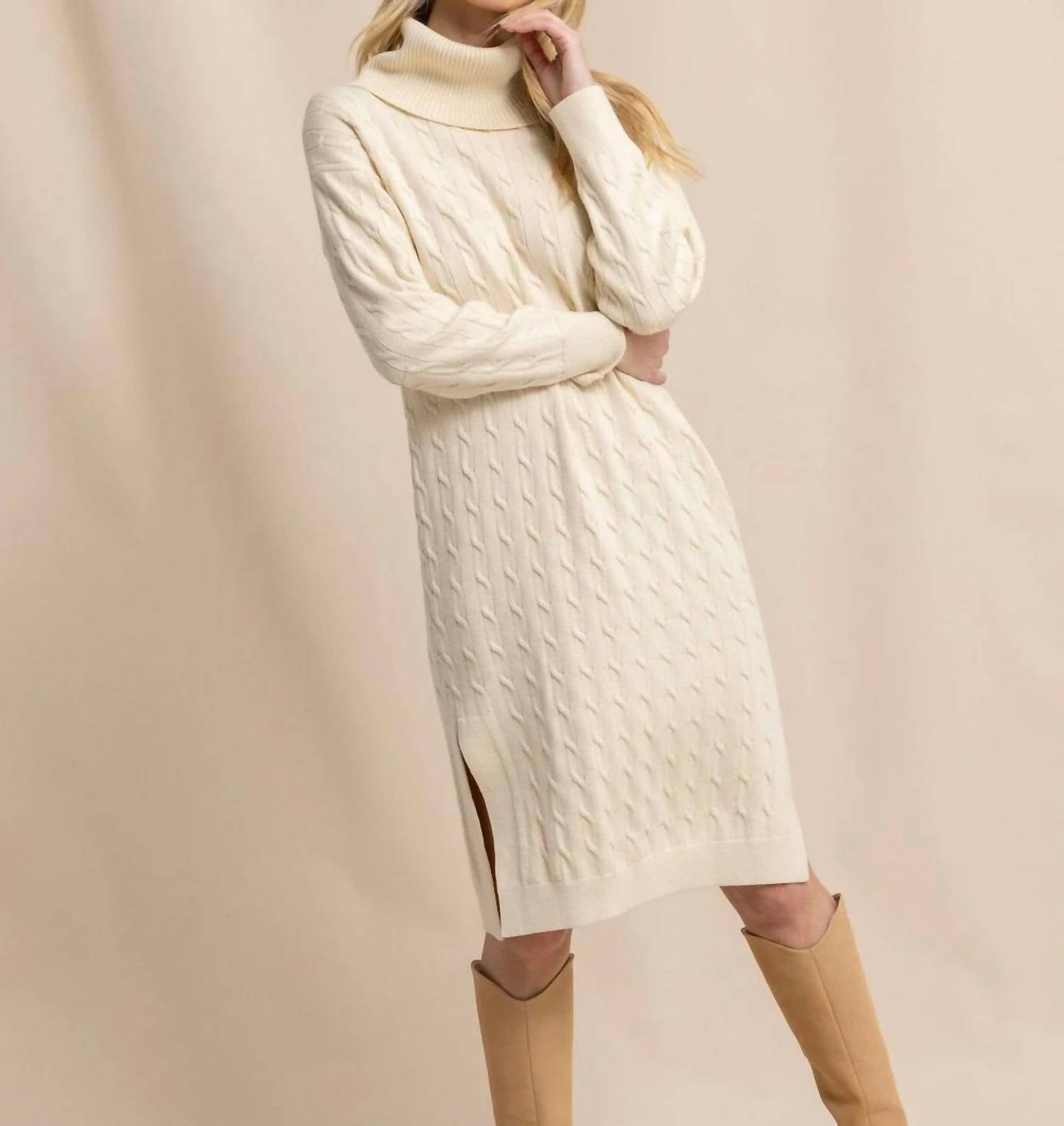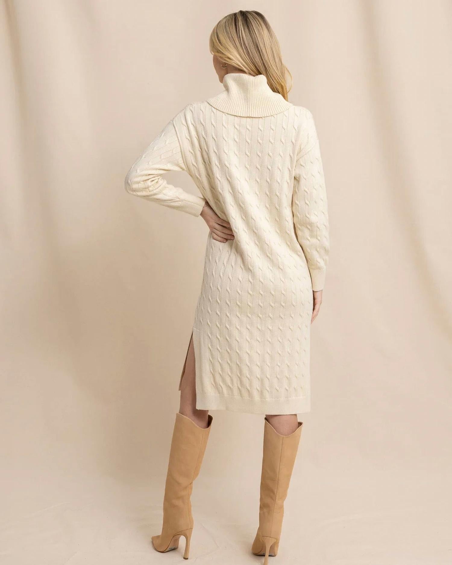 The pefect long sleeve dress for those cooler months. The Brea Sweater Dress by Southern Tide is an effortlessly chic choice for chilly days. With its long sleeves and relaxed turtleneck, this midi-length dress in Sand White offers both sophistication and comfort. Crafted from a luxurious blend of 95% cotton and 5% cashmere, it features a drop shoulder, ribbed hem and cuffs, and side slits for added style. Measuring 40.5 inches in length, this pull-on sheath silhouette makes a polished statement in your wardrobe.