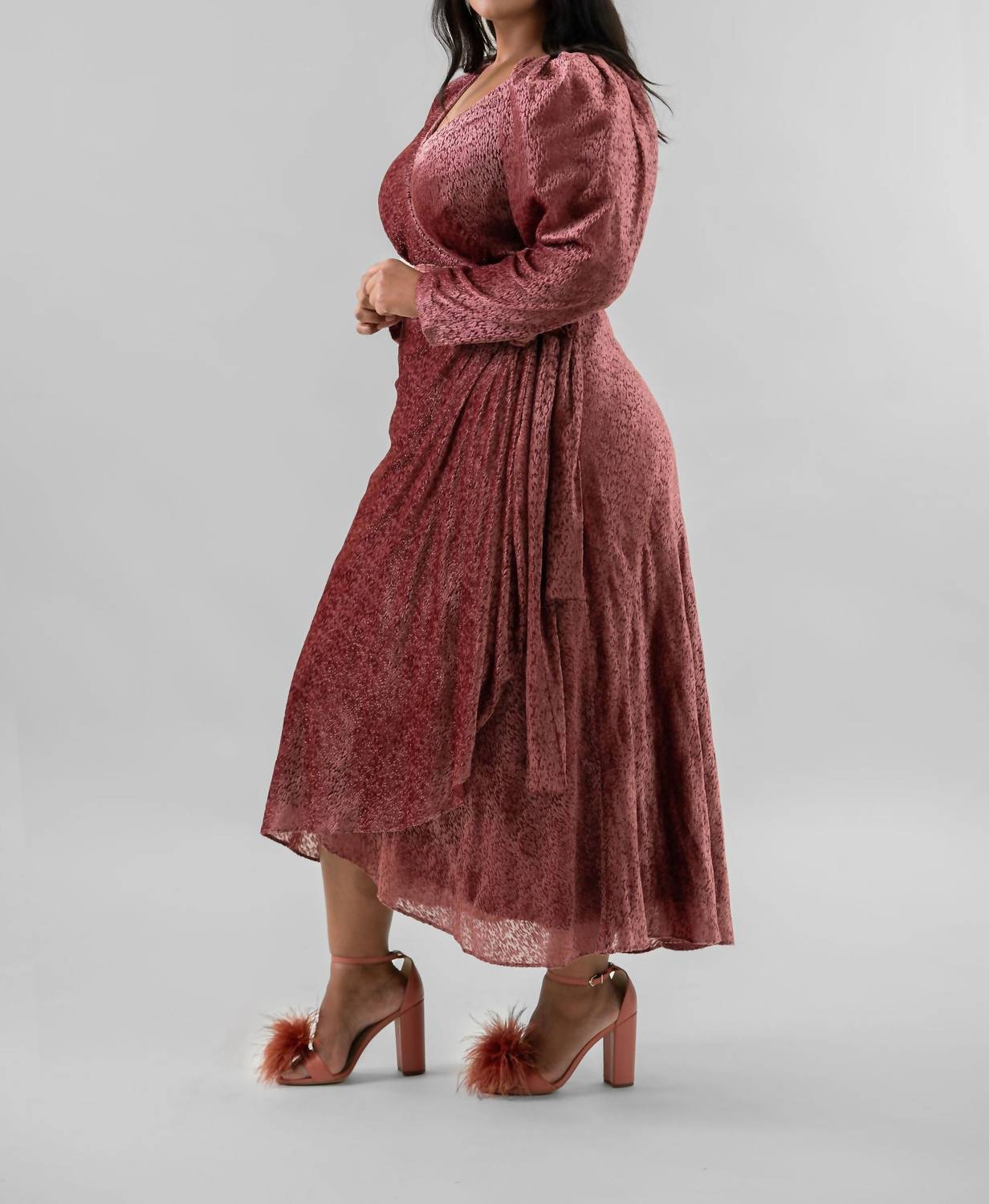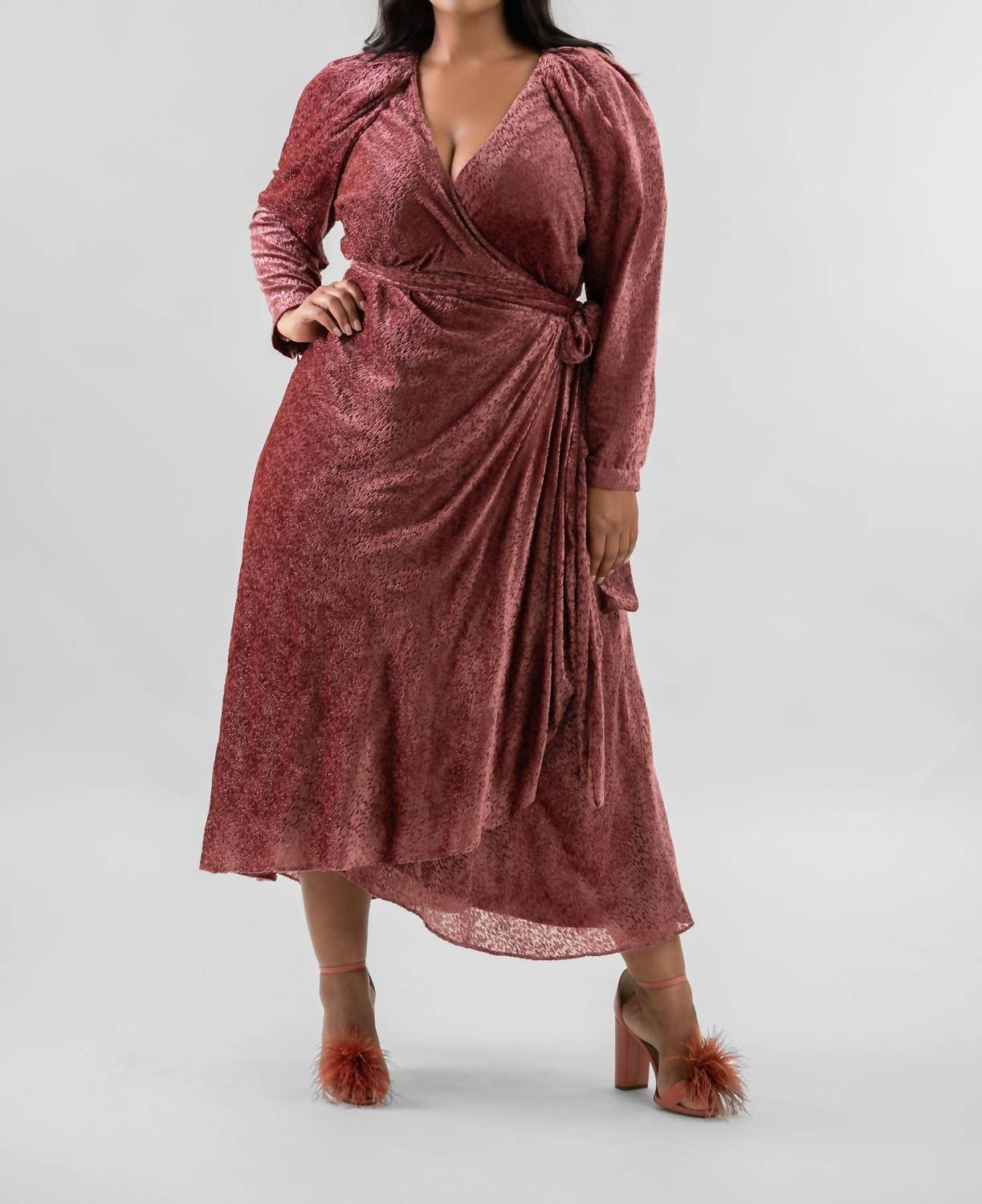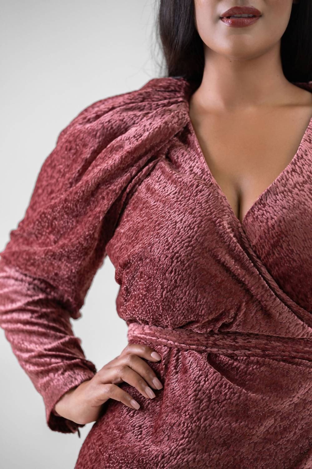 A flattering yet comfortable dress you'll be reaching for season after season. Introducing the Laureen Midi Dress by TANYA TAYLOR, an elegant choice for an evening event, crafted in an abstract dotted velvet. This rose-colored wrap dress features long sleeves and a flattering V-neckline, with a hidden internal button to secure the wrap in place. Closure: Button closure. Ideal for special occasions, its gathered sleeves add a touch of dimension and sophistication, perfect for the quiet luxury trend this Spring.