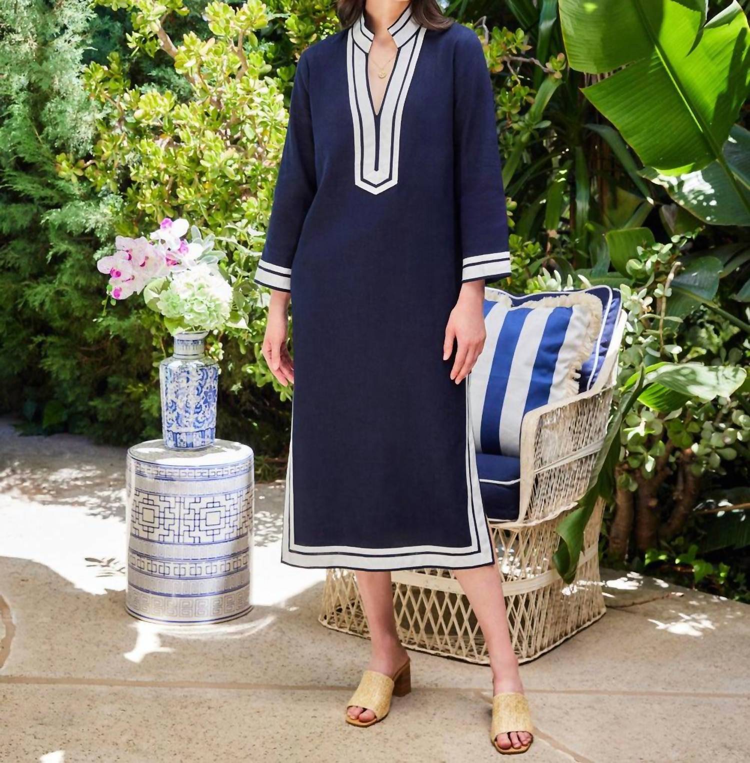 A flattering yet comfortable dress you'll be reaching for season after season. Elevate your spring wardrobe with the Women's St. Tropez Midi Dress by Karen Kane, featuring chic three-quarter sleeves and an elegant navy with off-white design. Crafted from a luxurious 55% linen and 45% viscose blend, this imported shift dress measures 48 5/8 inches in length for size M and is fitted at the bust and waist while relaxed at the hip. The dress showcases a stylish mandarin collar with a split and side slits, complemented by an invisible zipper closure. Care instructions advise hand washing cold and hanging to dry or opting for dry cleaning.