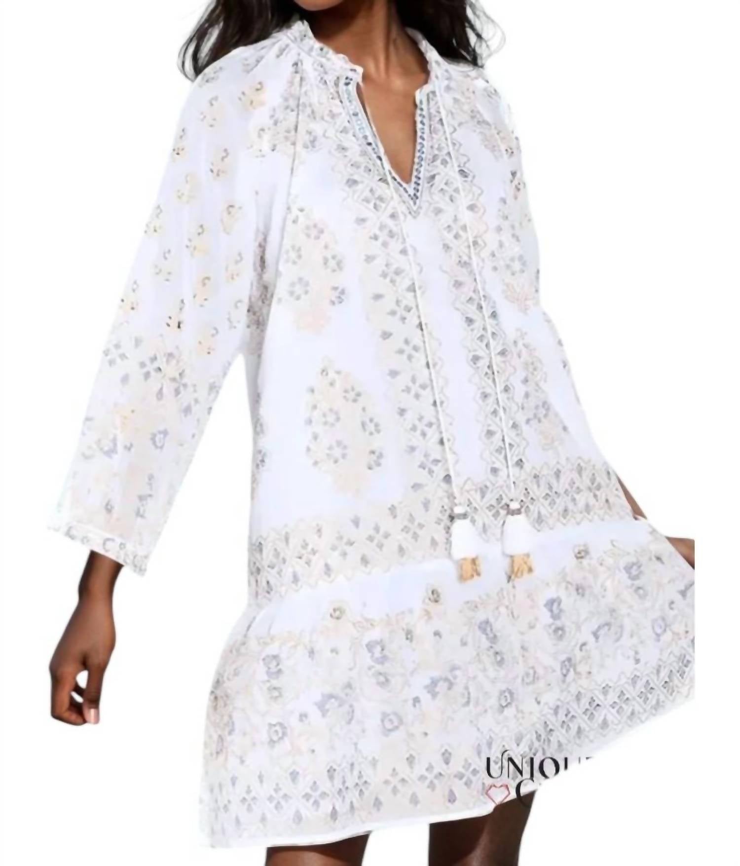 A flattering yet comfortable dress you'll be reaching for season after season. Luxurious white, perfect for exuding sophistication. Long sleeve shift dress. Made from 100% cotton and adorned with stunning details like rich pom pom tassels and a gold print enhanced by Mediterranean blue accents. Offering a seamless pull-on closure. Crafted in India. Defined by its exclusive V-neckline. Care for this elegant piece by hand washing and avoid dry cleaning to maintain its exquisite design.