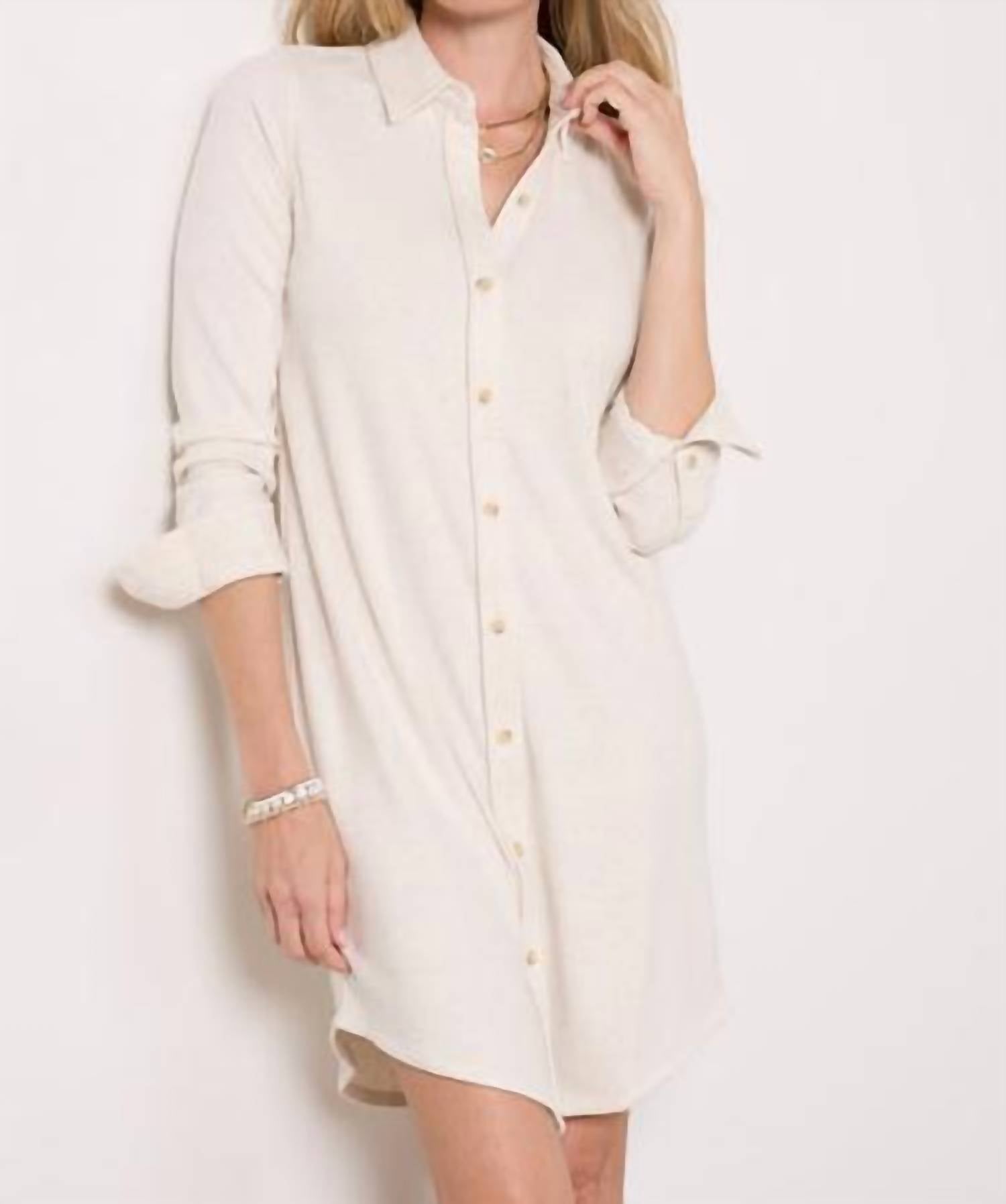 A flattering yet comfortable dress you'll be reaching for season after season. Elevate your wardrobe with the Faherty Legend Sweater Dress, available exclusively in off-white for a soft and polished look. This long-sleeve shirt dress features a spread collar, button front, and shirttail hem, while the fabric blend of 65% REPREVE® Recycled Polyester, 30% LENZING™ ECOVERO™ Viscose, and 5% Elastane ensures ultimate comfort. With a length of 36.5 inches, it boasts a slim fit through the chest and a relaxed sweep, ideal for a cozy yet chic style. Care is simple with machine wash cold, gentle cycle and tumble dry low. The model Zoe stands 5’10 and wears a size small.