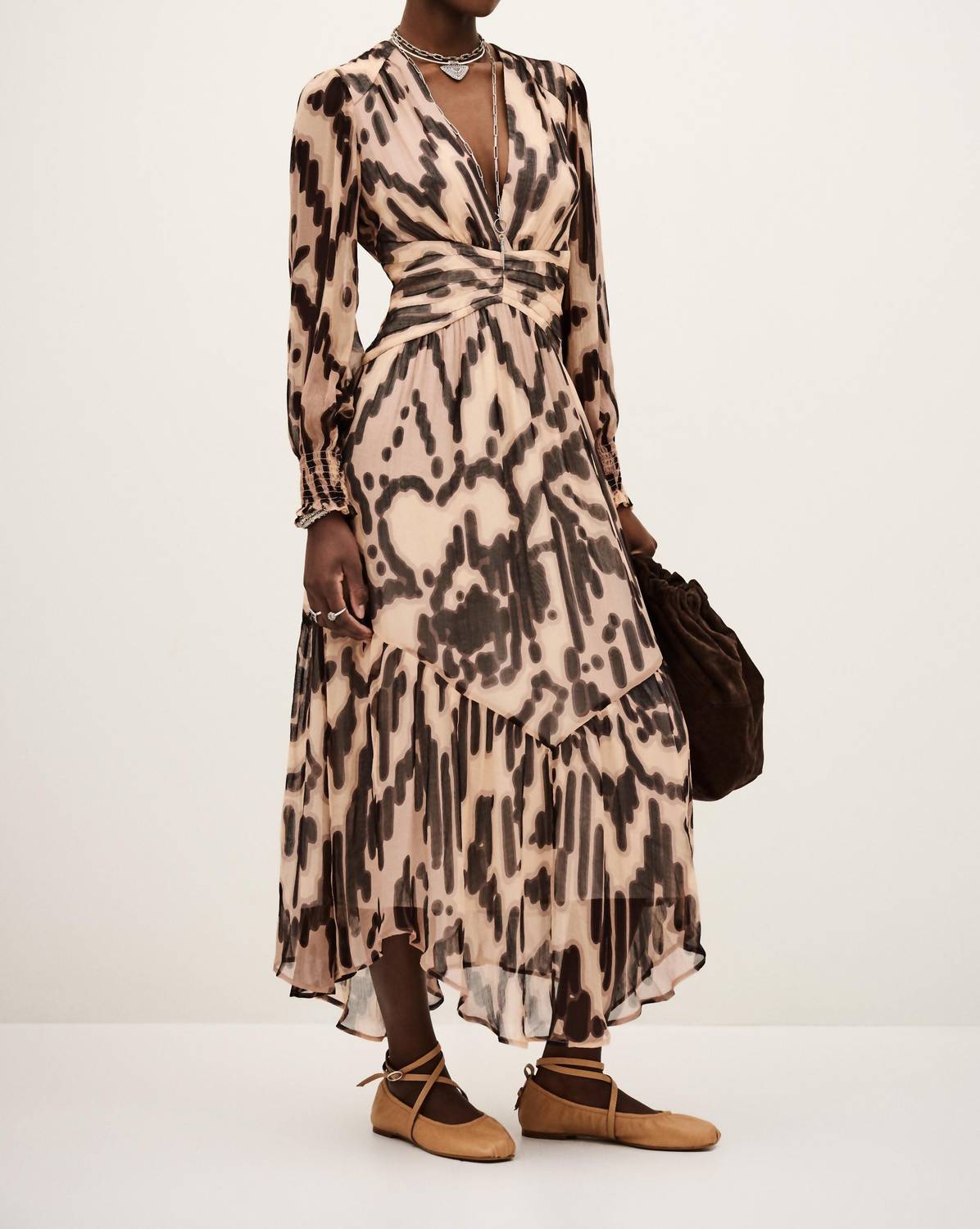 The pefect long sleeve dress for those cooler months. Introducing the Amor Midaxi Dress by ba&sh, a romantic addition to any wardrobe with its rose-hued patterned design. This wrap silhouette features long sleeves with smocked cuffs and a flattering V-neckline, enhanced by an asymmetrical tiered skirt that exudes effortless grace. Made entirely from sustainably sourced viscose, it offers a comfortable smocked back and a defining corset-style belt. Closure: Pull-on. Care: Dry clean only.