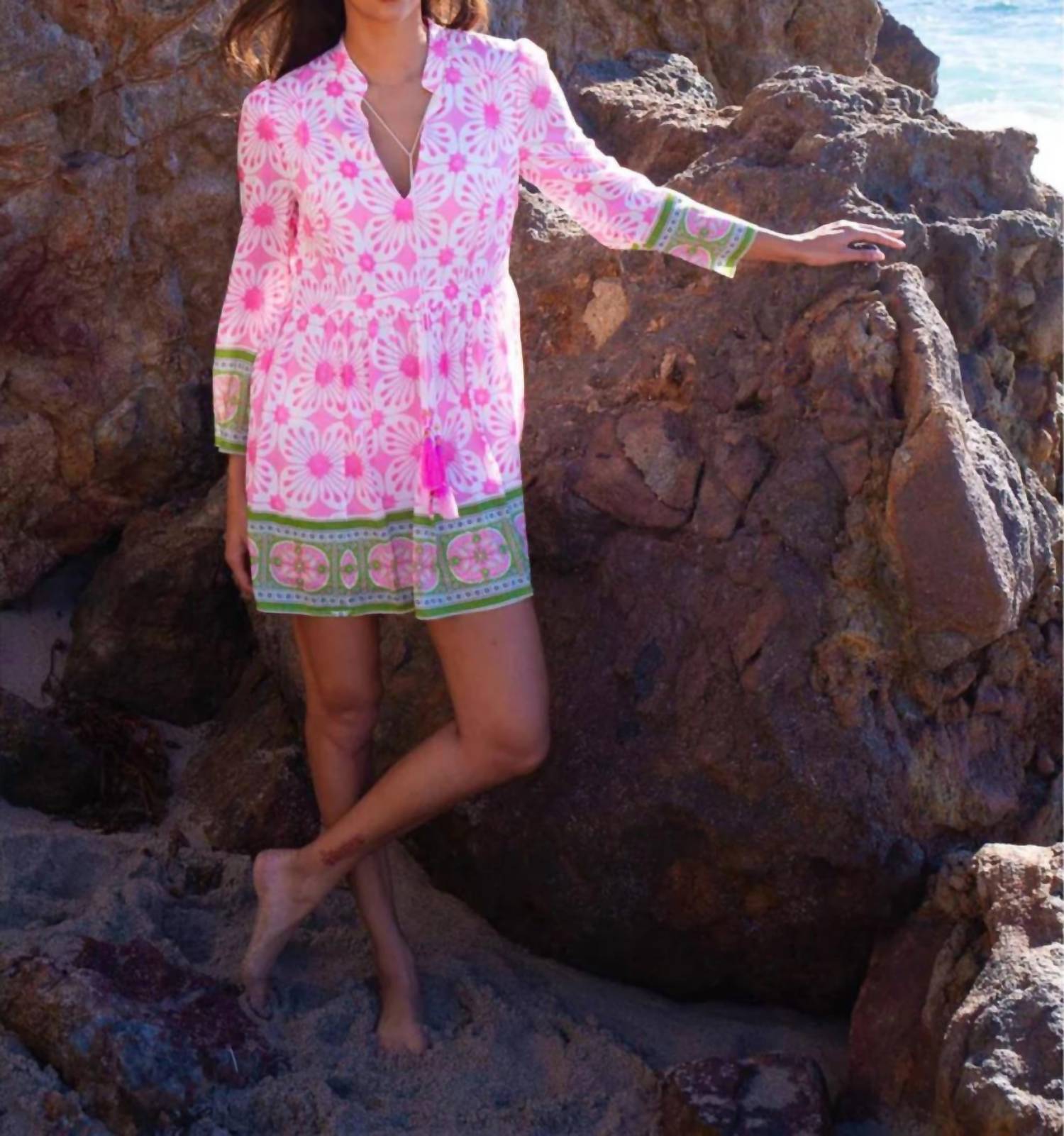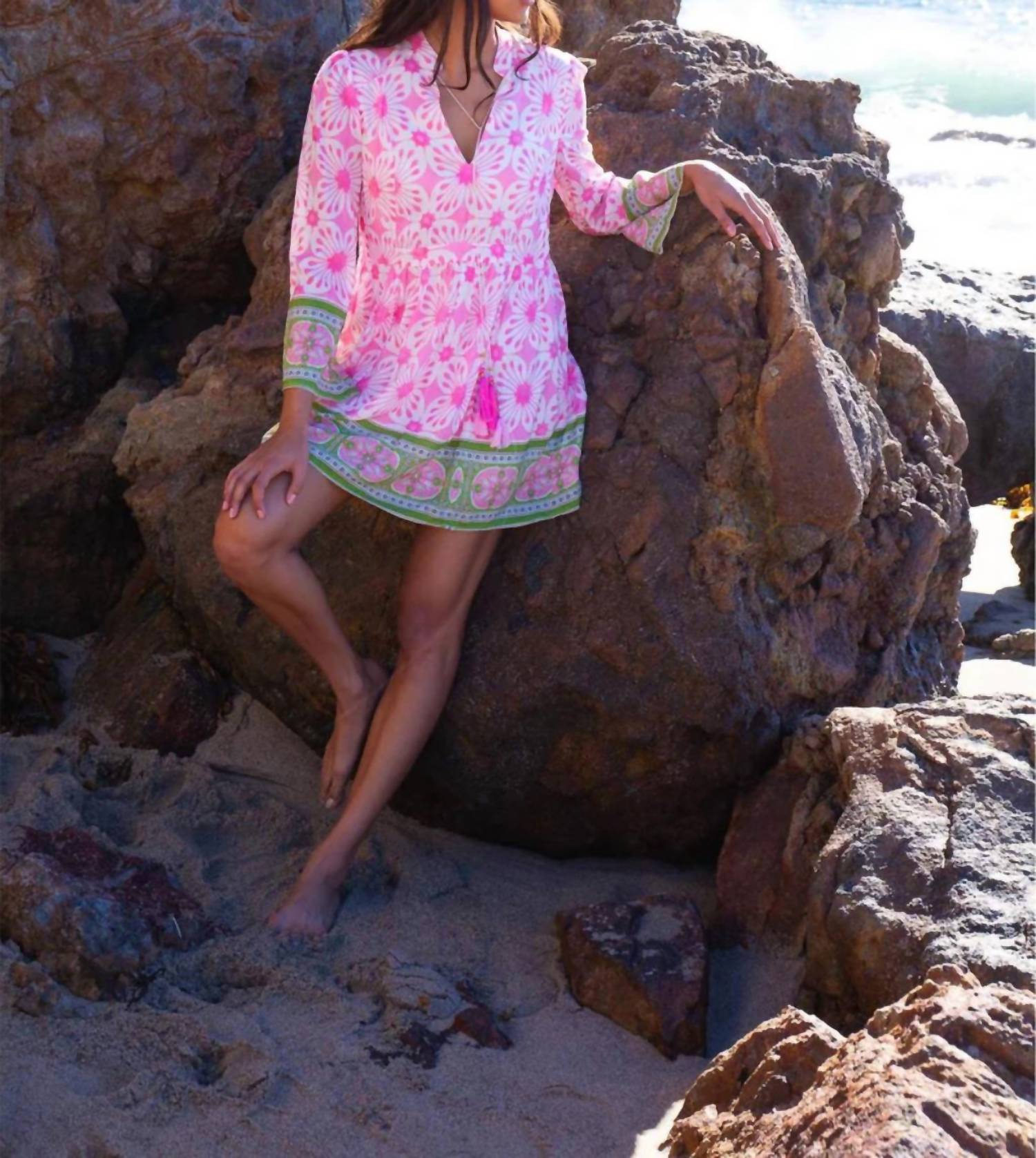 The pefect long sleeve dress for those cooler months. Introducing the Rose Mini Dress by BELL, a boho chic piece perfect for your summer wardrobe in a delightful pink and green floral print. This flowing shift dress features three-quarter sleeves and a v-neckline with a tassel tie detail. Made from 100% rayon, the dress offers a buttery soft feel and a contrast cuff and hem for added style. Closure: Pull on. Care: Machine wash. Ideal for Easter or vacation getaways.