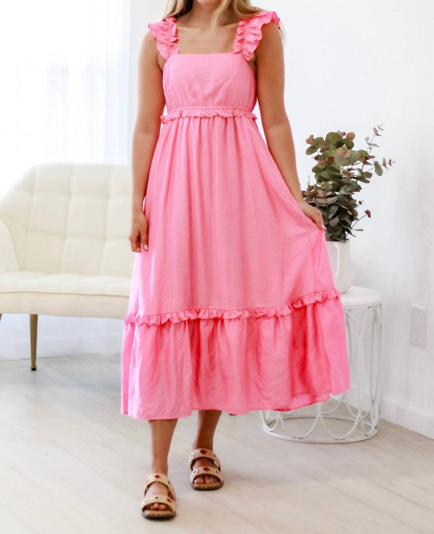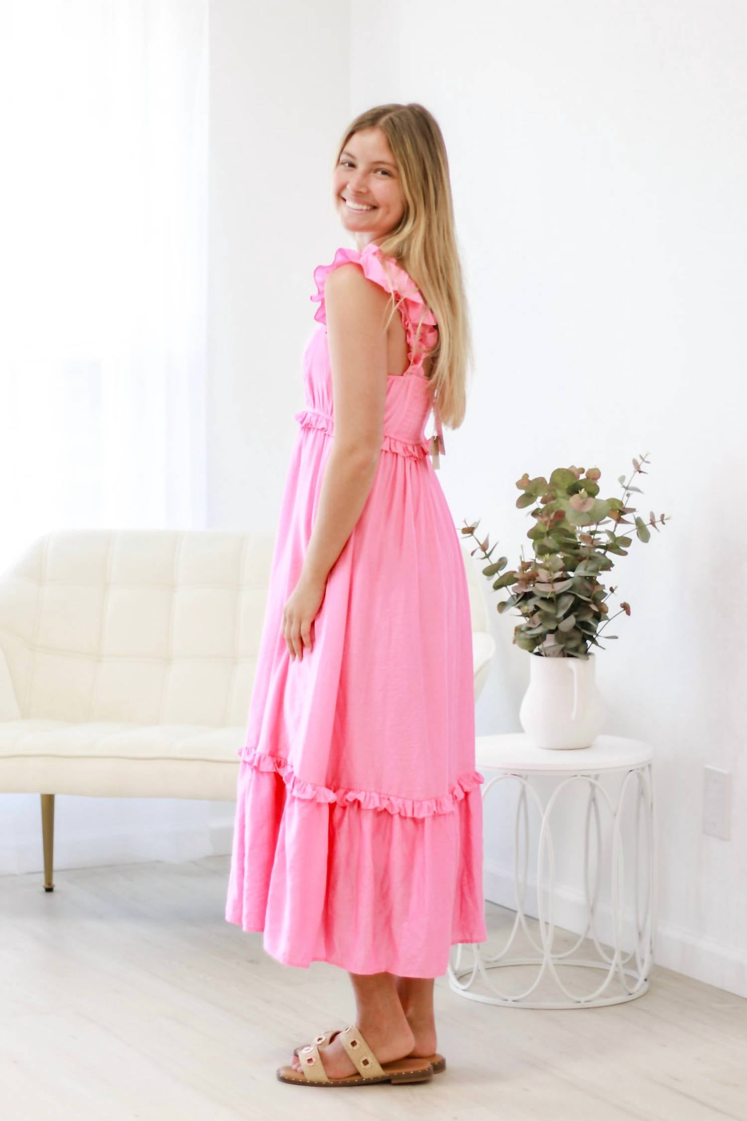 A flattering yet comfortable dress you'll be reaching for season after season. Elevate your summer wardrobe with the Ruffle Maxi Dress by Blu Pepper, an A-line silhouette in a vibrant hot pink perfect for sunny days. Featuring sleeveless ruffle strap details and a square neckline, this dress ensures a playful yet chic look. Crafted with a shell composition of 80% Rayon and 20% Nylon, and a lining of 100% Polyester, it includes back smocking and a delightful ruffle waist trim and hem. Care is made easy with machine wash instructions, keeping your style worry-free and fresh all season long.