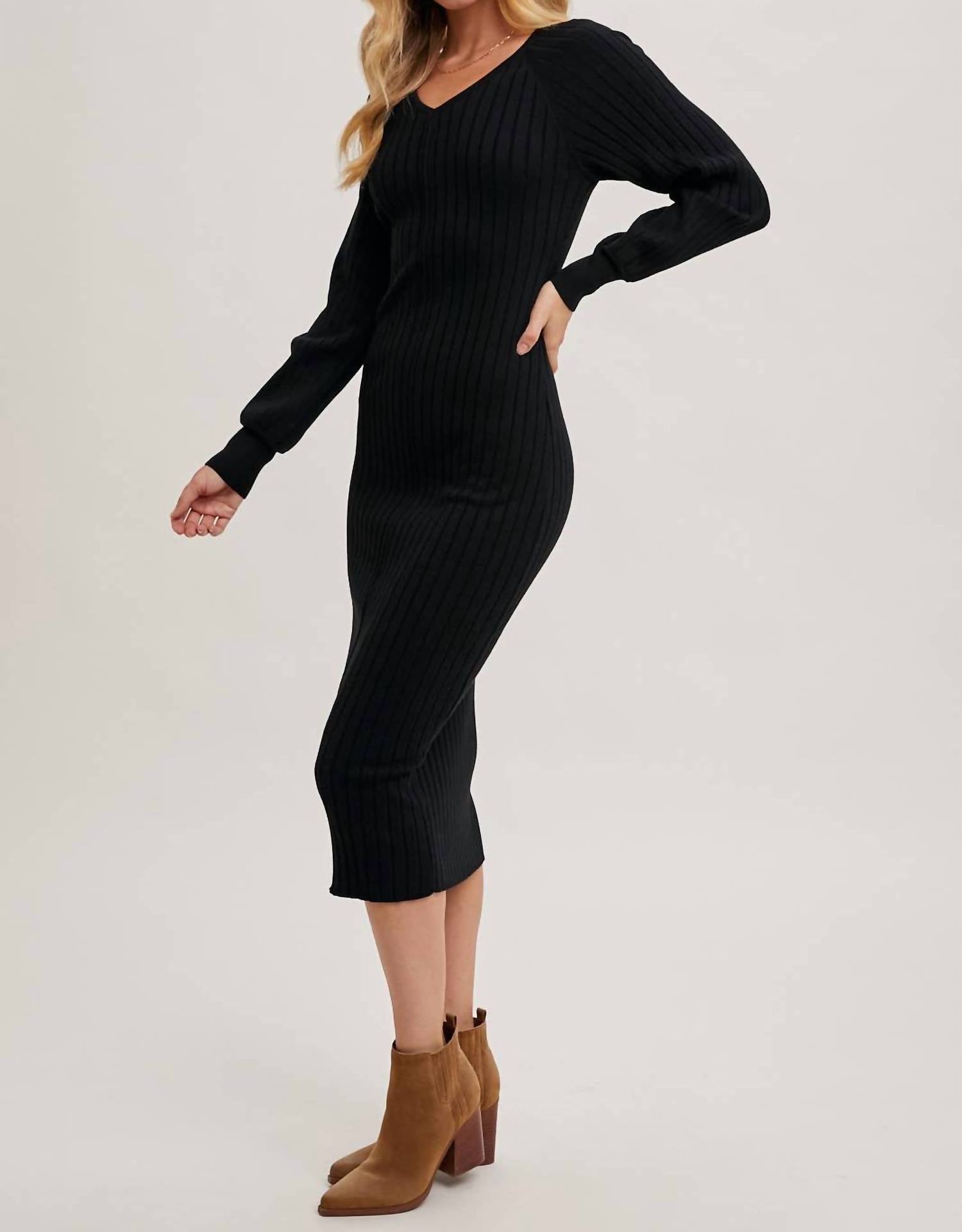 The pefect long sleeve dress for those cooler months. The Women's V Neck Ribbed Knit Sweater Midi Dress by BluIvy in classic black is a stylish addition to any wardrobe. Featuring long sleeves and a flattering V-neckline, this dress is designed to highlight natural curves with its ribbed knit texture. Crafted with a bodycon silhouette that hits at a sophisticated midi length, it offers both warmth and elegance for cooler seasons. Closure Type: Pull On.