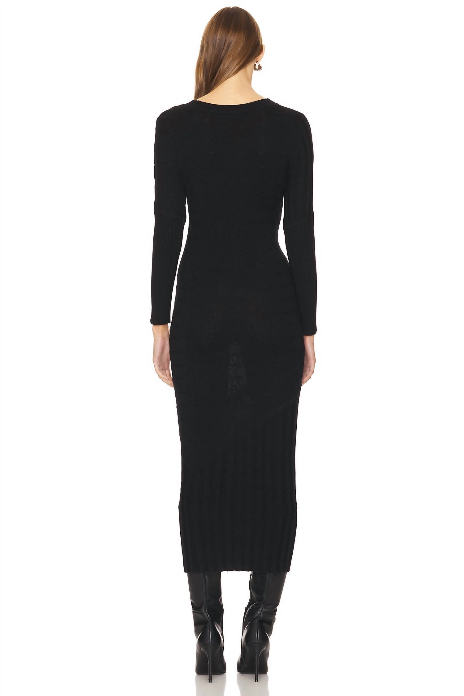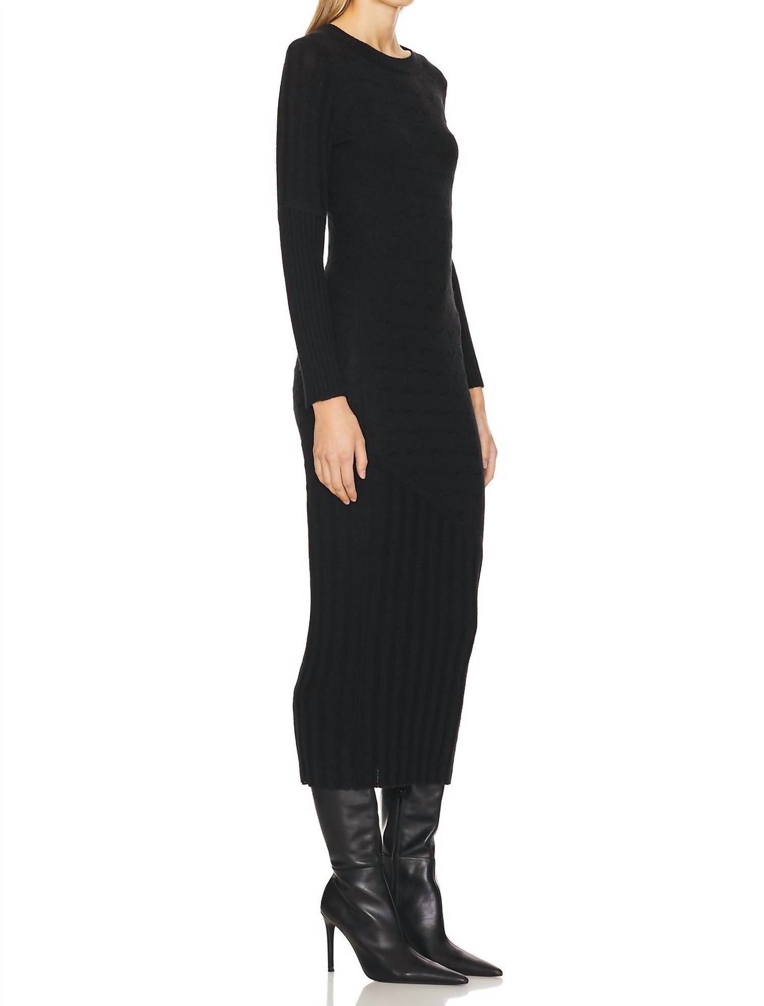 Cute and comfortable, this long sleeve dress has it all. Introducing the Constance Cable Maxi Long Sleeve Dress by Central Park West, a refined addition to your winter wardrobe in classic black. This bodycon dress showcases long sleeves and a crewneck, enveloped in a textured cable knit for elegant evening events. Made with a composition of 60% acrylic and 40% nylon, this 50.40" full-length garment is expertly crafted in China with ribbed trim. Closure: Pull-on style. For care, hand wash and lay flat to dry for best results.